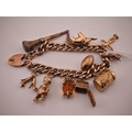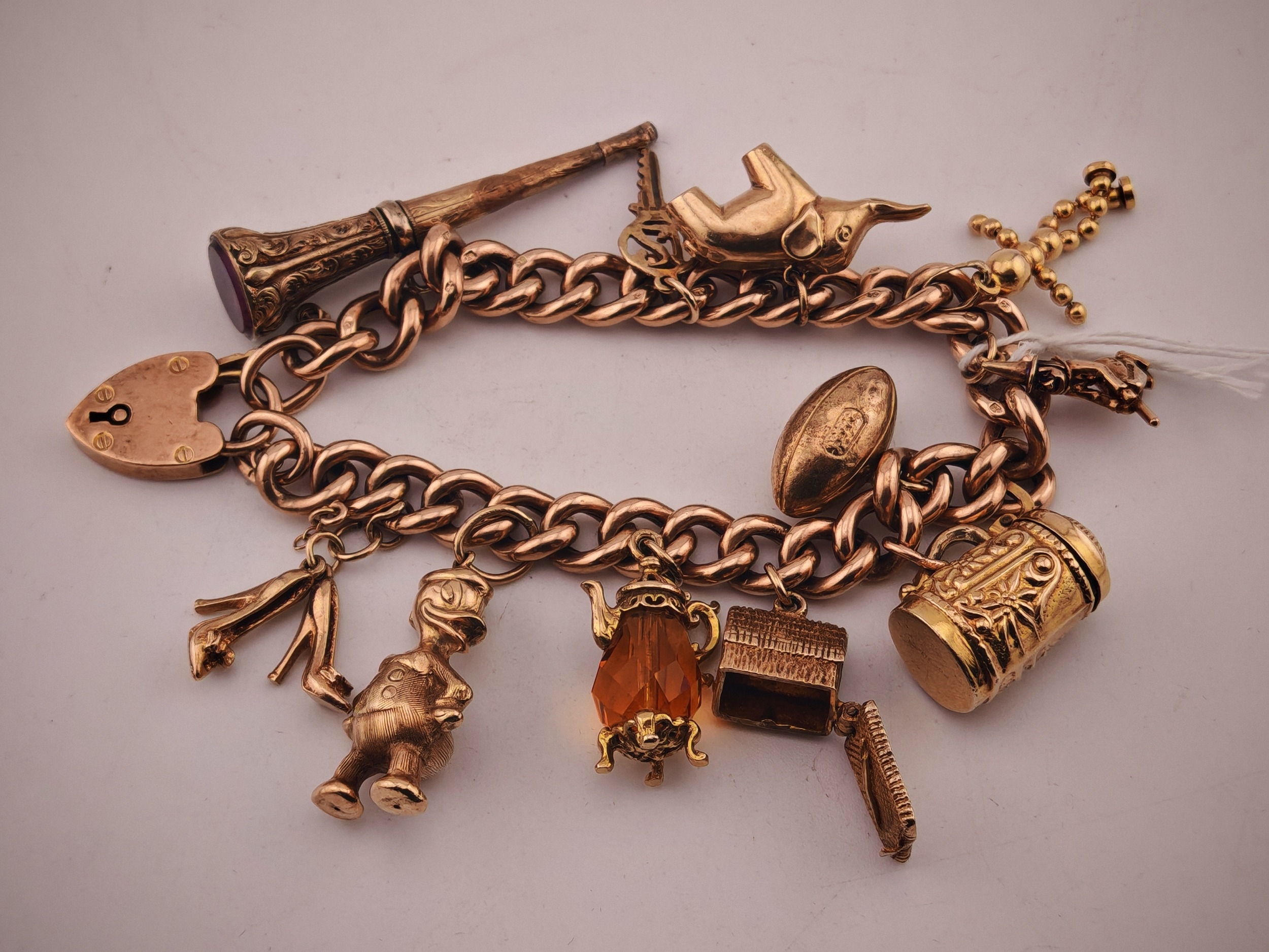 Ladies 9ct Gold Charm bracelet with assorted charms to include Daffy Duck, Beer Stein, Propelling Pencil etc. 47g total weight