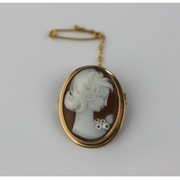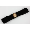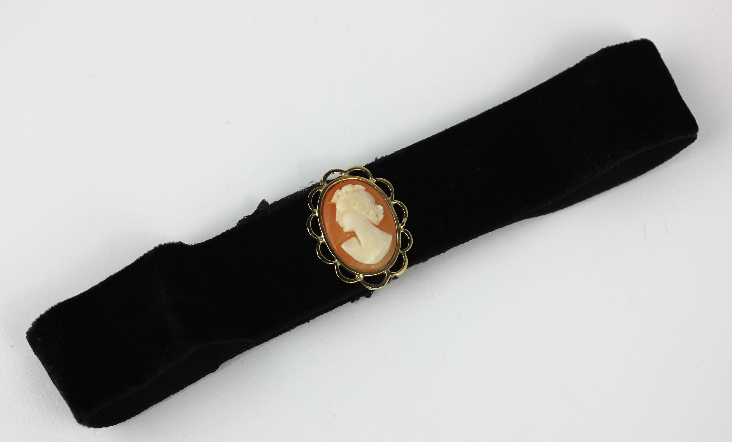 A 9ct gold mounted oval shell cameo ribbon slide carved as the portrait of a lady within a pierced surround, fitted to a black ribbon velvet choker