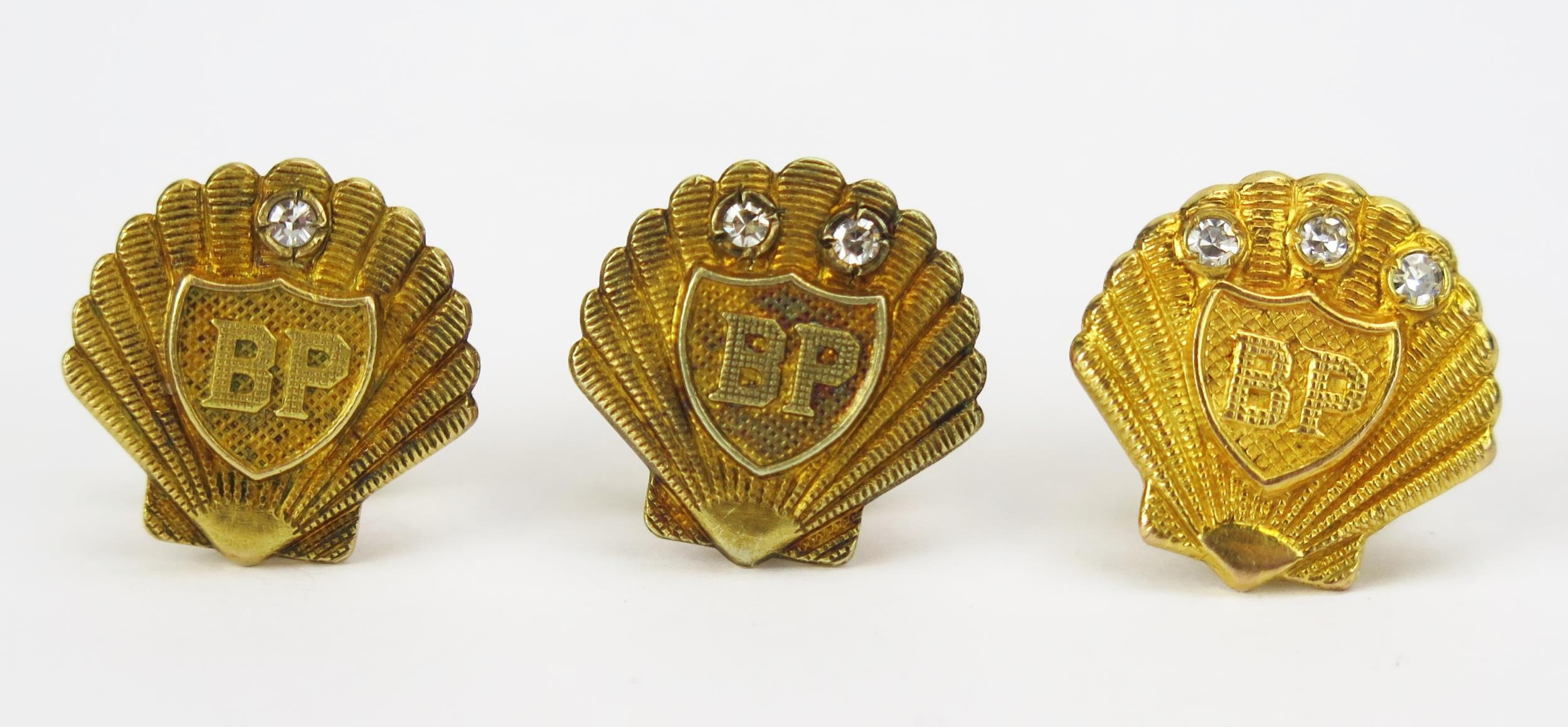 A Set of Three BP 9ct Gold and Diamond Service Badges for 5, 10 and 15 years, hallmarked and screw backs stamped, 14.43g