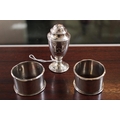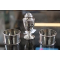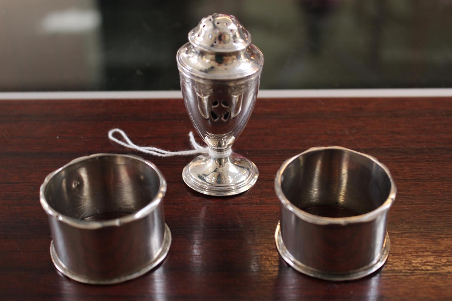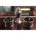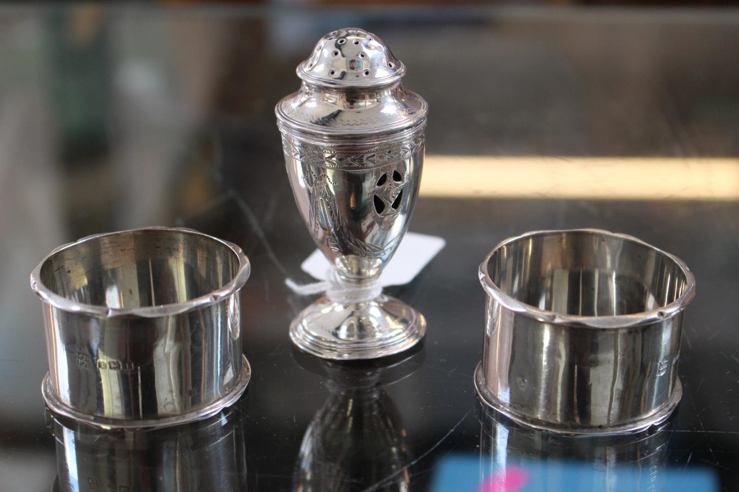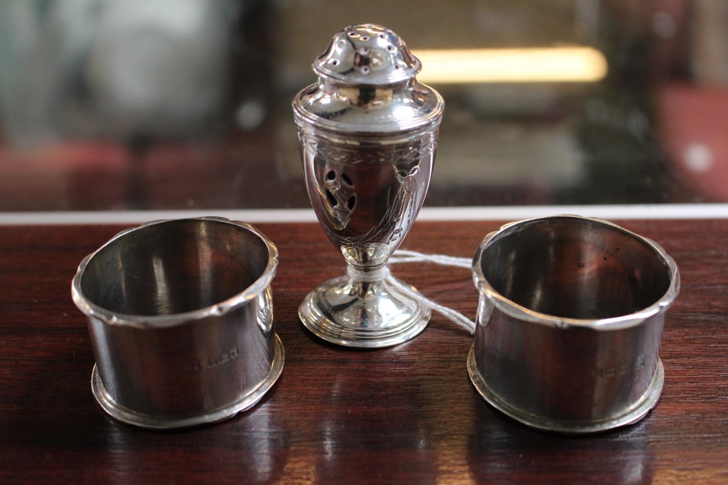 Small George III urn shaped Pepperette London 1786 marked RH and a Pair of Silver Napkin rings Birmingham 1918 by Jones Deakin & Son