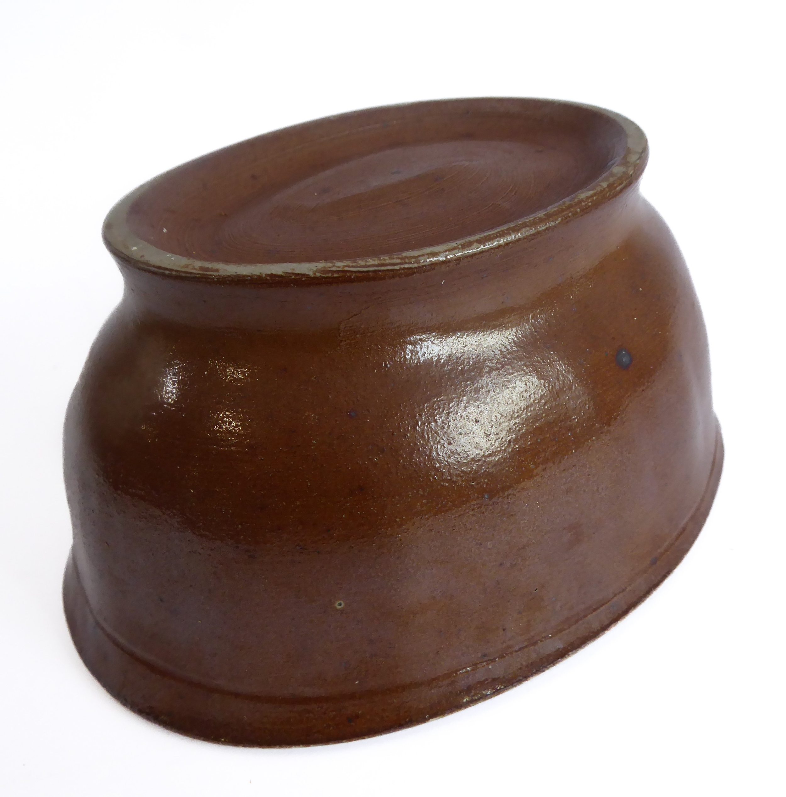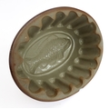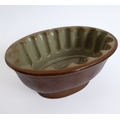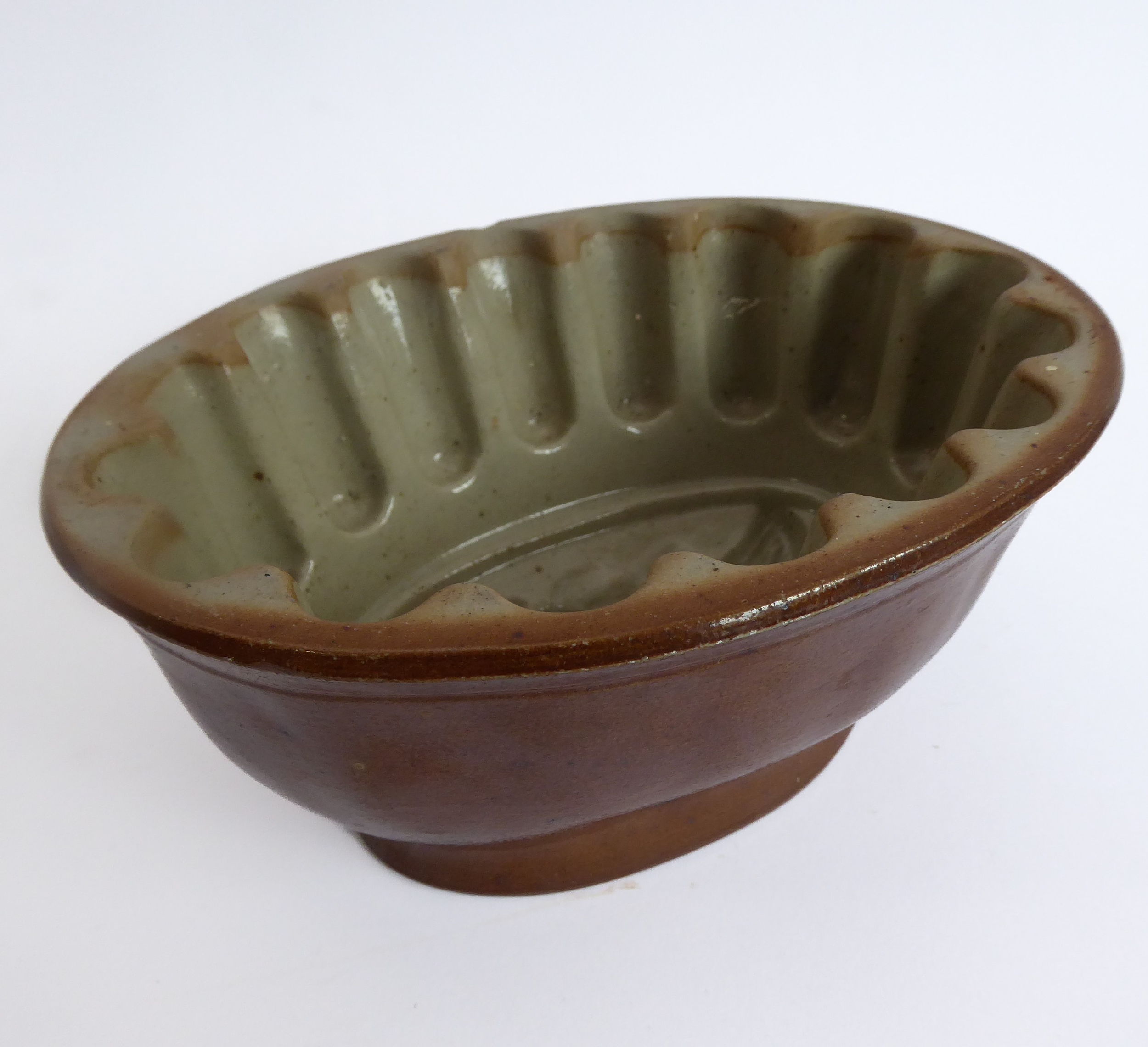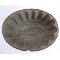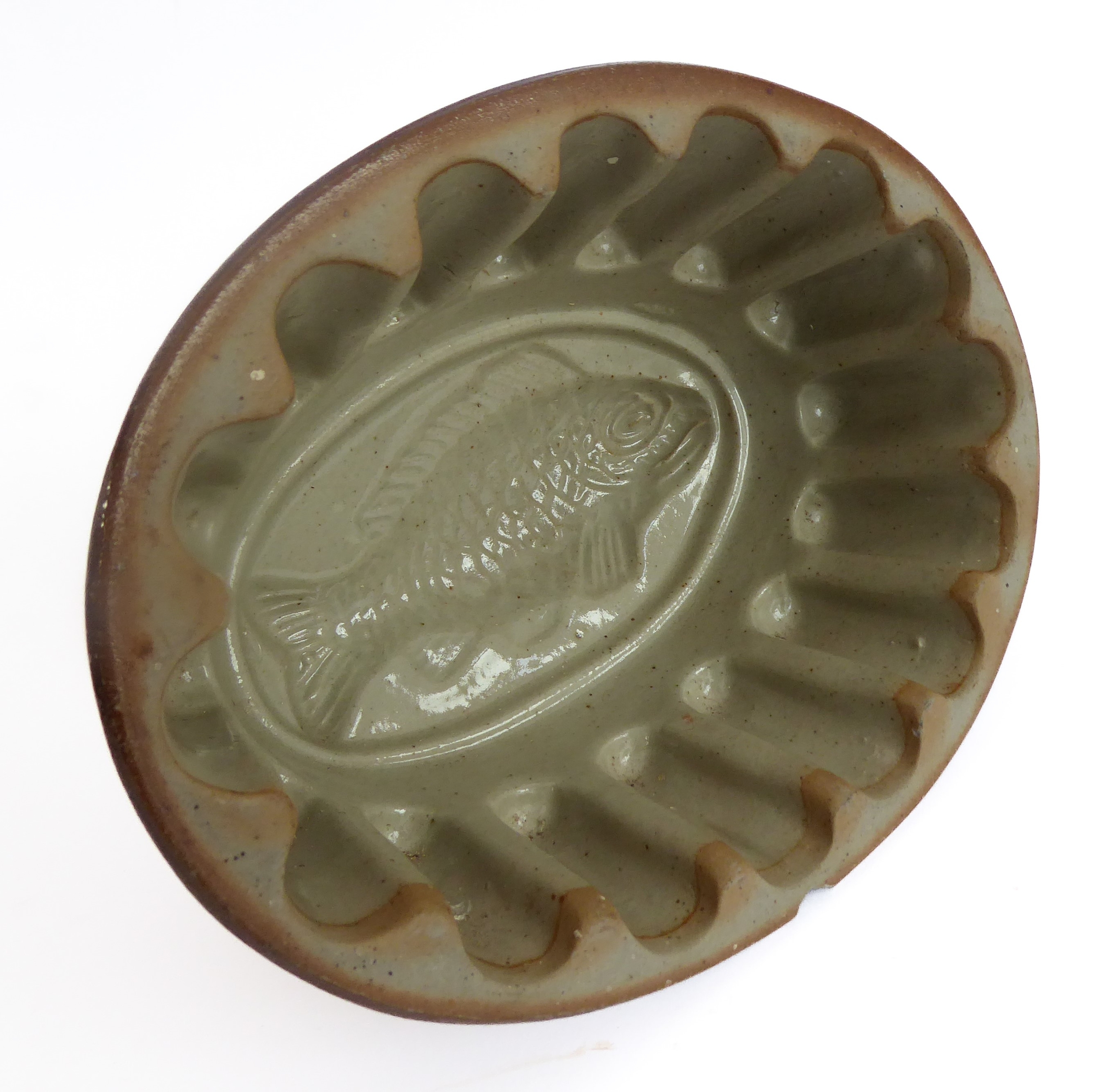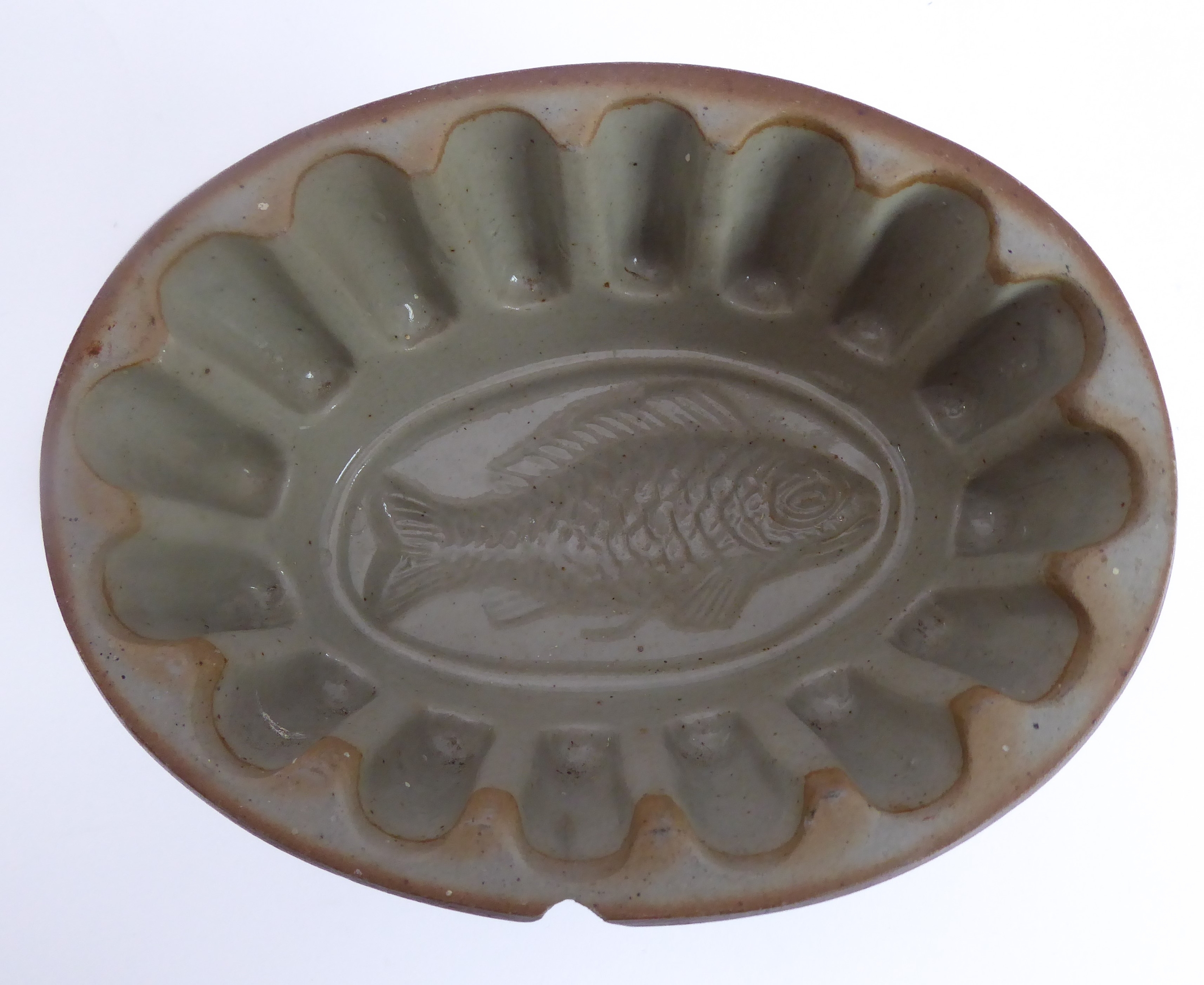 An oval 19th century salt-glazed jelly mould, the base impressed with a fish design (thumbnail-sized chip to outside of rim) (19cm wide x 9cm high)