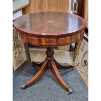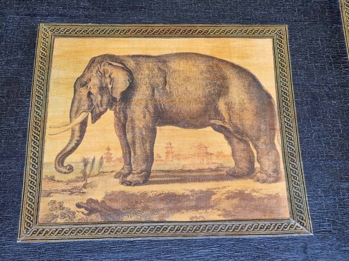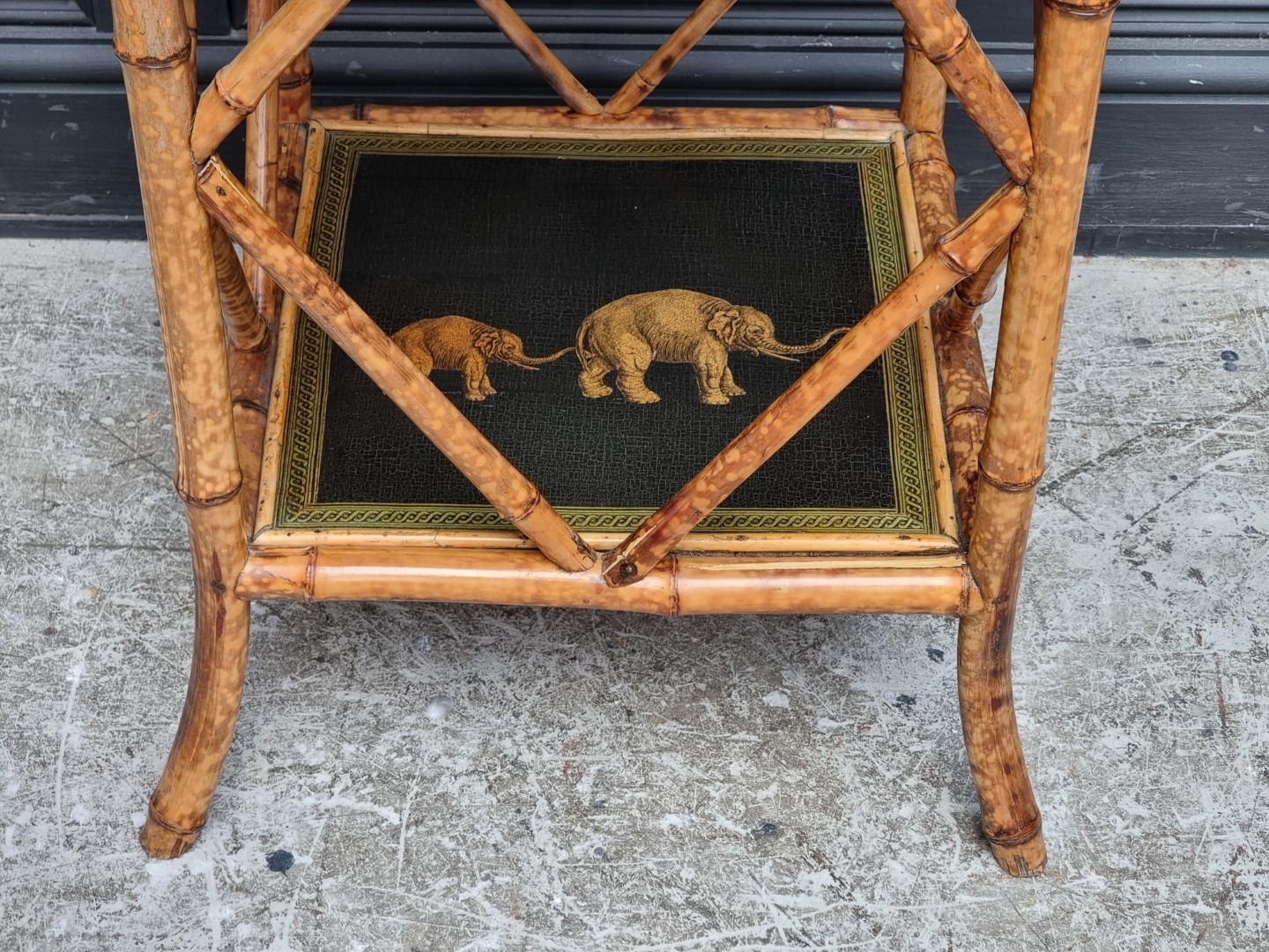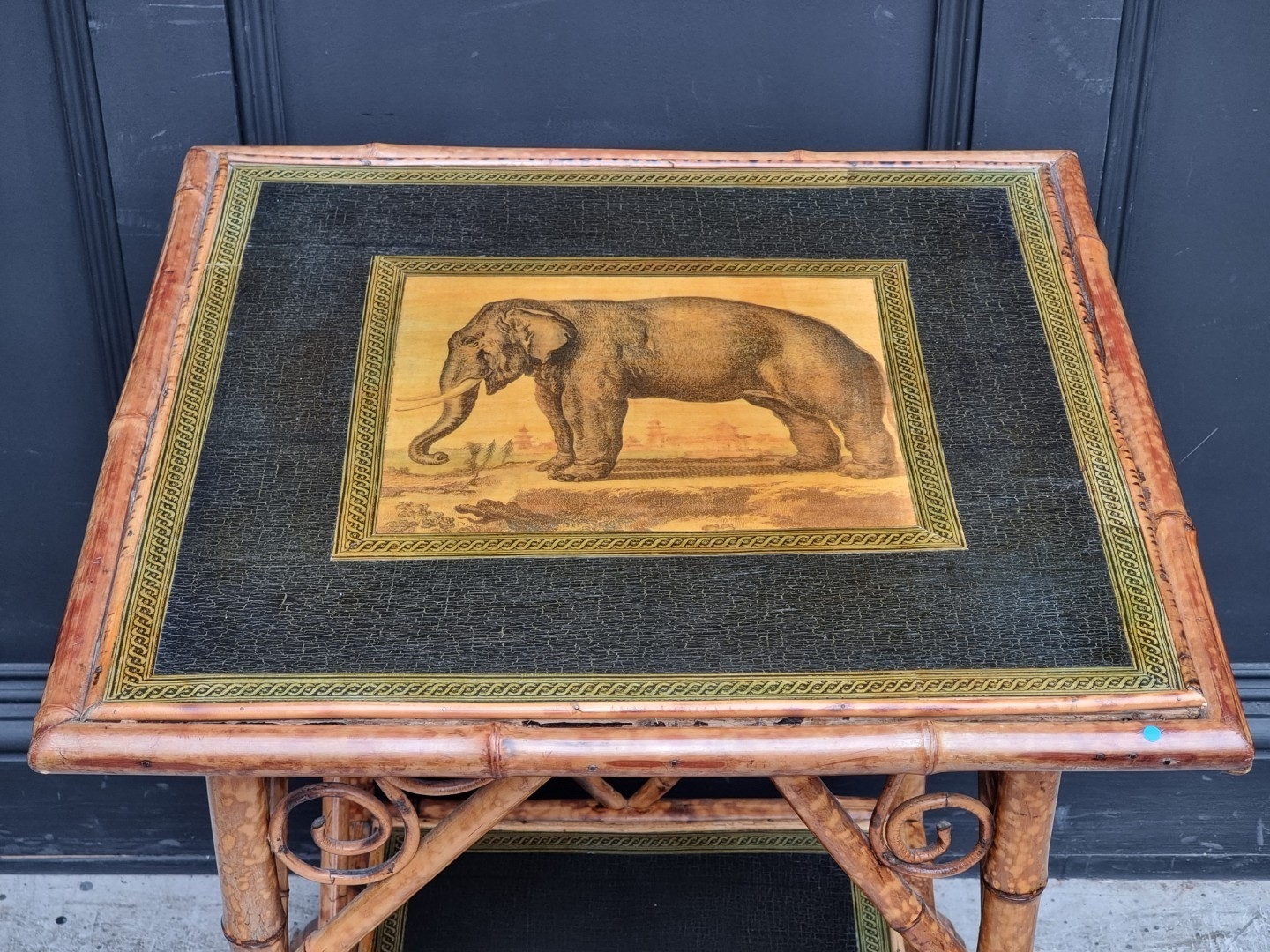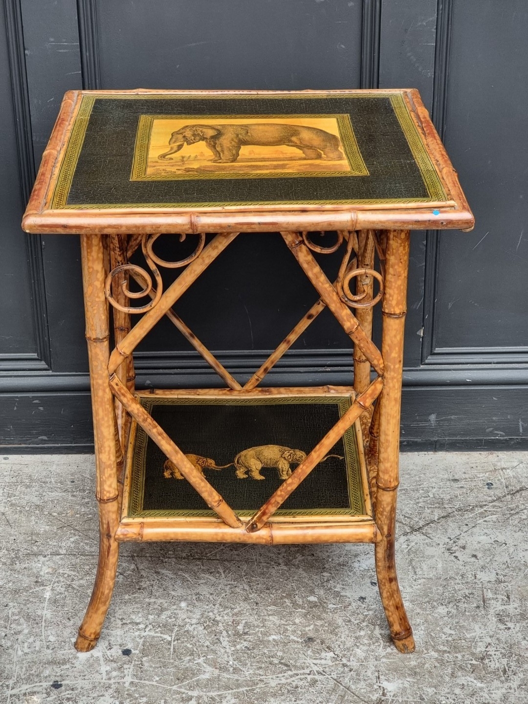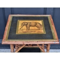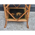 A bamboo two-tier occasional table, with transferred elephant decoration, 58cm wide.