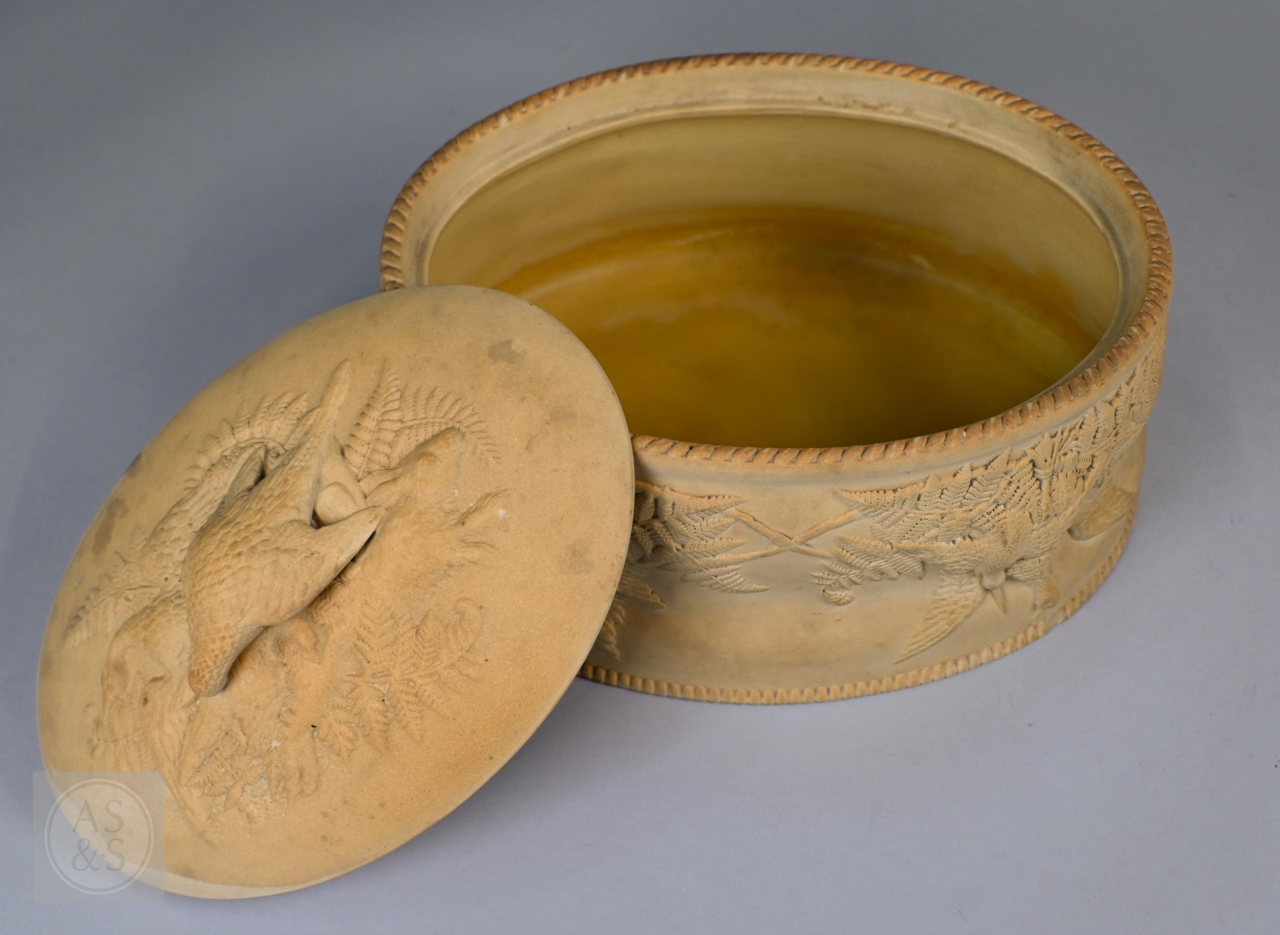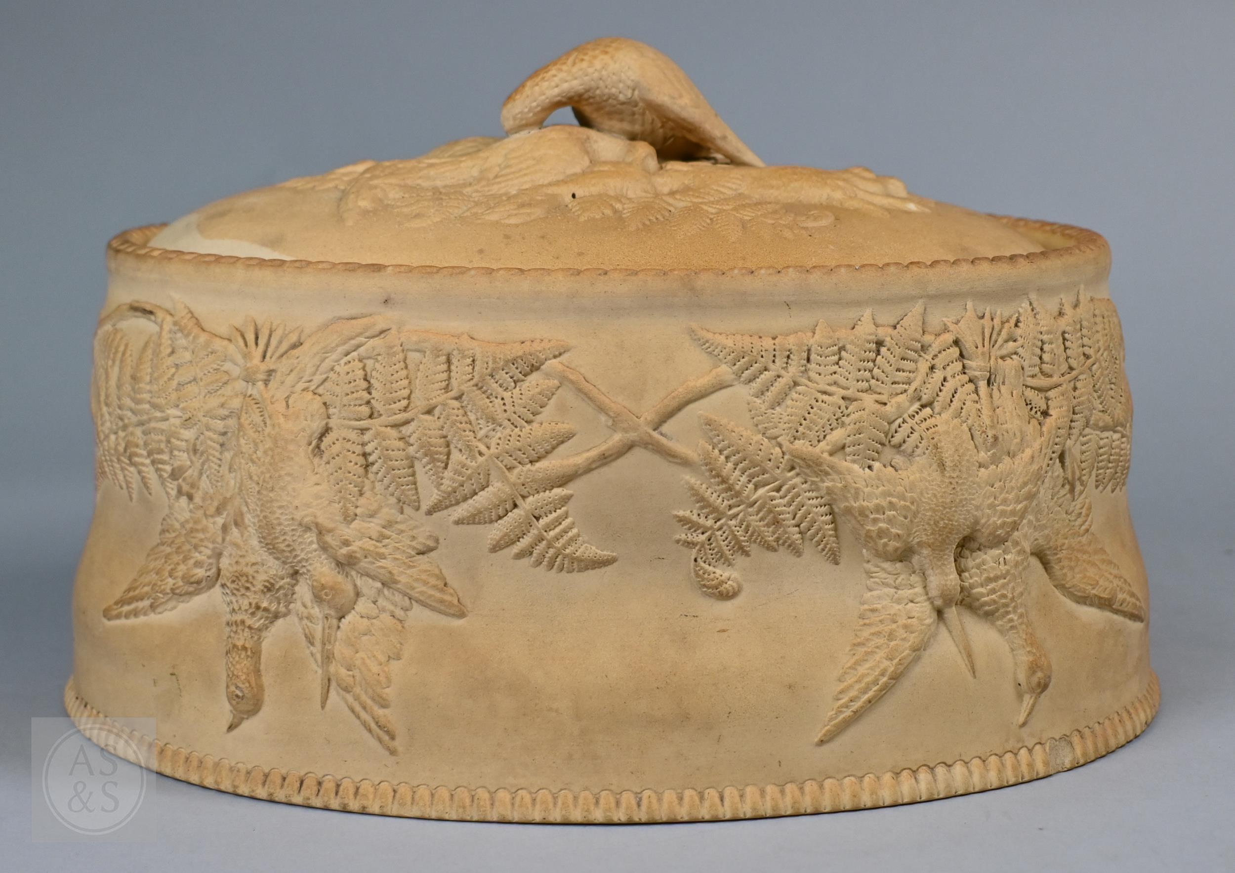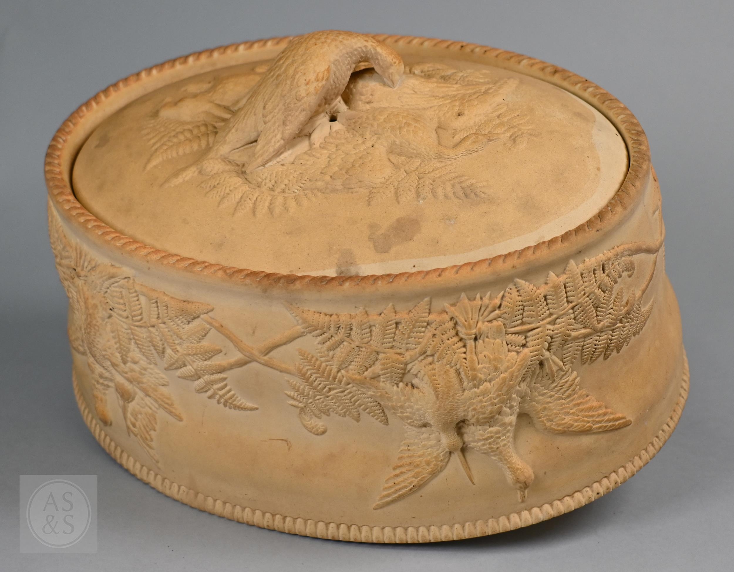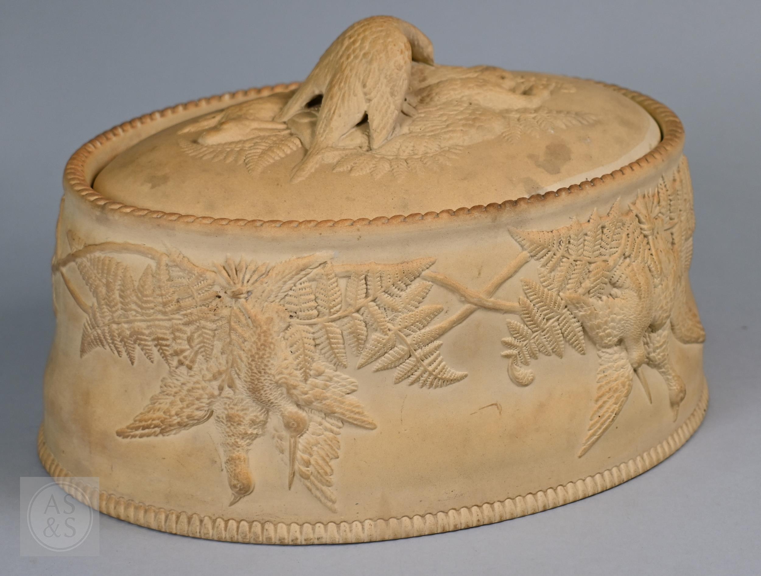 An antique earthenware game pie-dish, with applied decoration of game trophies and ferns, 29 cm long