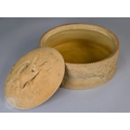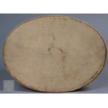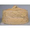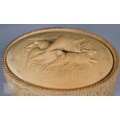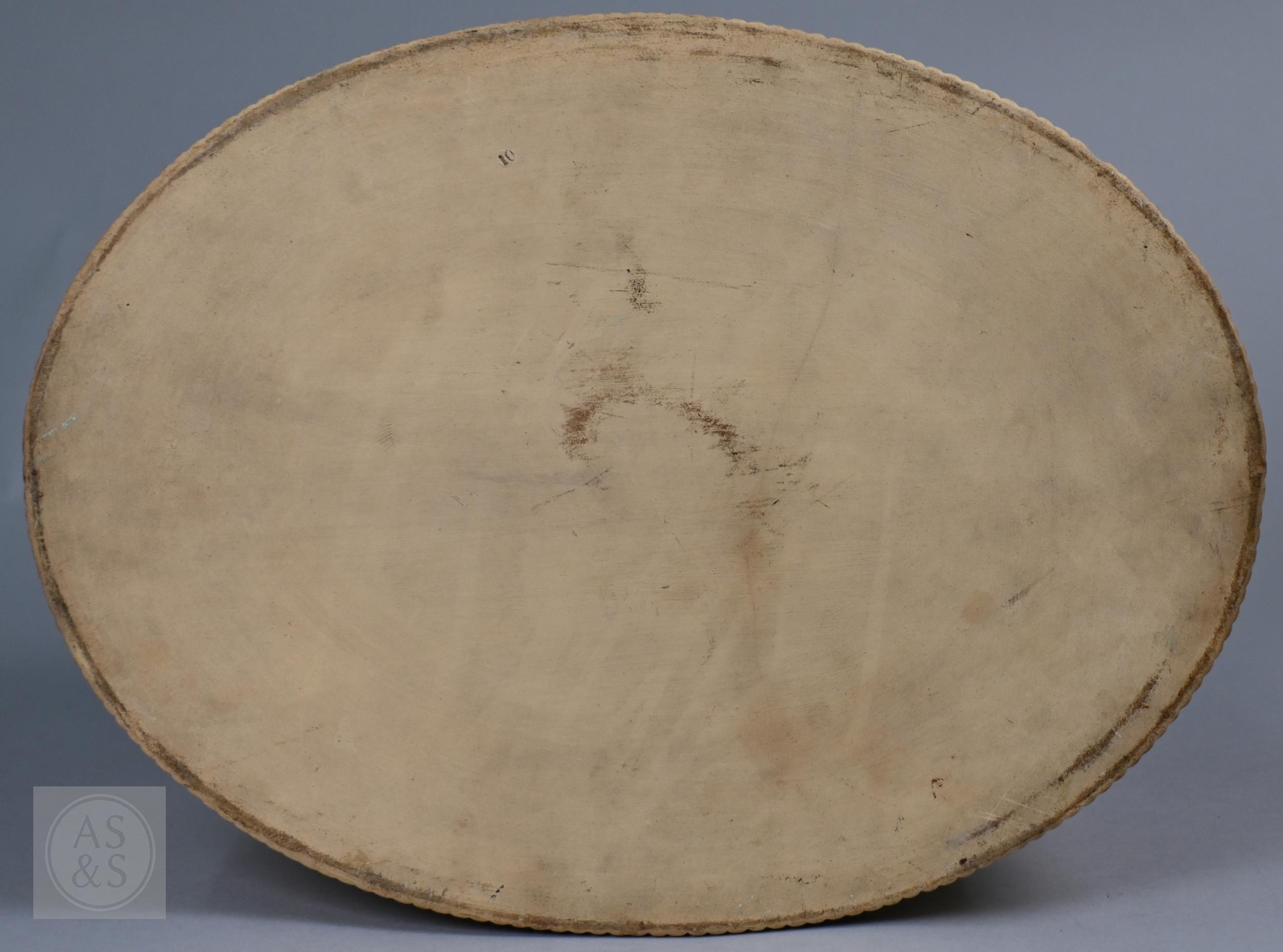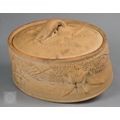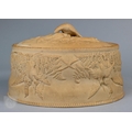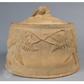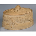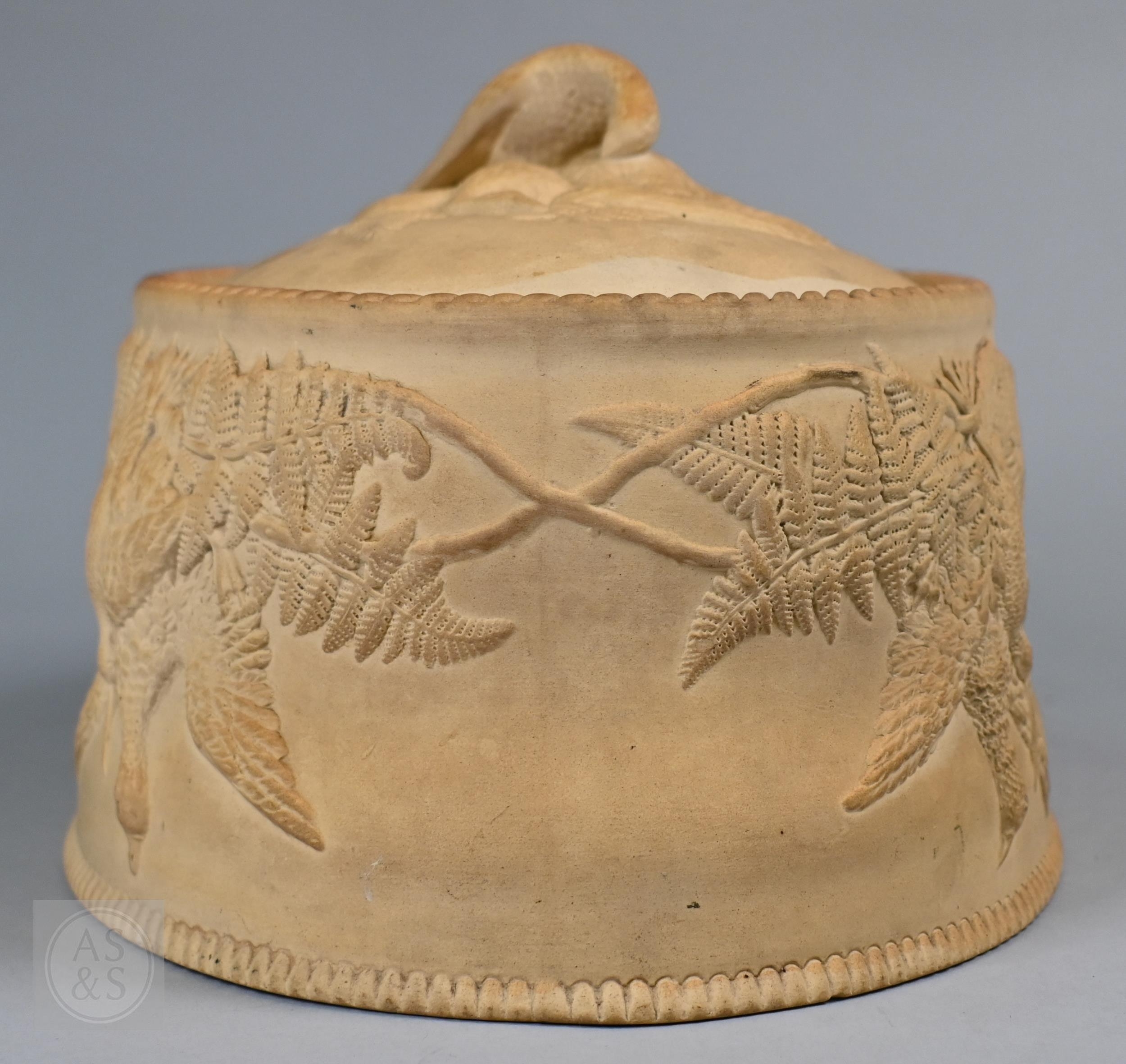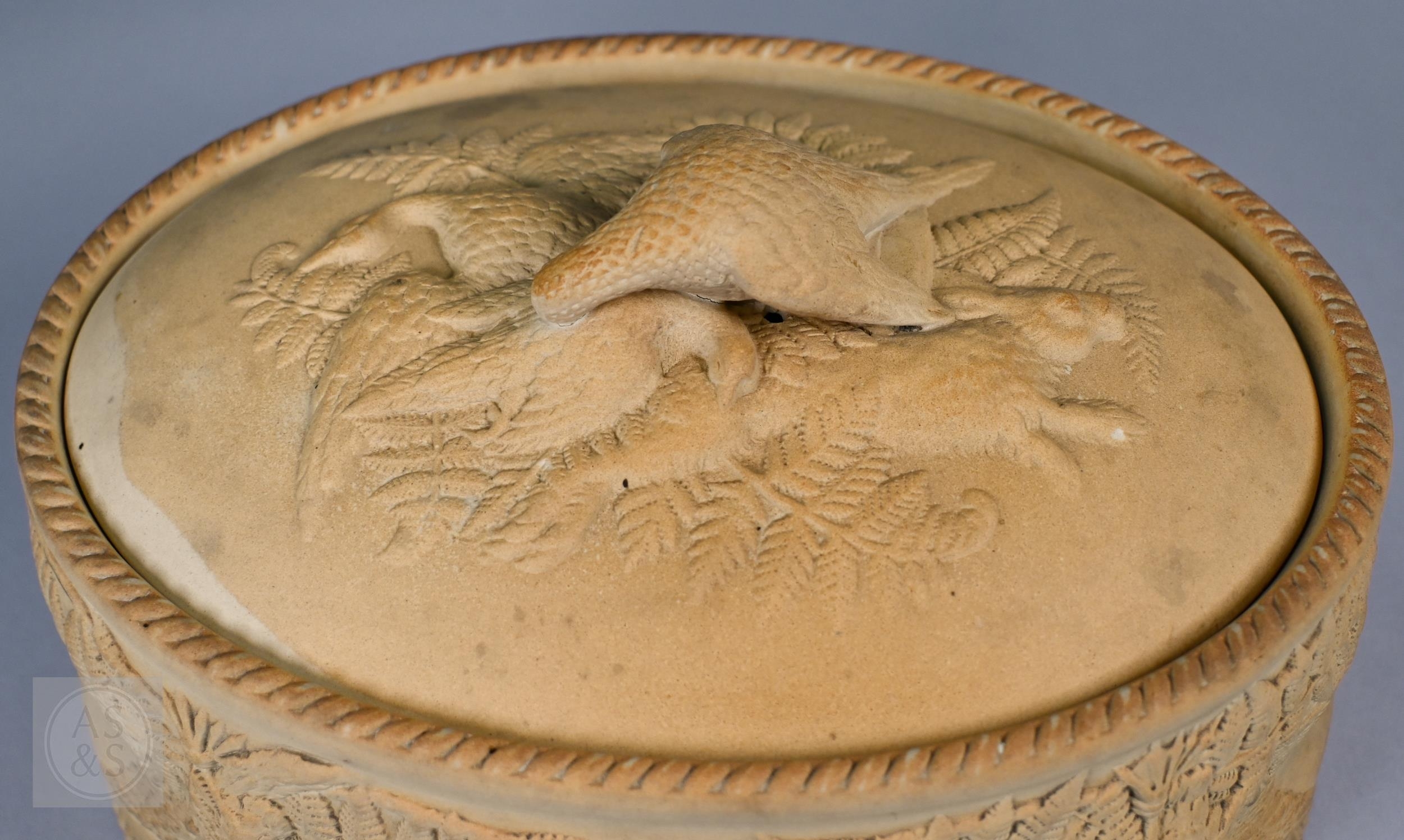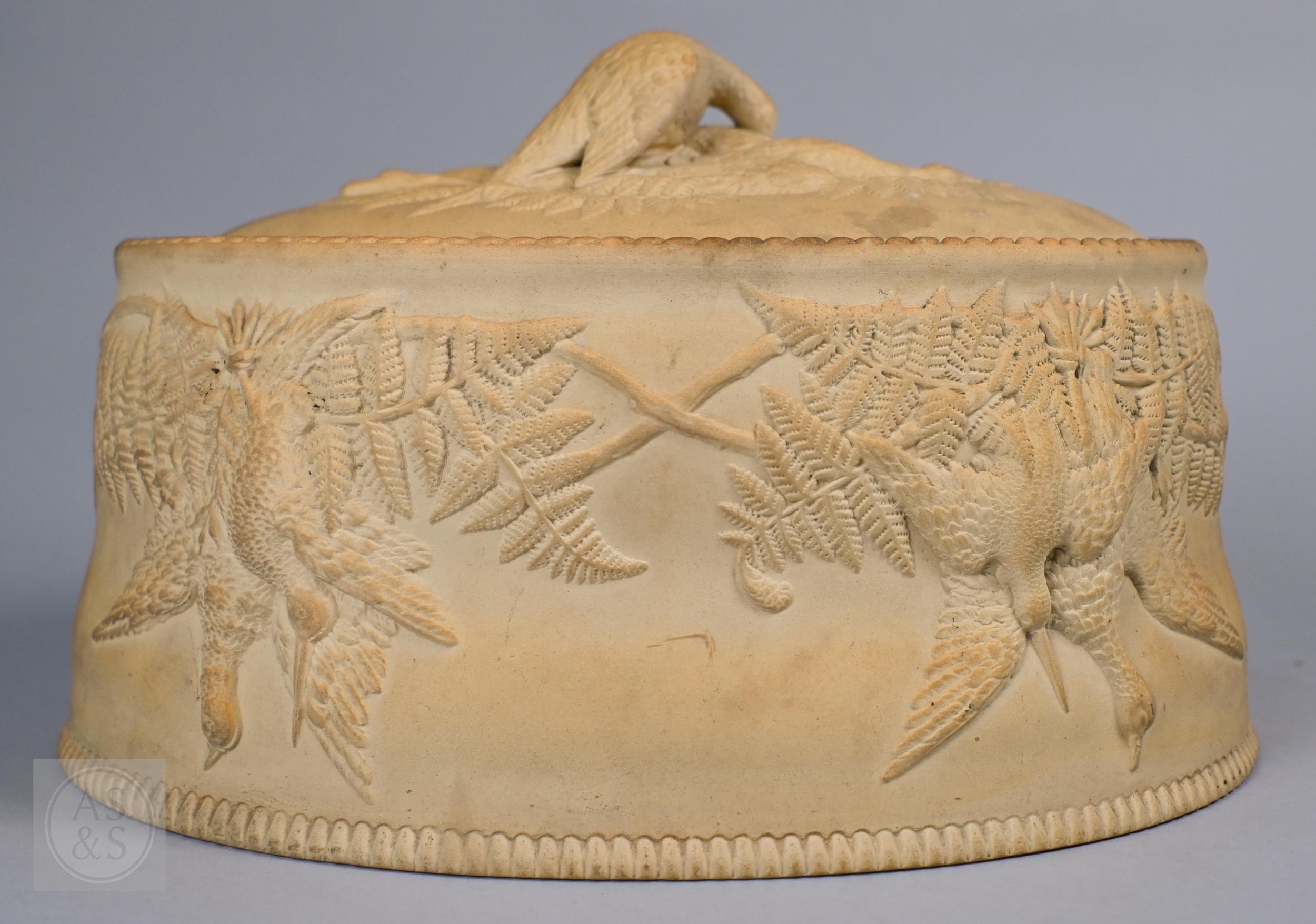 An antique earthenware game pie-dish, with applied decoration of game trophies and ferns, 29 cm long