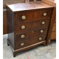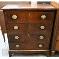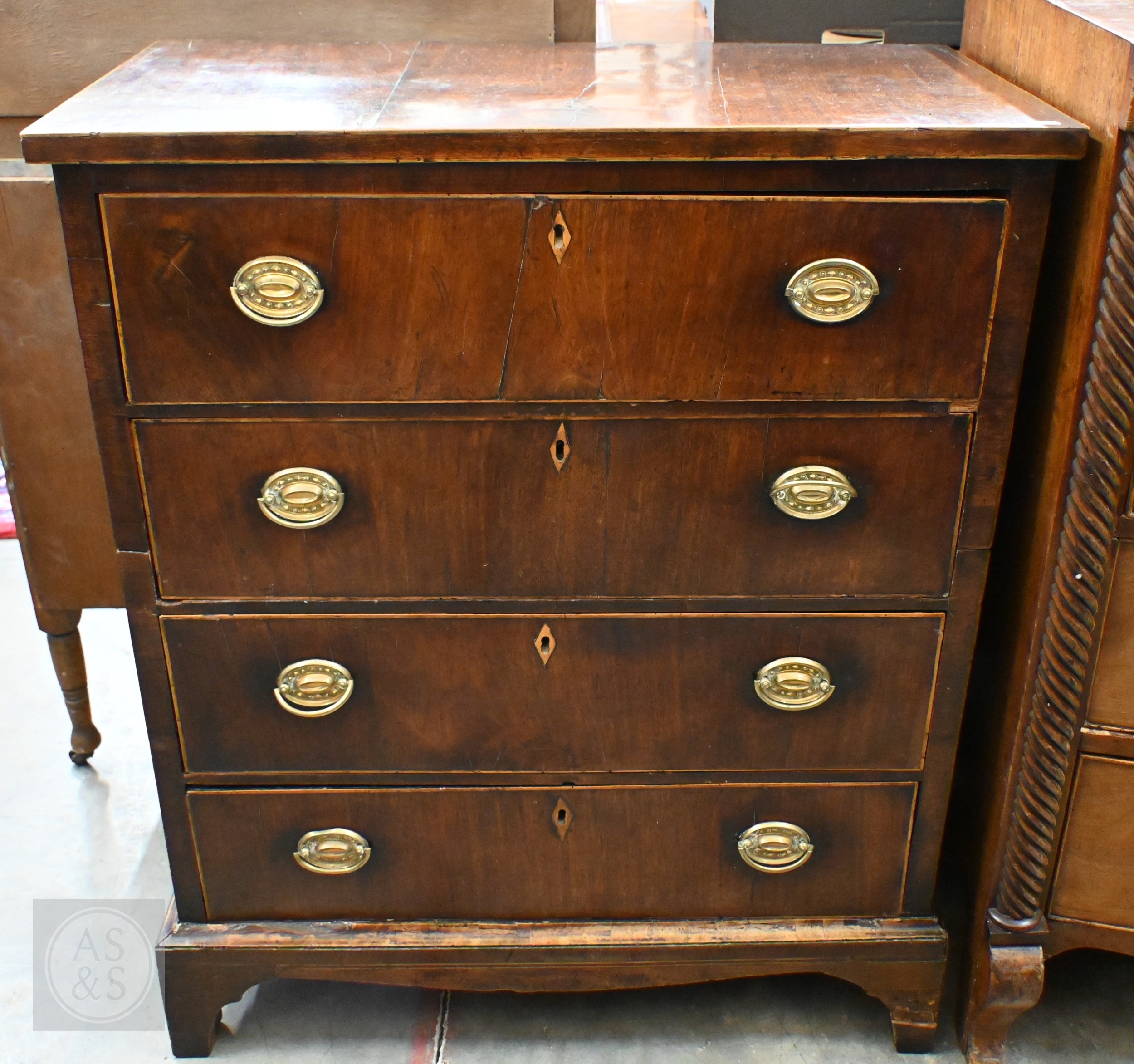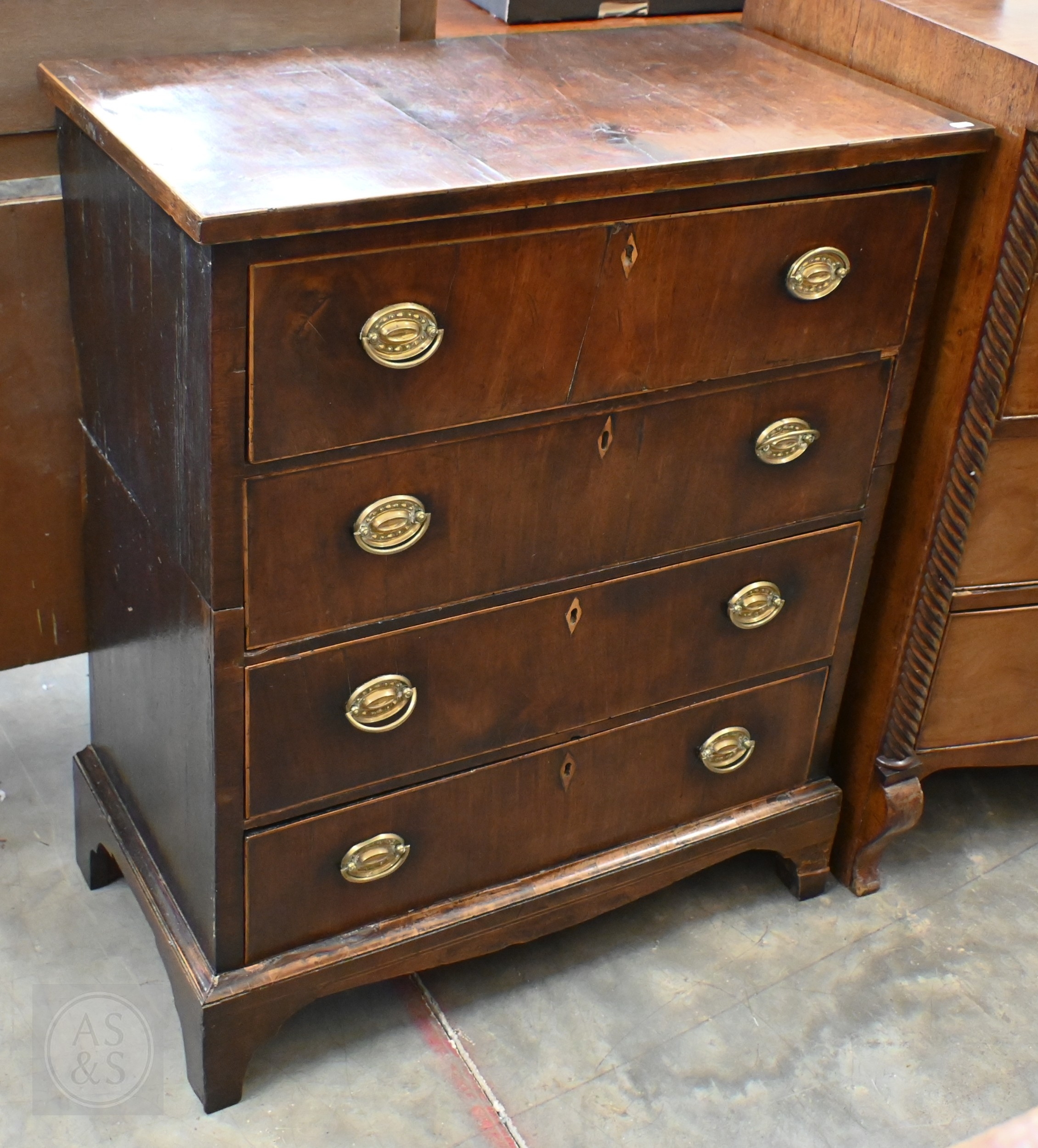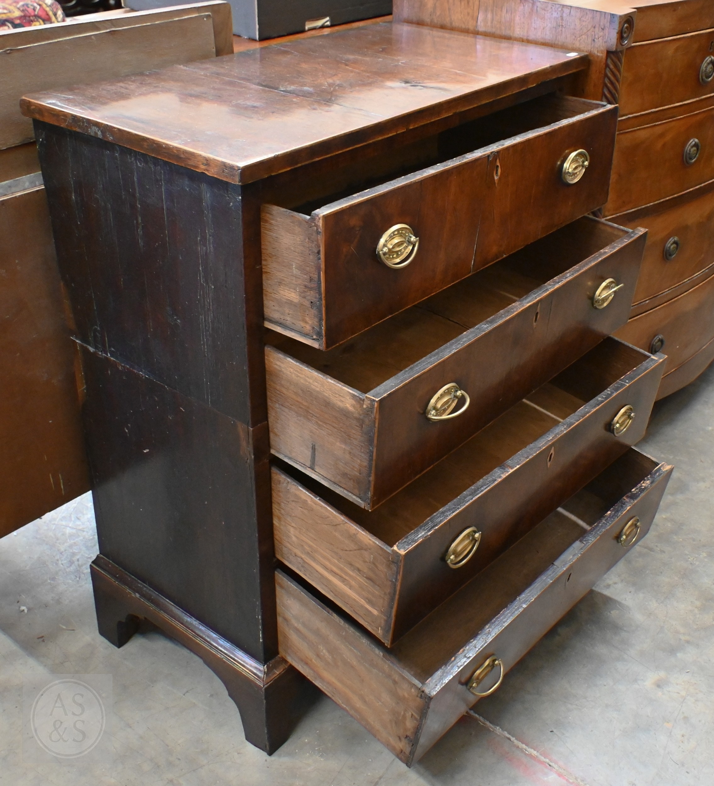 A Georgian mahogany chest of four long drawers with oval brass handles, standing on shaped bracket feet, a/f (splits into two sections), 78 x 40 x 94 cm high