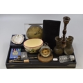 A Mixed Selection To Include Cunard Line Memorabilia, Brass Candlestick, Two Mantle Clocks (Spares Or Repairs), And More