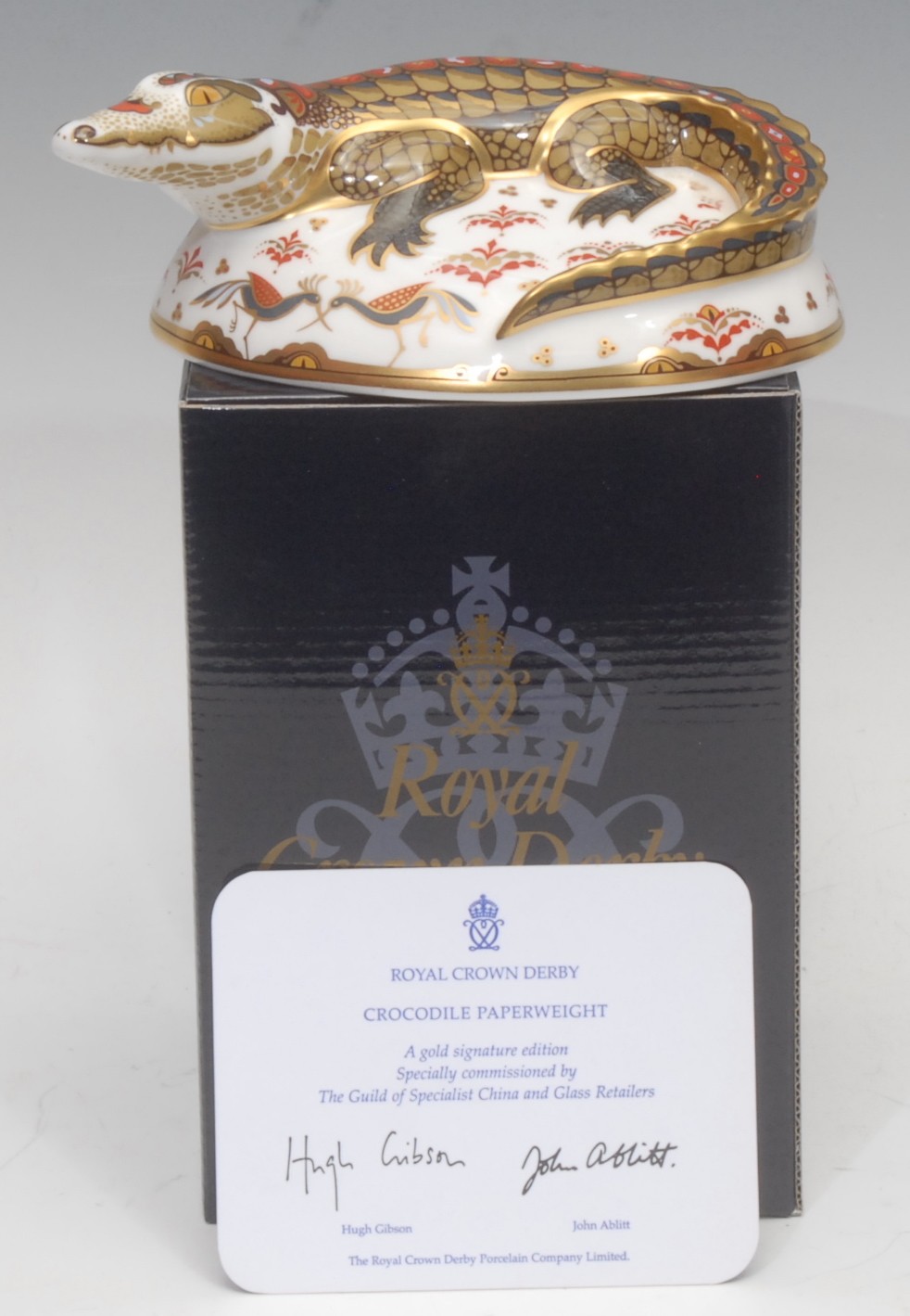 A Royal Crown Derby paperweight, Crocodile, Exclusive Gold Signature Edition for The Guild of Specialist China and Glass Retailers, signed by John Ablitt, gold stopper, printed marks, certificate, boxed