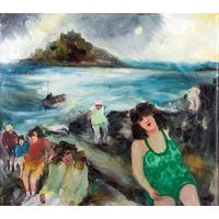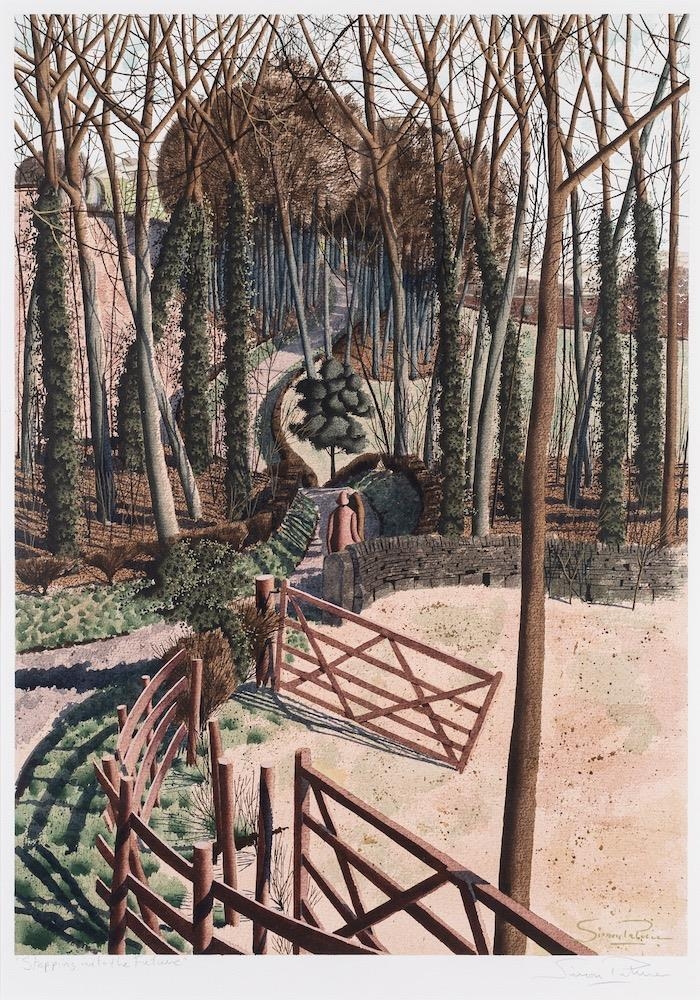 *Simon Palmer (British, b.1956) 'Stepping into the future' Watercolour 70 x 49 cm Signed twice lower right, inscribed with the title lower left and inscribed ' To Dear Nancy and Keith fondest love Simon' on the reverse