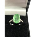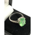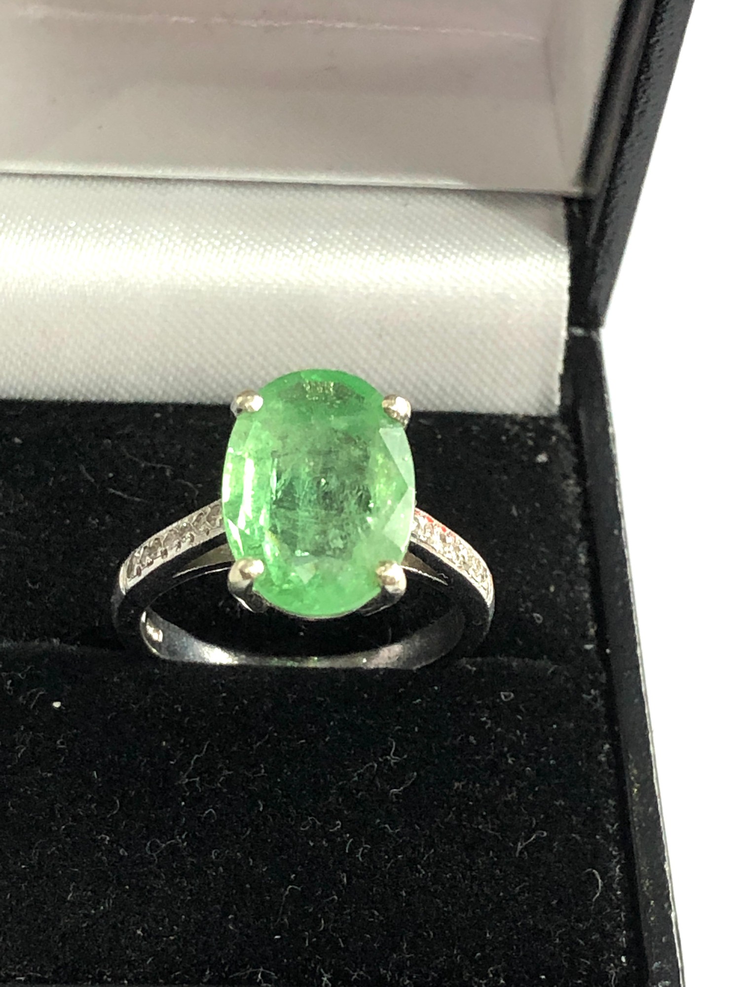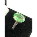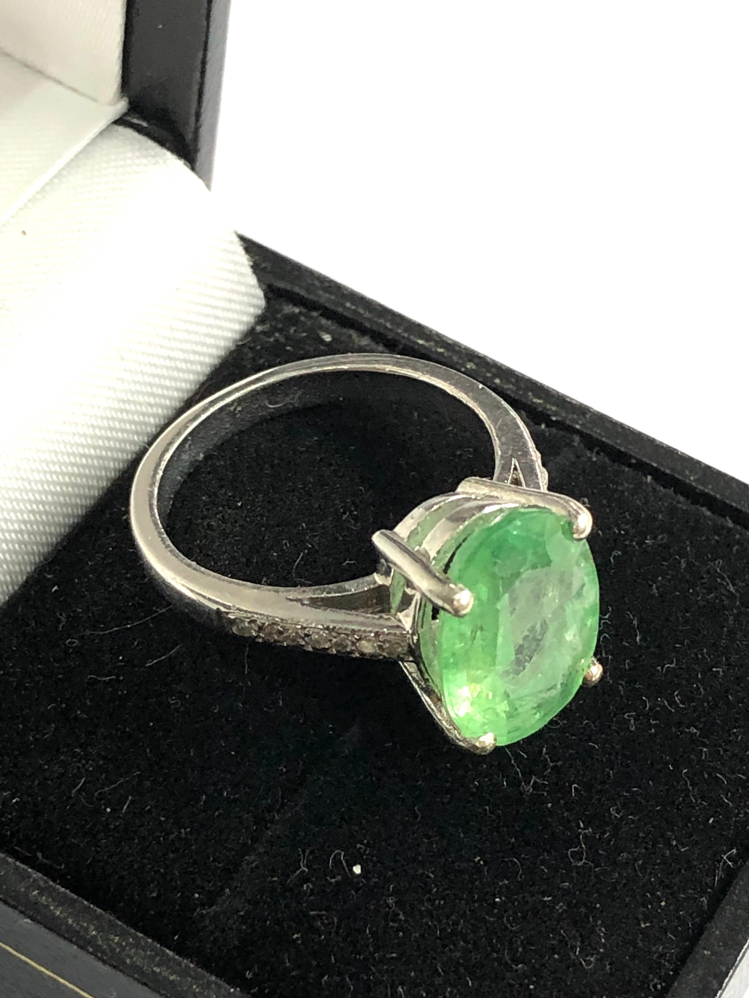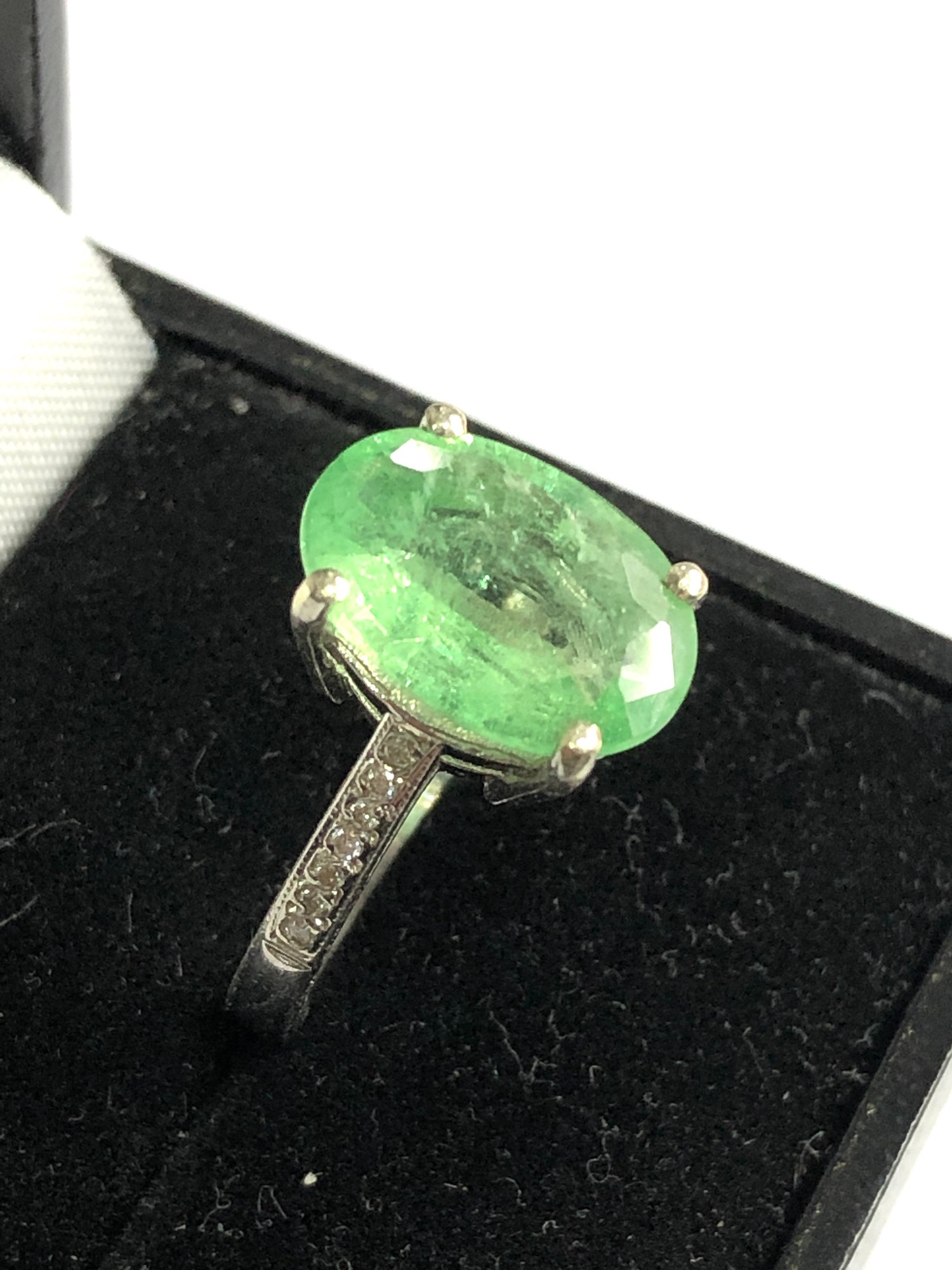 9ct white gold diamond and emerald ring large central emerald measures approx 13mm by 10mm with diamond shoulders weight 5.3g