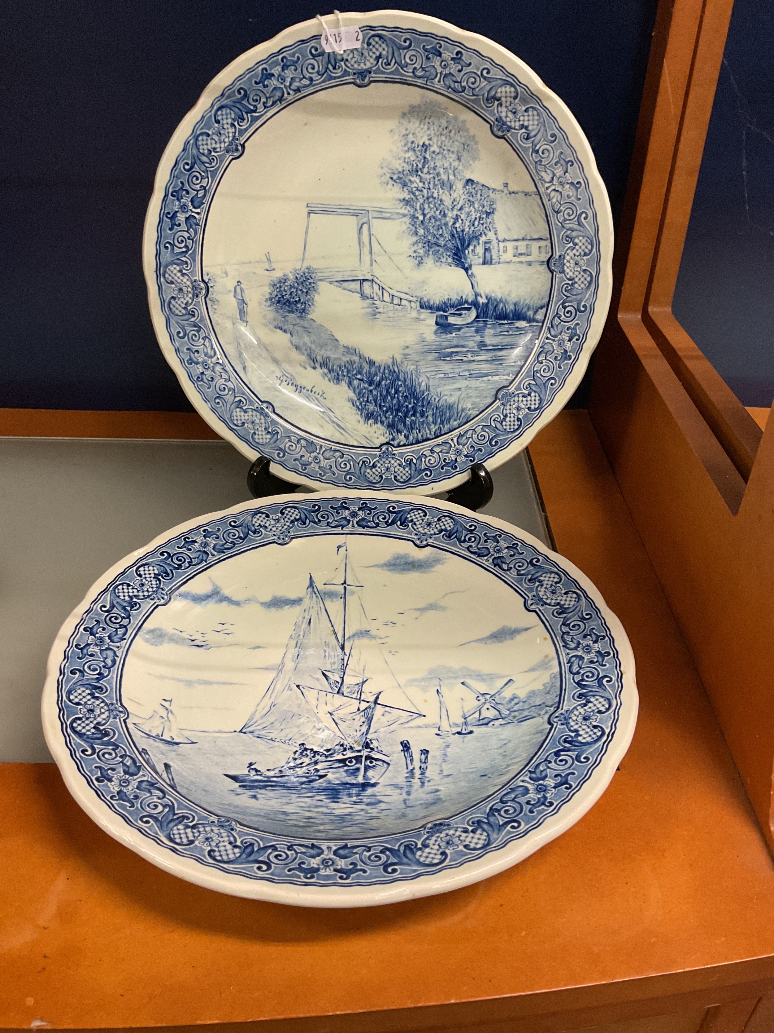 Two Delft by Boch blue and white chargers having pictorial river scene's