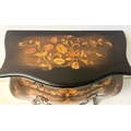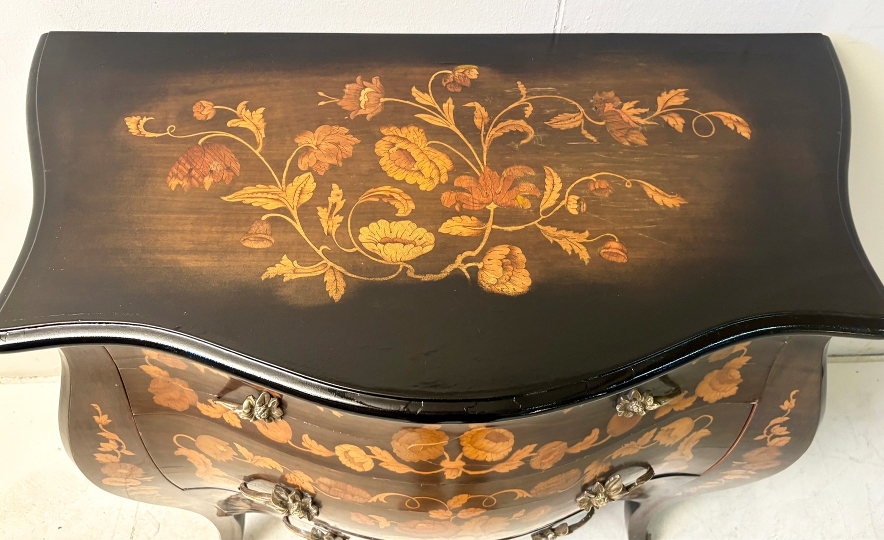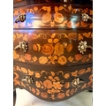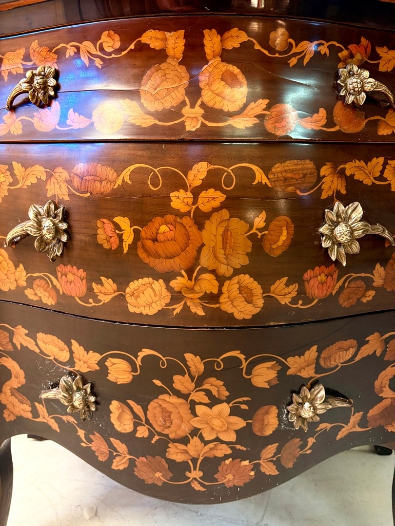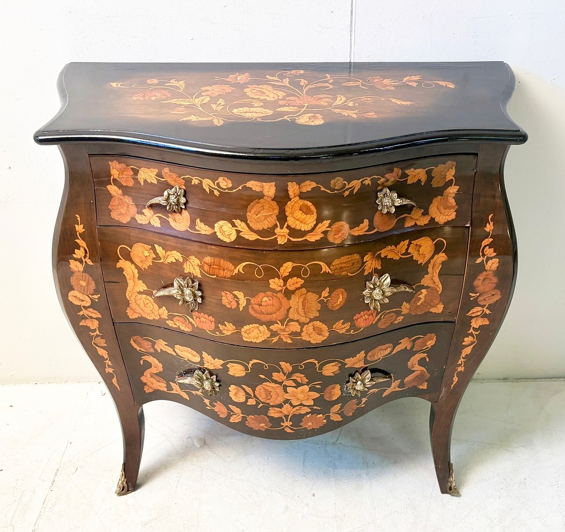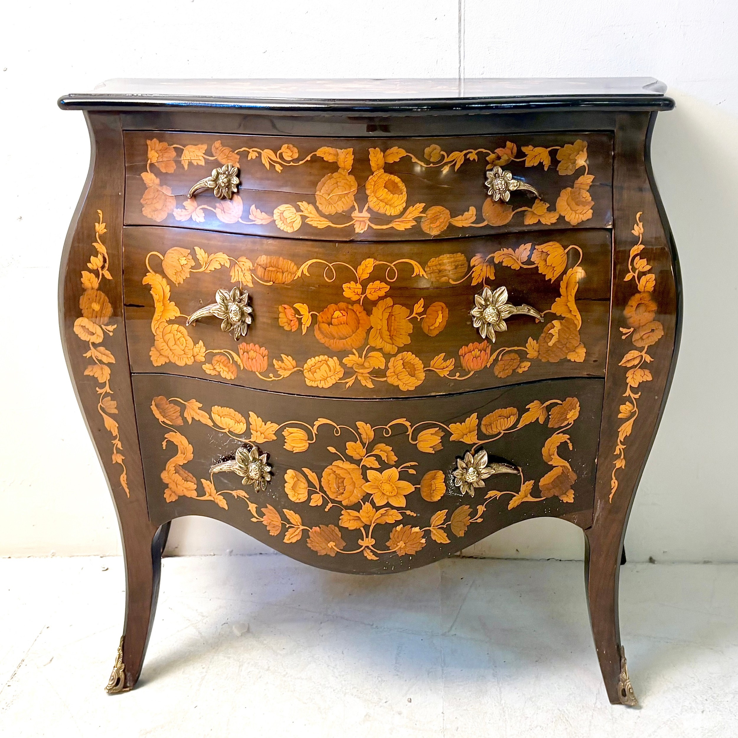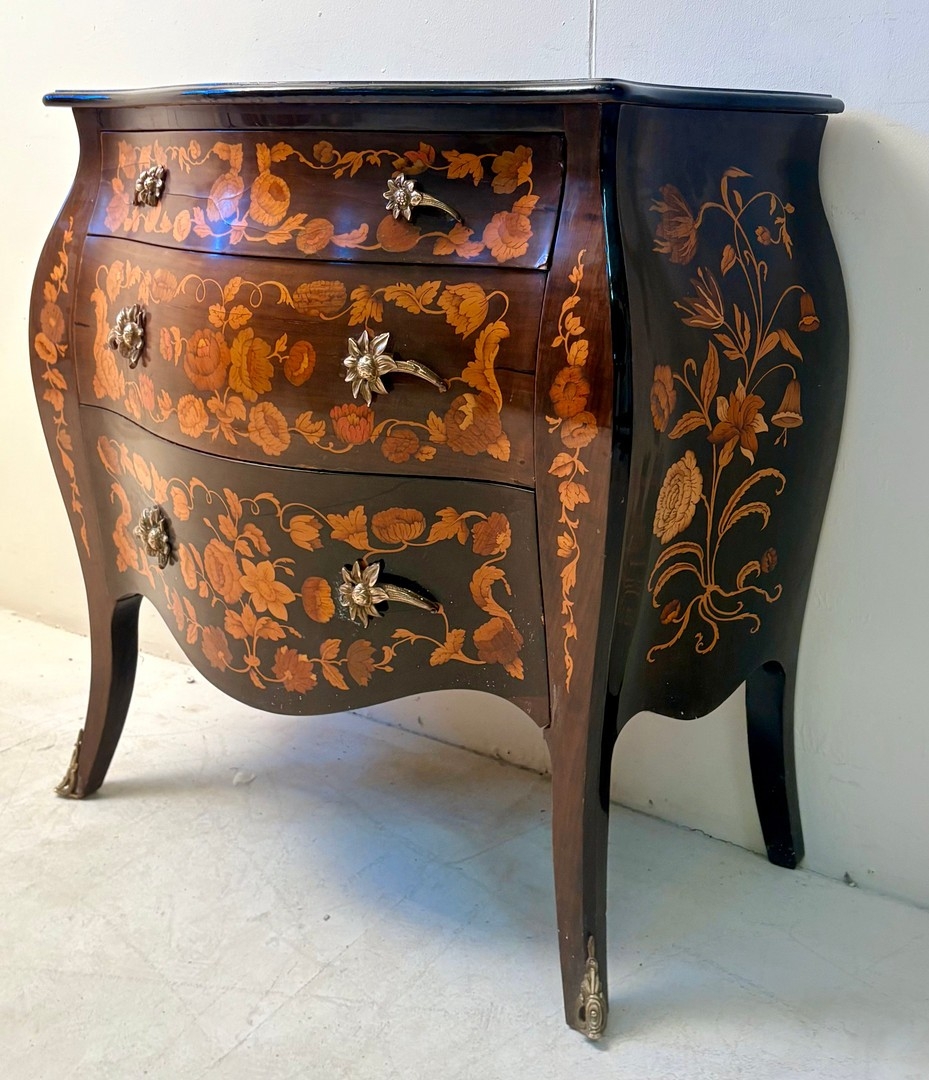 FRENCH BOMBE COMMODE WITH FLORAL MARQUETRY INLAY. 82cm H x 84cm W x 44cm D.