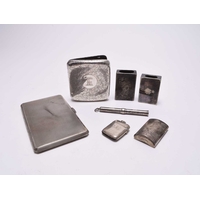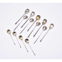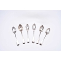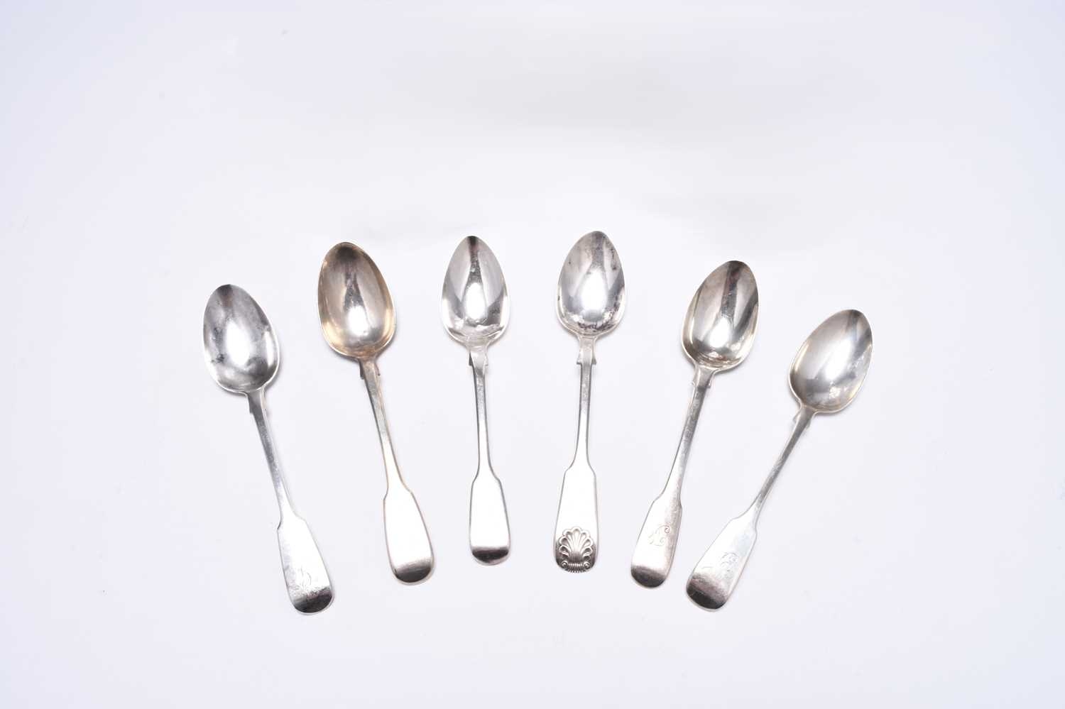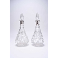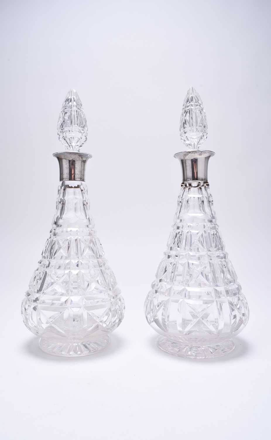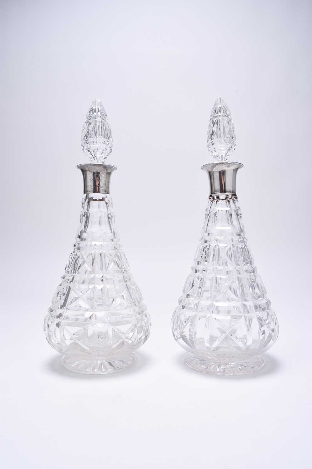 A matched pair of silver mounted cut glass decanters, London 1930 and 1934, one with presentation inscription, each approx 31.5cm high, together with a six silver Fiddle pattern teaspoons, various dates and makers, weight approx 3.6oz (8)