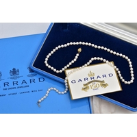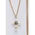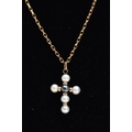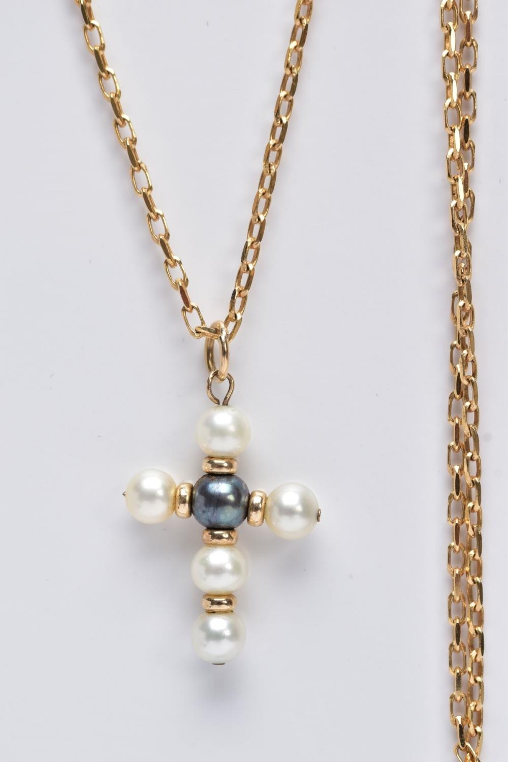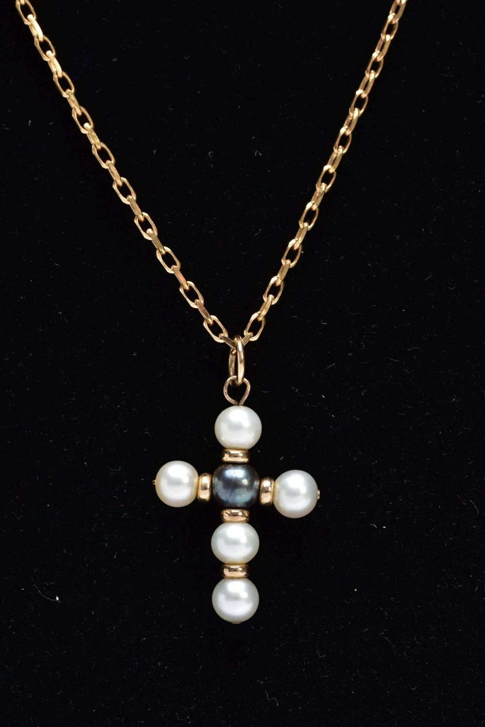 A 9CT GOLD CULTURED PEARL PENDANT NECKLET, the cross pendant made of a central black pearl and white outer pearls, fitted with a jump ring, suspending from an elongated curb link chain fitted with a spring clasp, hallmarked 9ct gold Birmingham, length 450mm, approximate gross weight 5.3 grams, together with box and outer packaging (Condition:- overall condition good, general light wear, clasp in working condition)