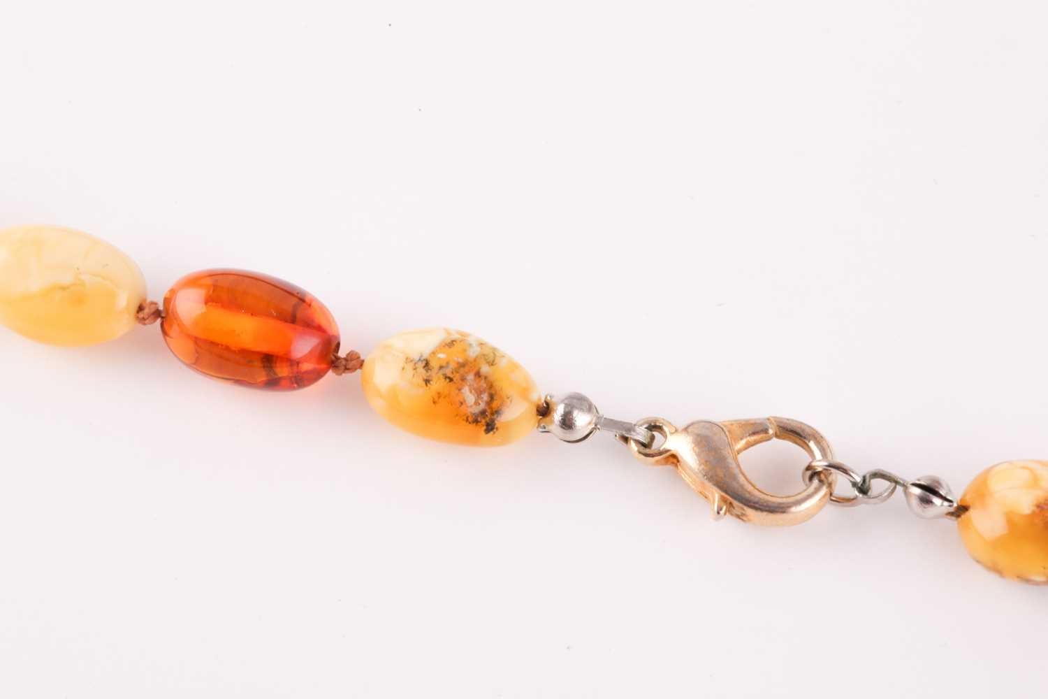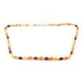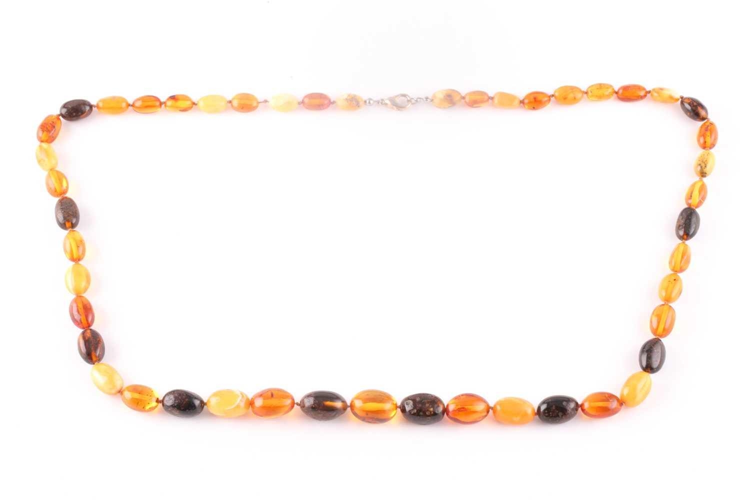 An amber bead necklace, comprising of butterscotch and dark and light amber beads, largest approximately 2 cm, smallest 1.3 cm. 46 grams.