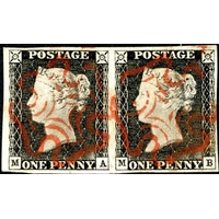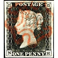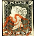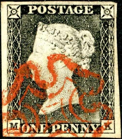 Plate 1a - MK - with four good to large margins and very fine crisp red MX, very worn print. Light toning mostly on the back.
