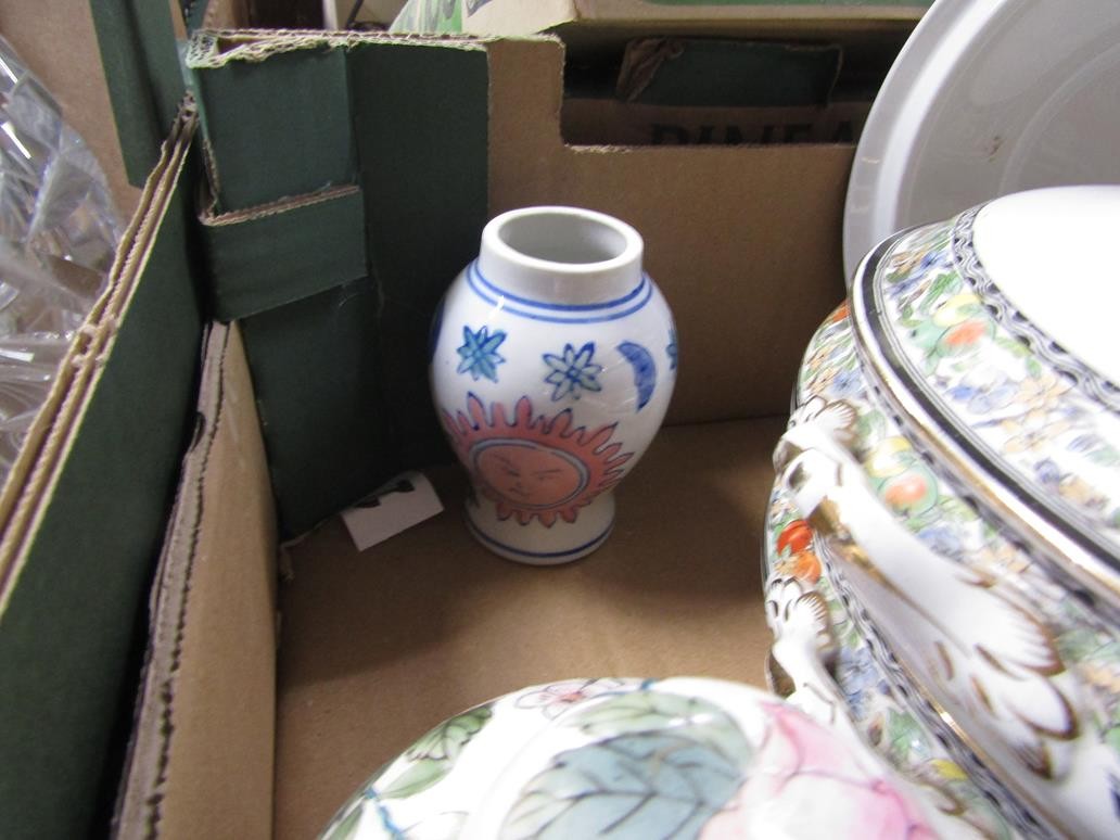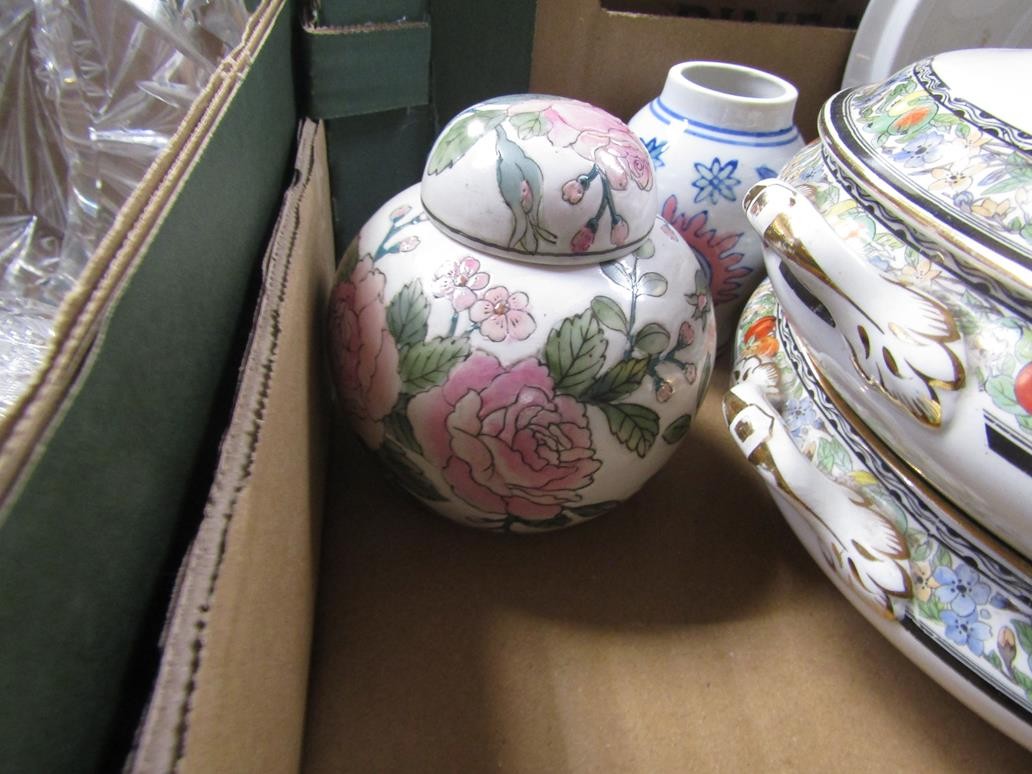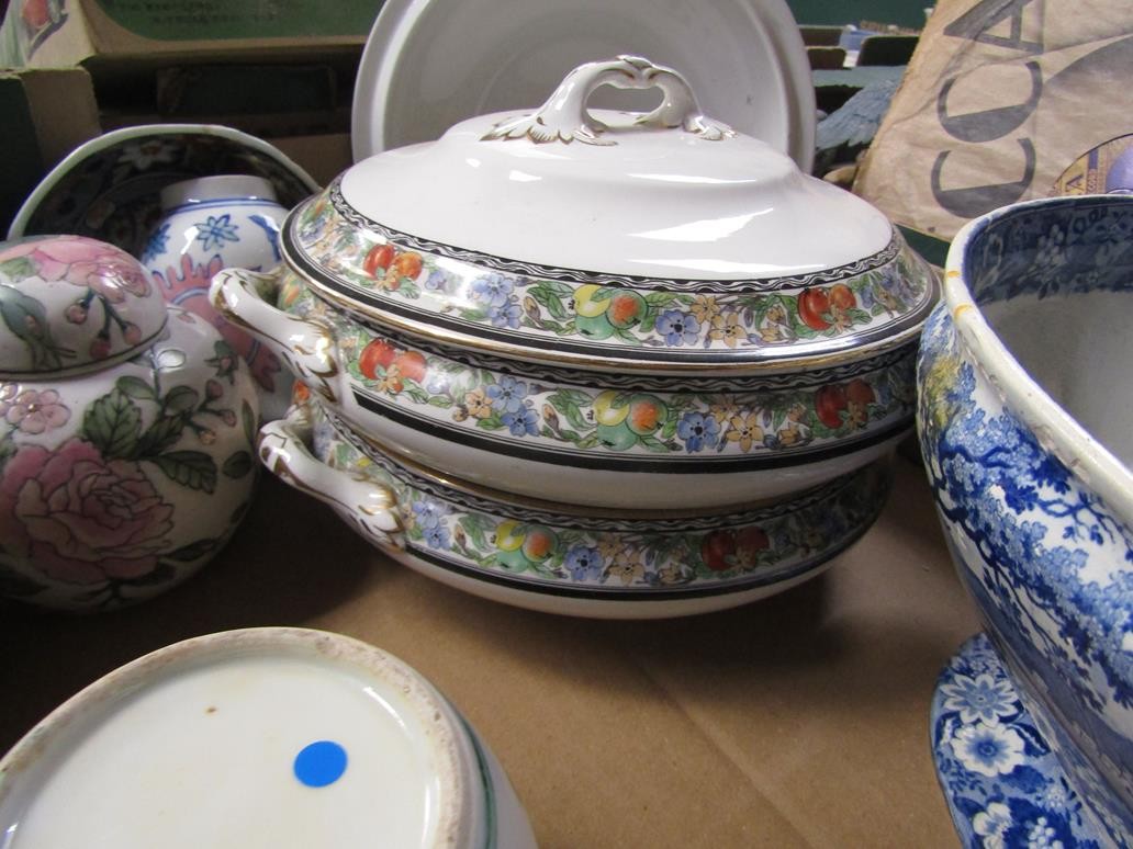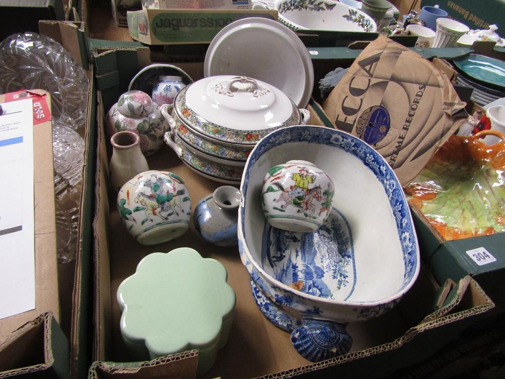 BOX OF CERAMICS TO INCL B&W TUREEN, ORIENTAL ETC