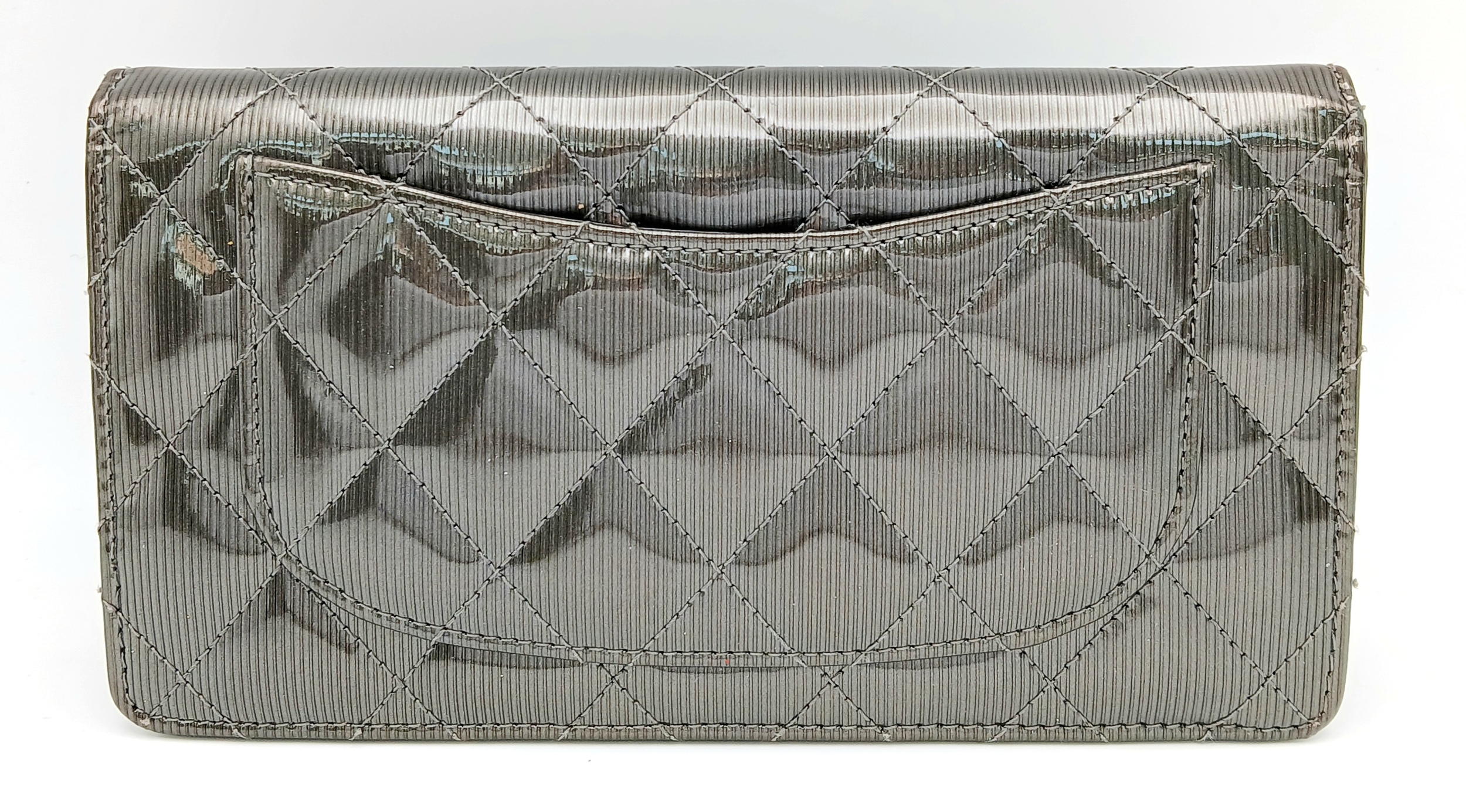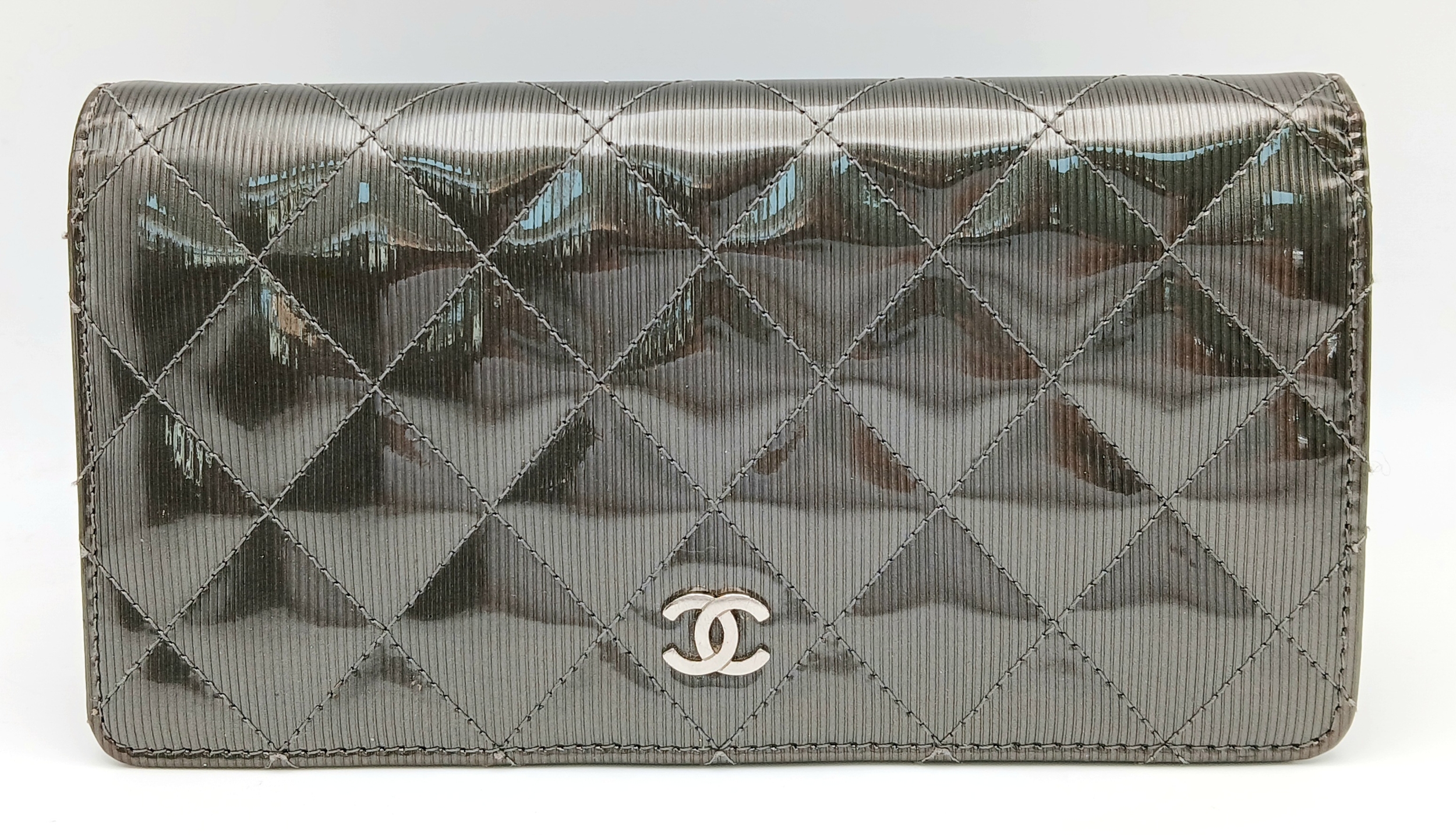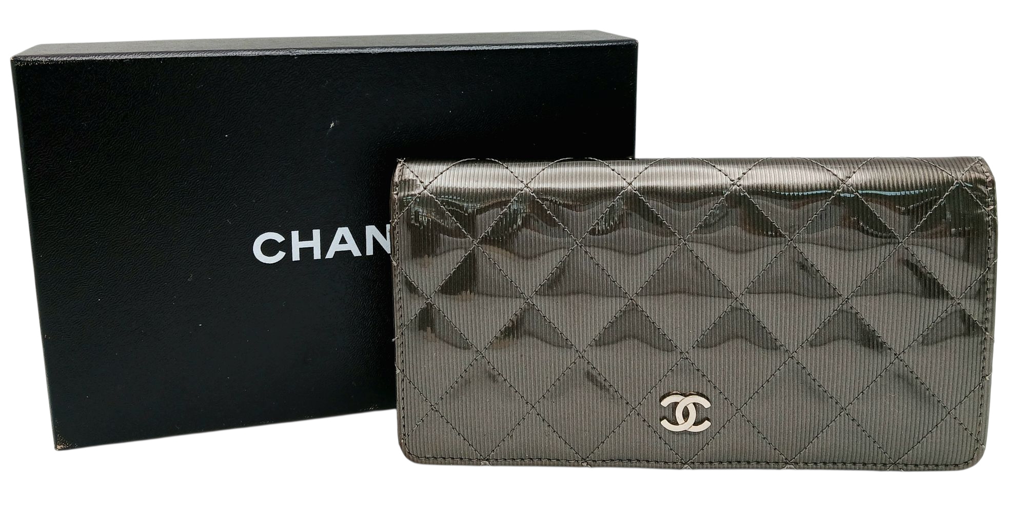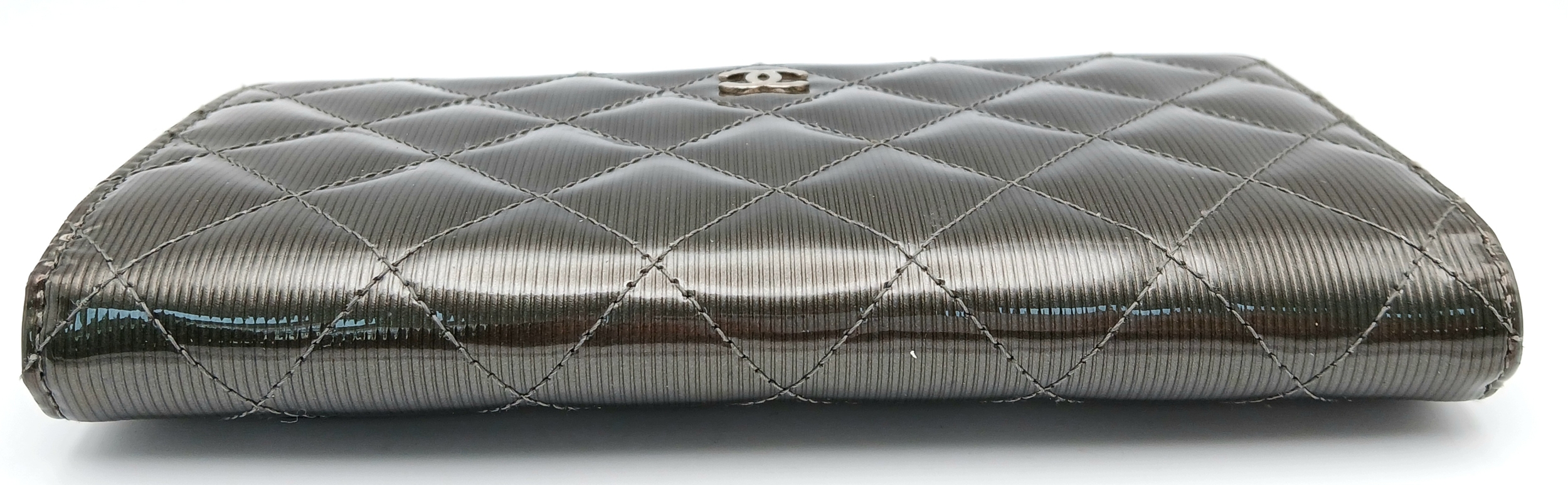 A Chanel Metallic Silver Quilted Patent Leather Wallet. Metallic silver leather exterior with silver-toned hardware and magnetic closure. Grey textile interior includes multiple compartments for cards, notes and coins. Signs of wear and tear exterior and interior. Comes with card of authenticity, care booklet and box. Approx 18.5cm width x 10cm height. Please see photos or request a condition report. Ref: STK022765