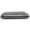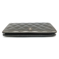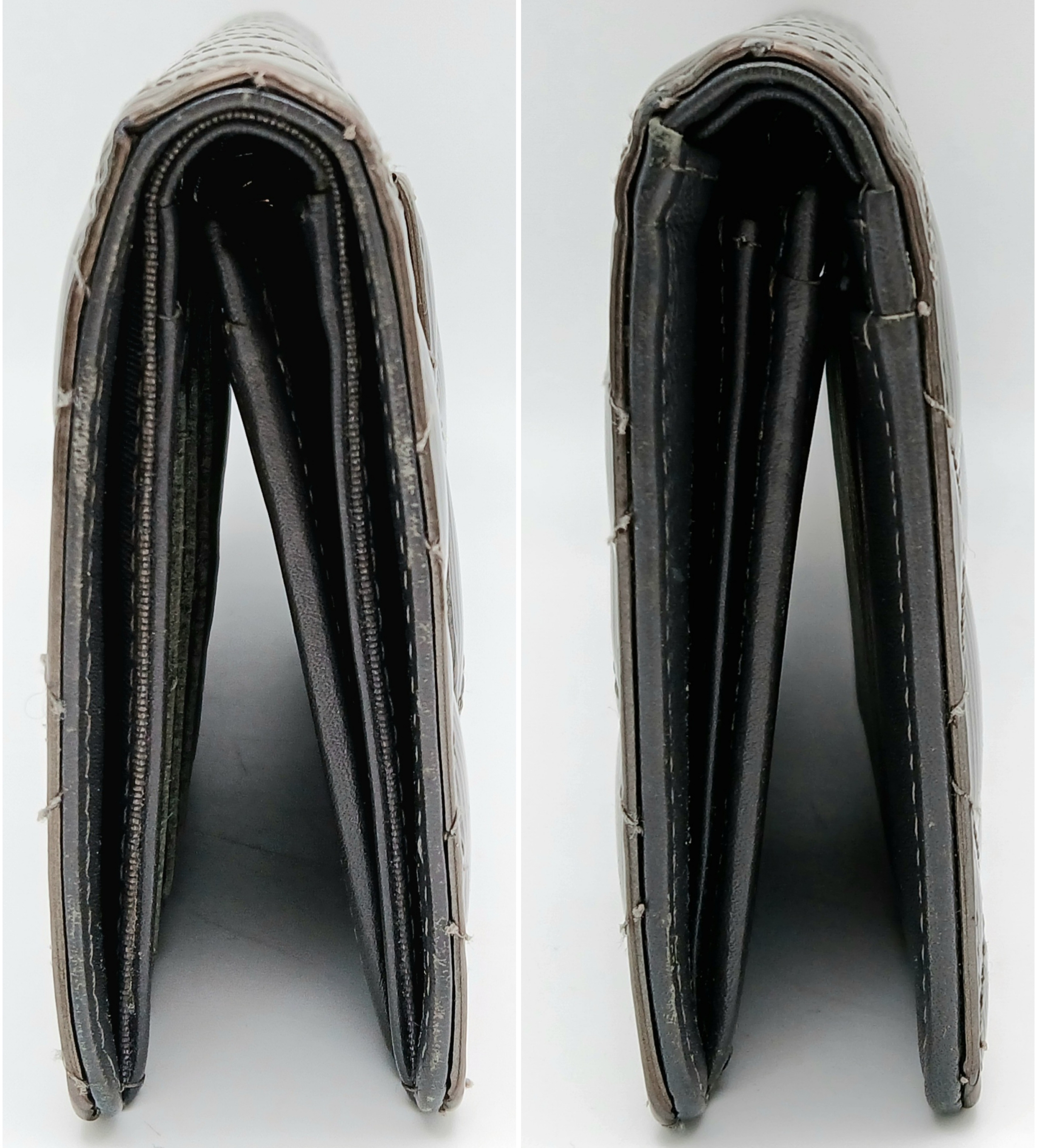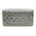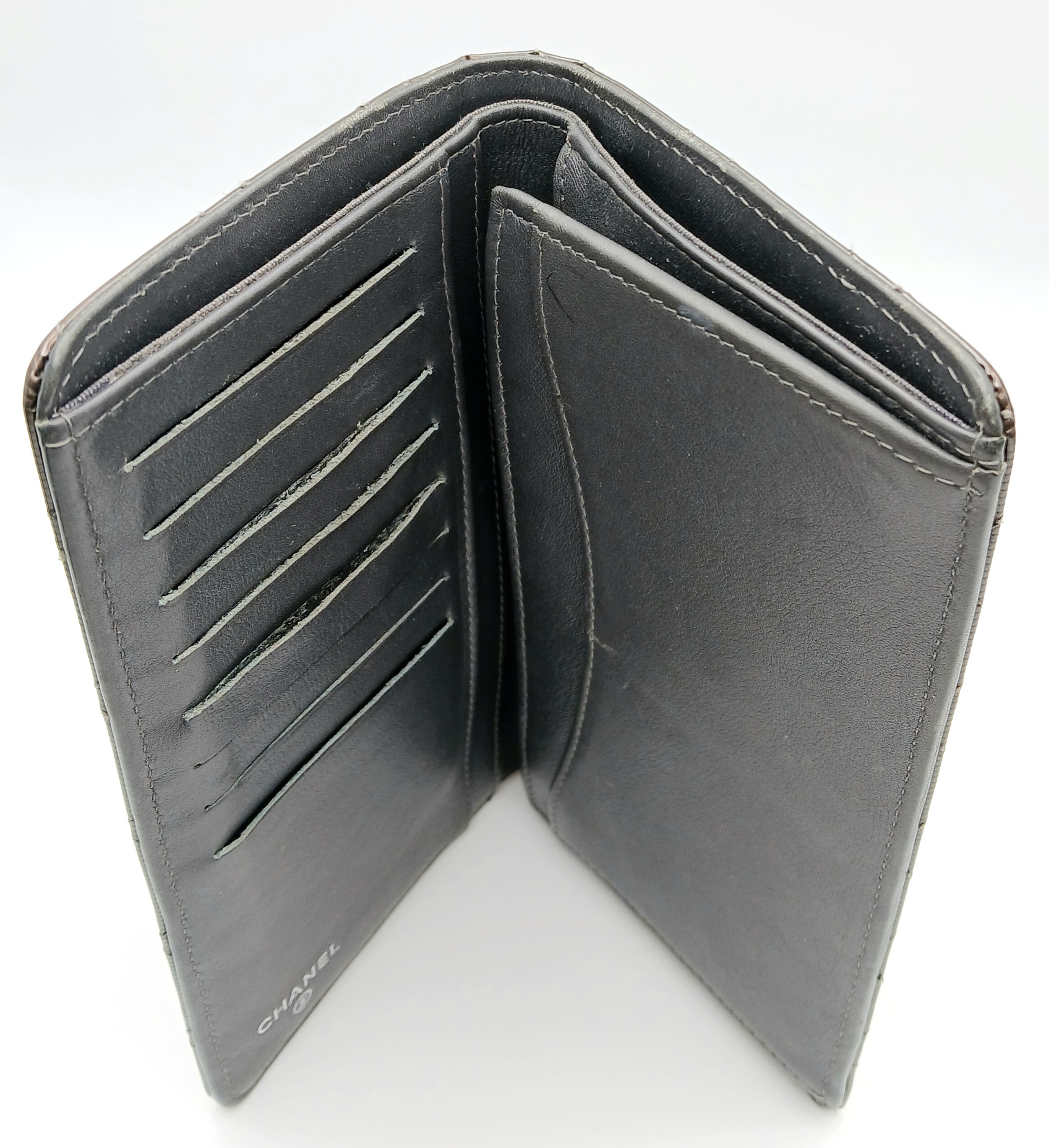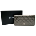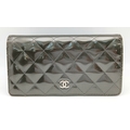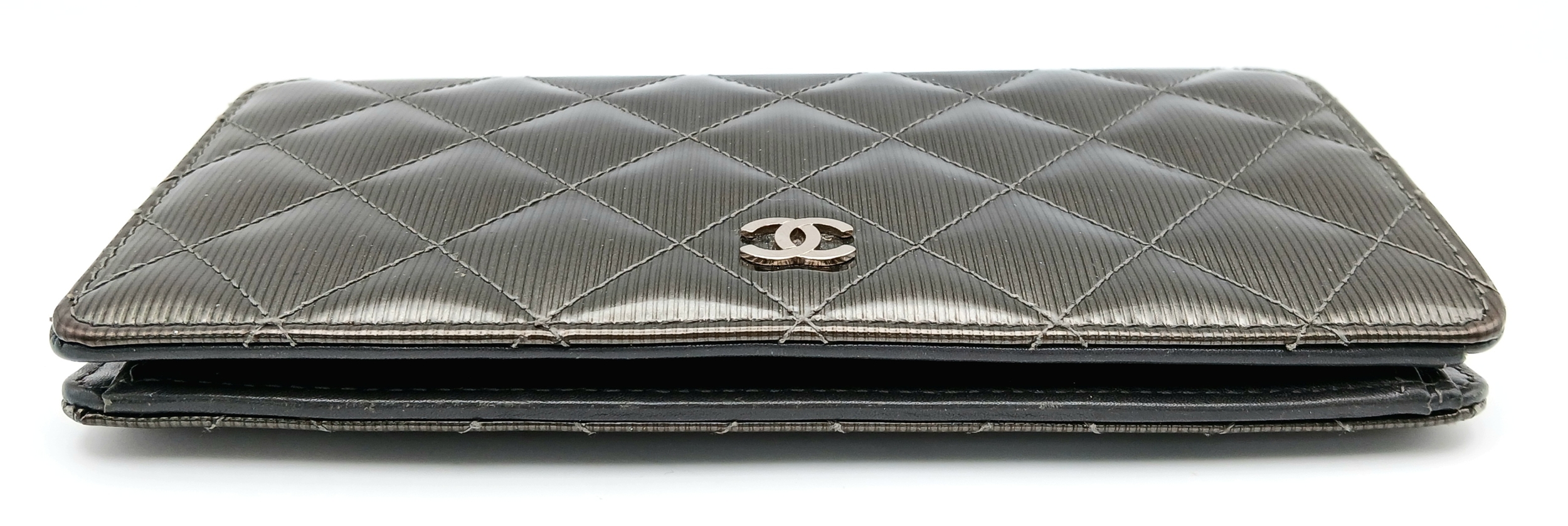 A Chanel Metallic Silver Quilted Patent Leather Wallet. Metallic silver leather exterior with silver-toned hardware and magnetic closure. Grey textile interior includes multiple compartments for cards, notes and coins. Signs of wear and tear exterior and interior. Comes with card of authenticity, care booklet and box. Approx 18.5cm width x 10cm height. Please see photos or request a condition report. Ref: STK022765