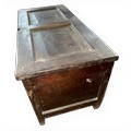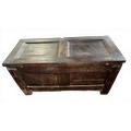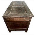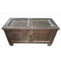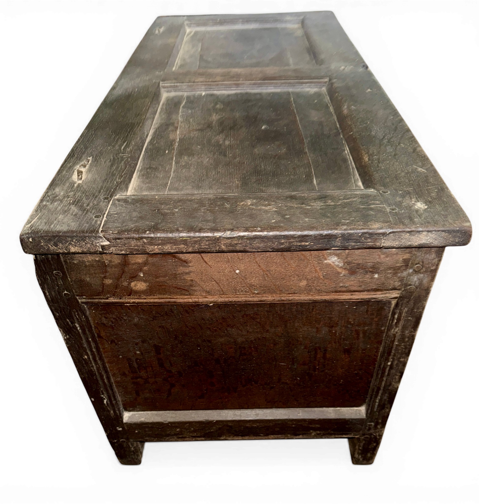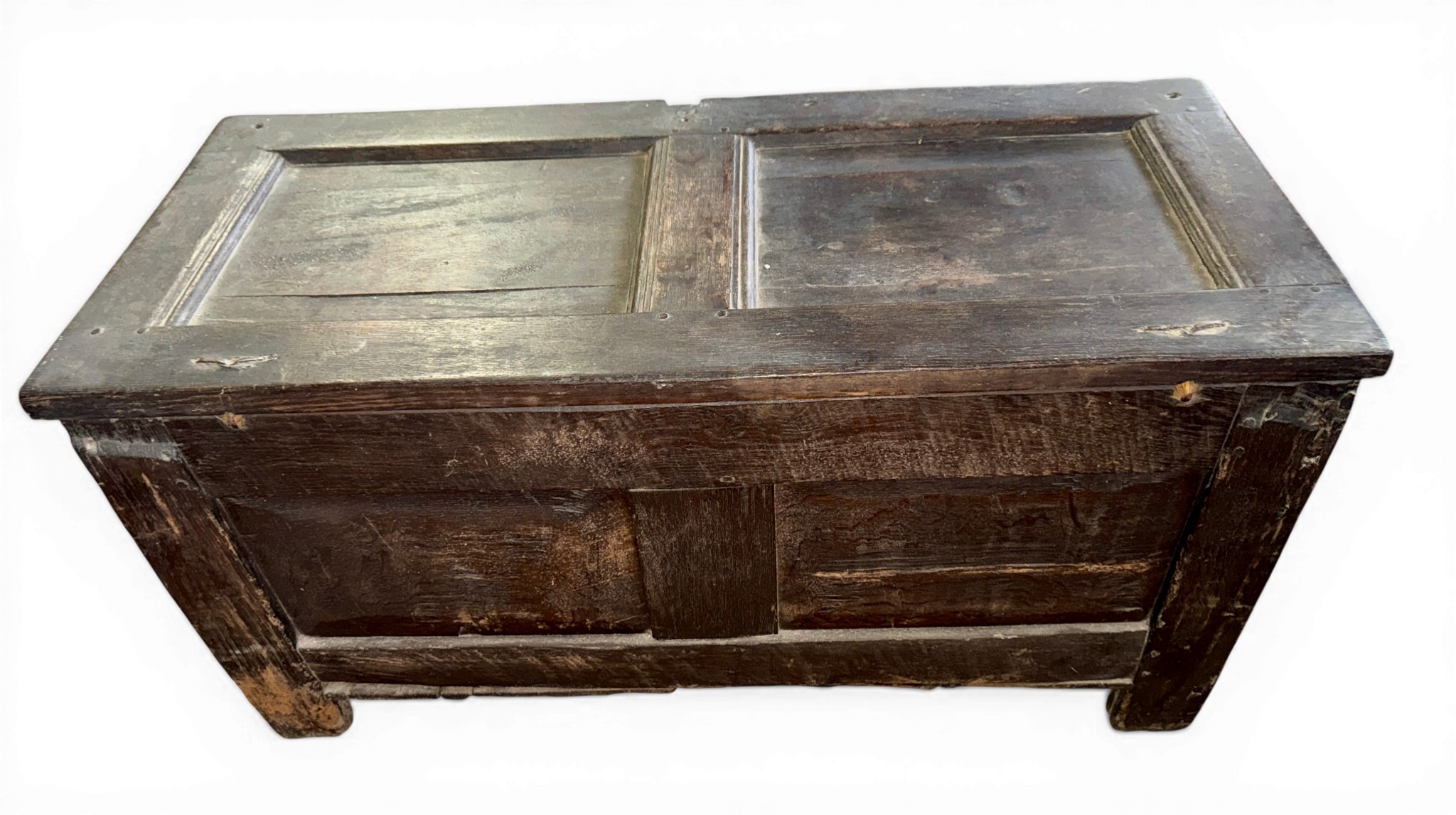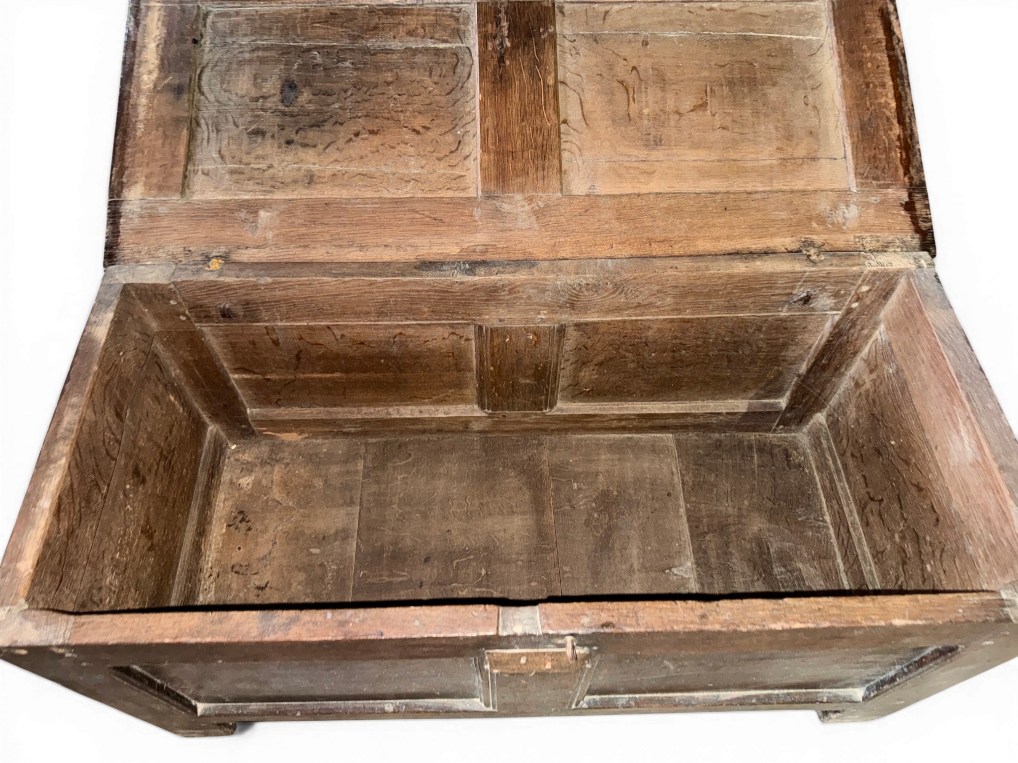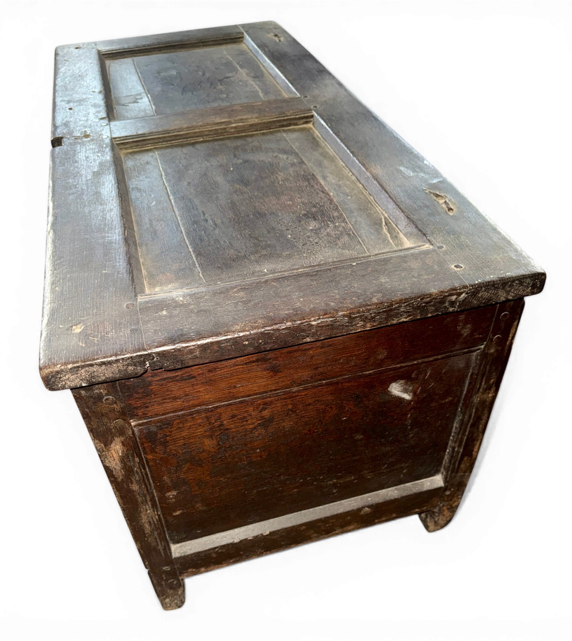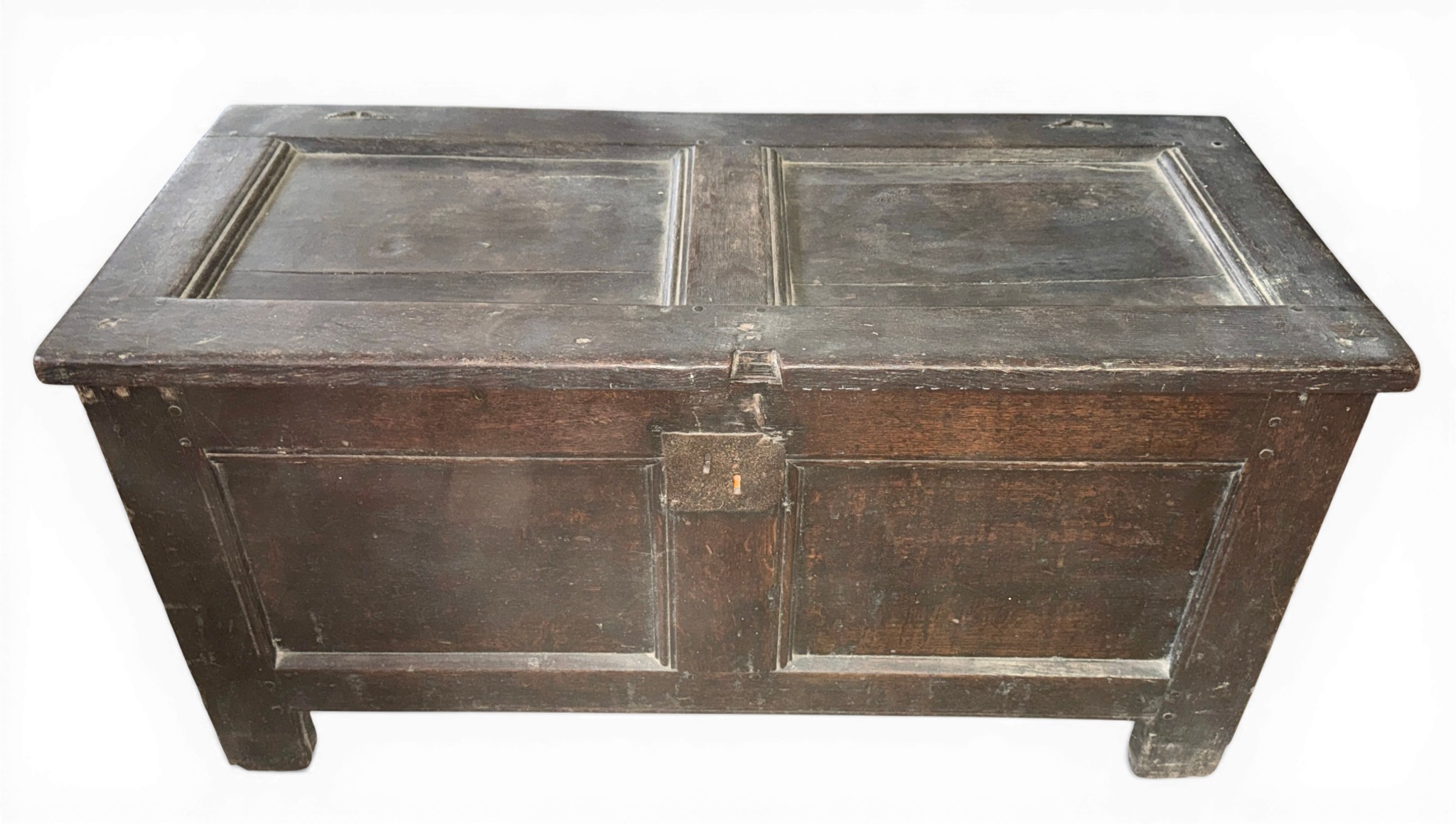 An 18thC oak coffer with original snipe hinges. 106cm w x 48cm d x 52cm h.