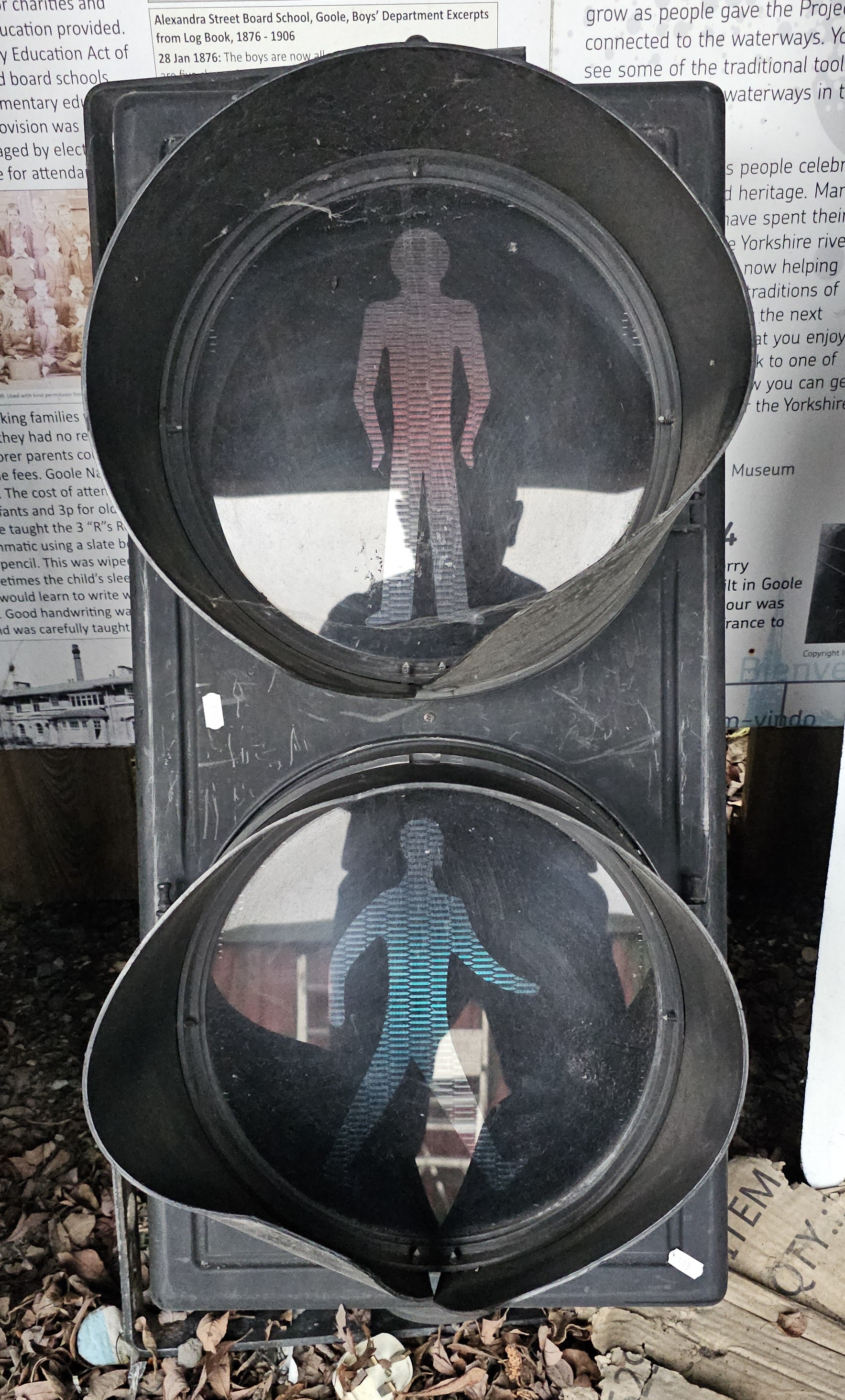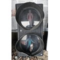 A vintage 20th-century crossing light, plastic case finished in black with glass coloured traffic control lights, rewired with 12V halogen bulbs with a transformer, 90 x 44cm