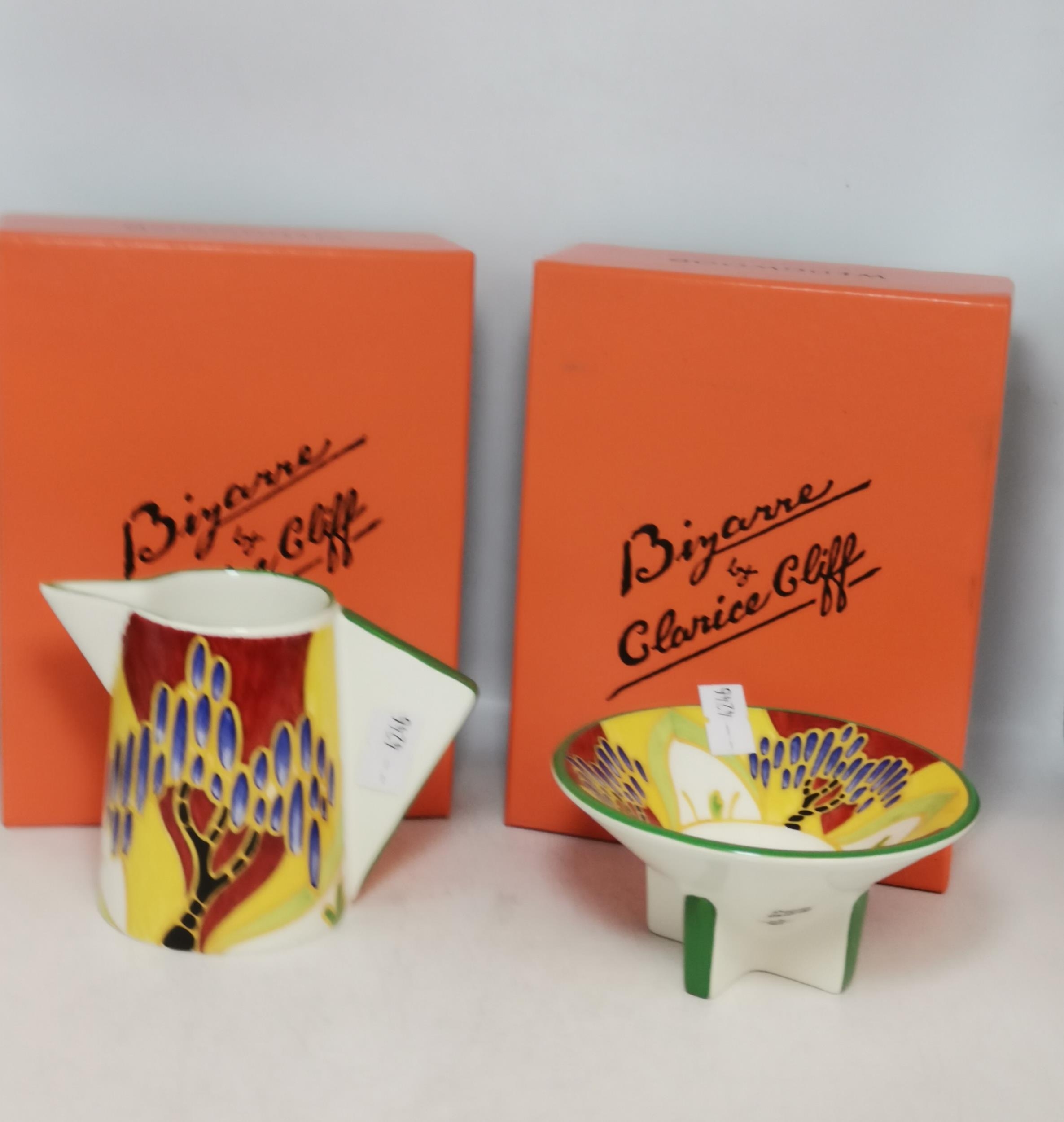 A Clarice Cliff Sugar bowl and jug in Bizarre pattern both in original box