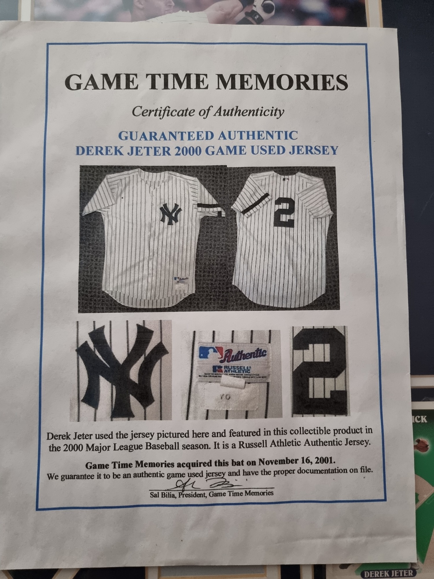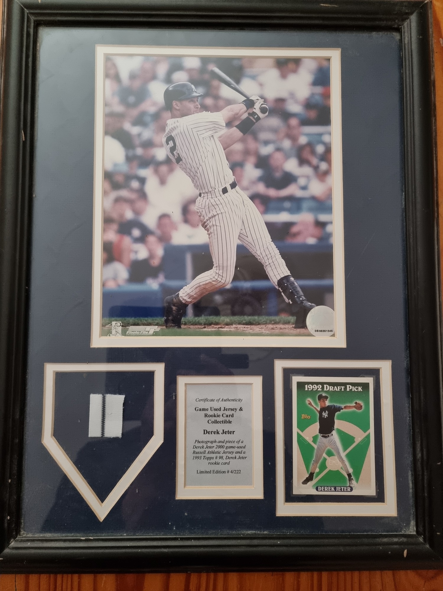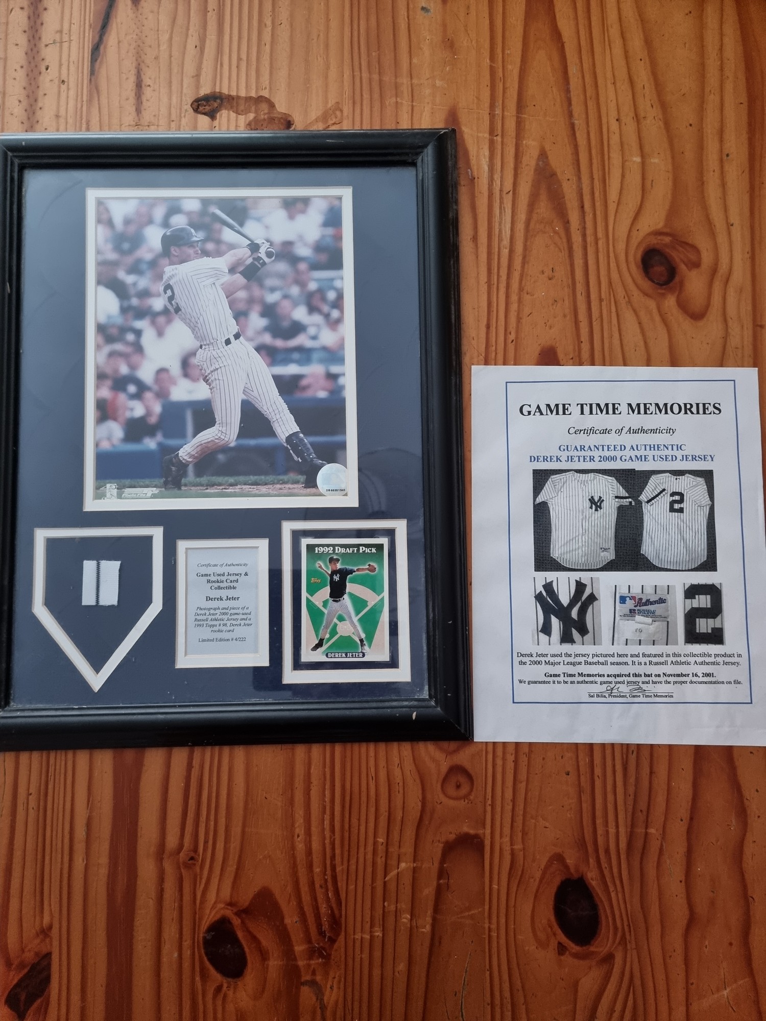 Framed game used Jersey & Rookie card of New York Yanky baseball player Derek Jeter with certificate of Authenticity