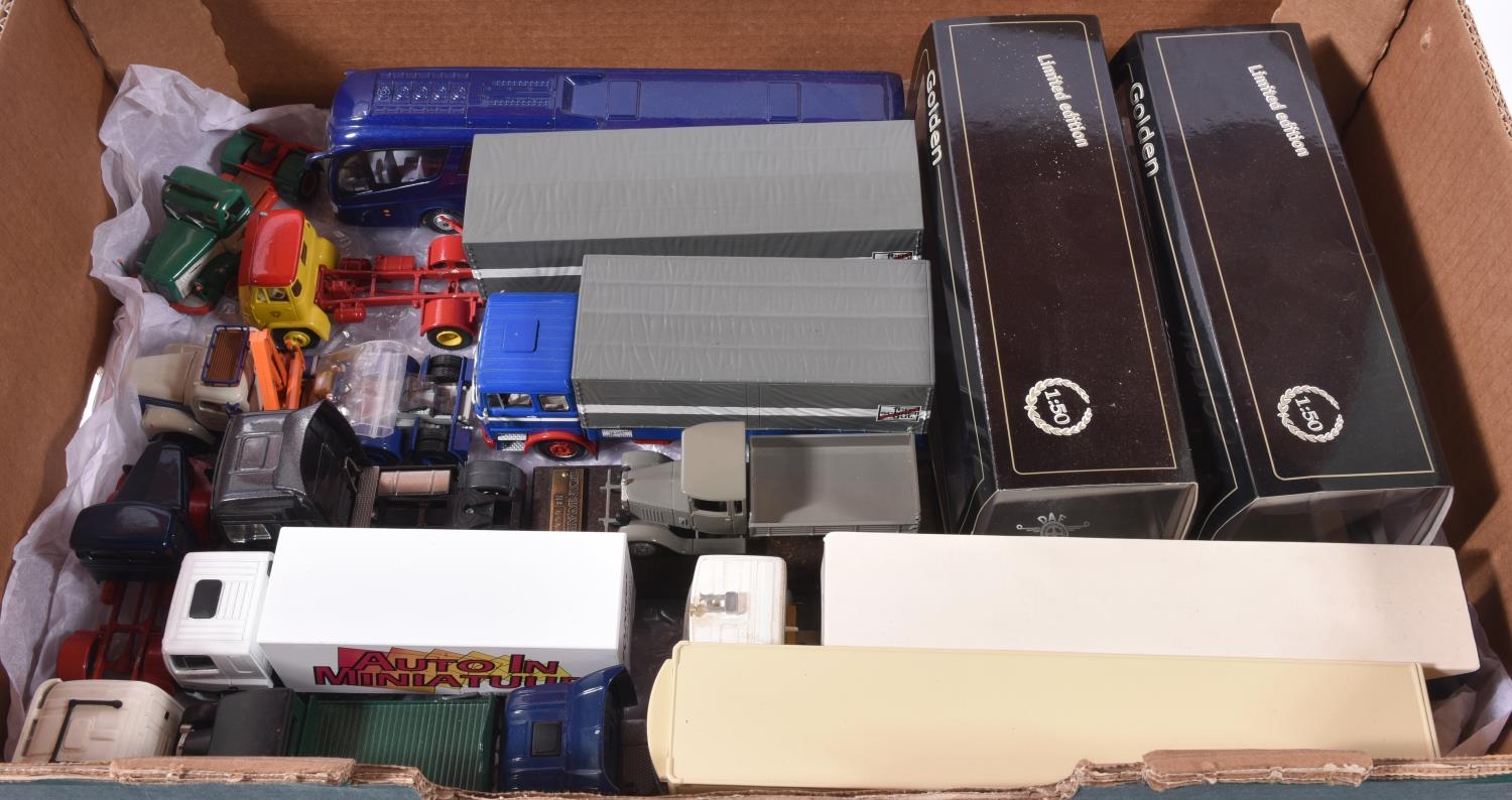2x Lion Toys Golden oldies series trucks. DAF A15 D516 Torpedo 1957 flatbed airport truck. Plus a DAF forward control tractor unit with flatbed and NS container load. Both boxed. Plus a 3 axle Scania Irizar coach a Mini-Champs Mercedes Benz 1620 forward control 2 axle truck, with tilt and similar drawbar trailer. A Scania 124L 400 3 axle tractor unit with 3 axle refer trailer, J.R. Harding. DAF 75 300 3 axle box van, NAMAC livery. Plus 2x 1920's style trucks - Scania Vabis and a Volvo. Also tractor units including - a Berliet 2 axle, Scania 124L, 3 axle. MAN V8 2 axle and a Scania Vabis 3 axle with integral crane, etc. Basically GC-VGC some parts loose. Trailers are associated. 2 boxed trucks Mint. (16) £100-130