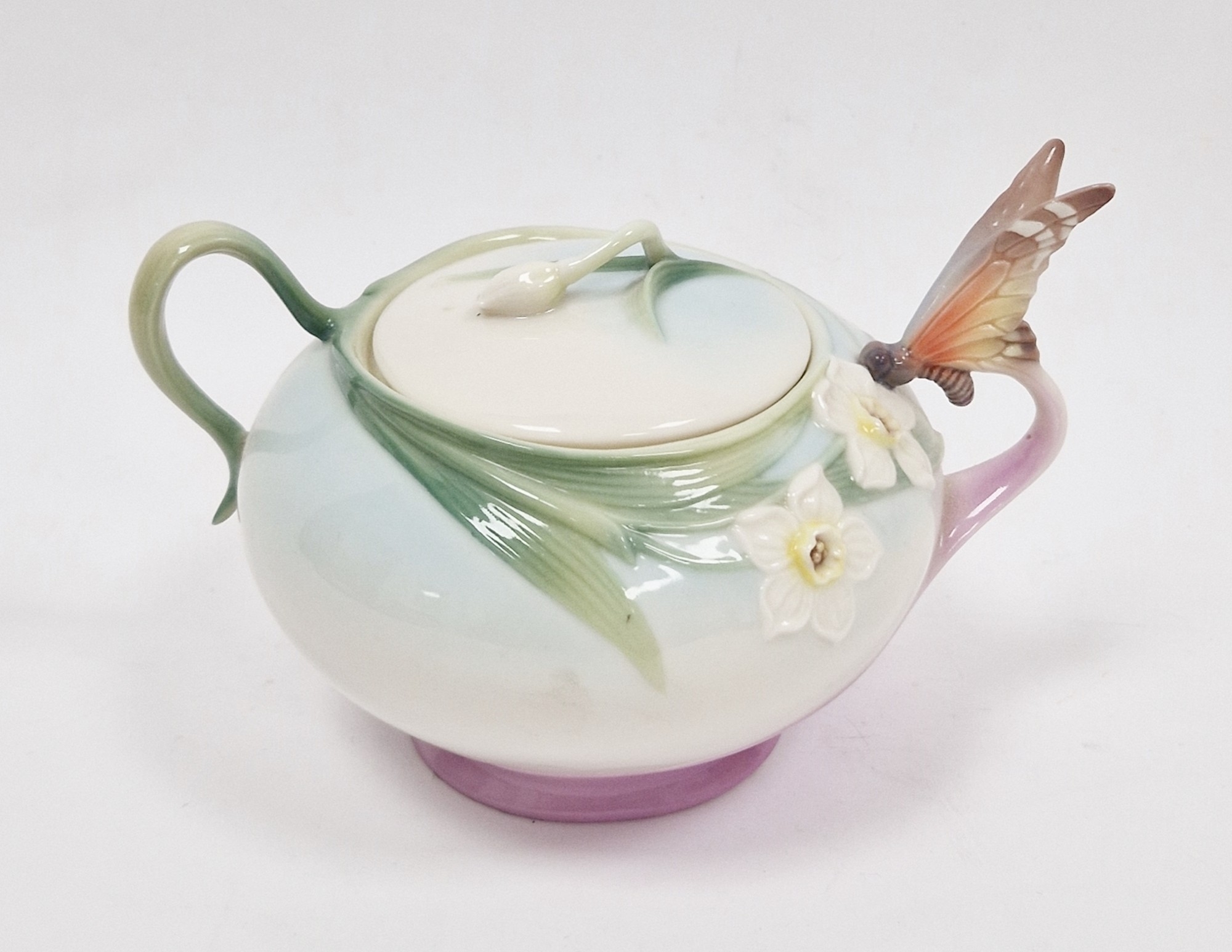 Franz porcelain sugar bowl and cover moulded with flowers with dragonfly handle, printed blue marks, 13cm wide