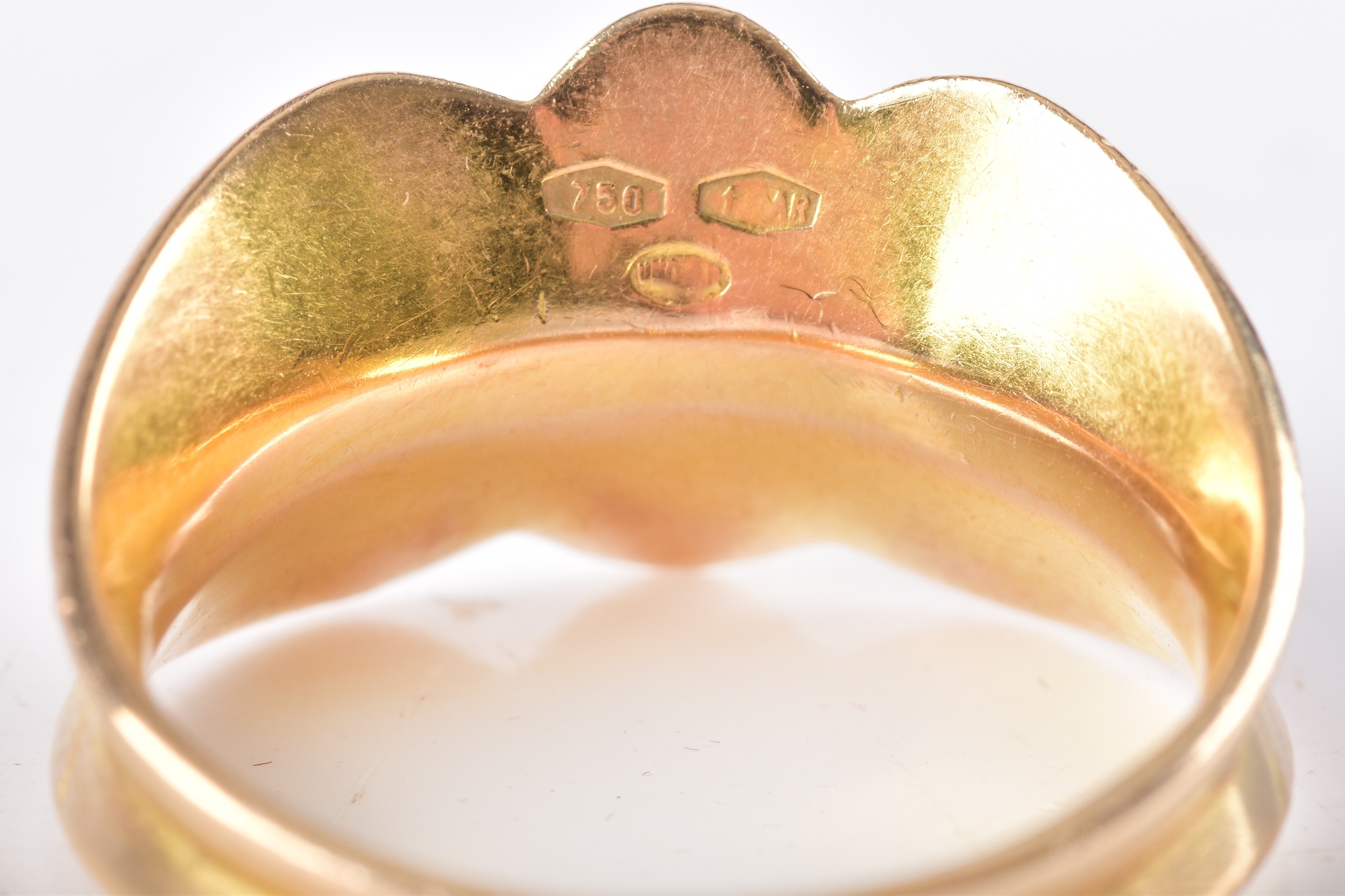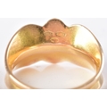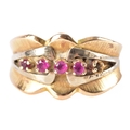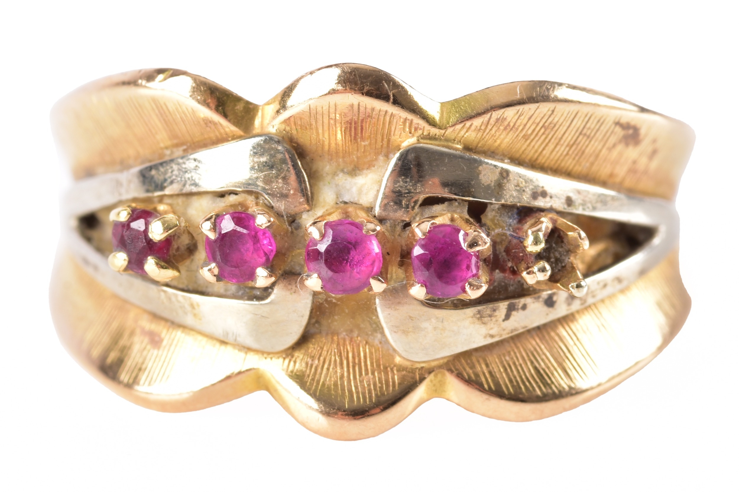 An 18ct yellow and white gold ruby ring, of abstract design, set with four round rubies (missing a stone), the shoulders with textured detailing, leading to a tapering shank, size K.