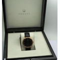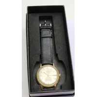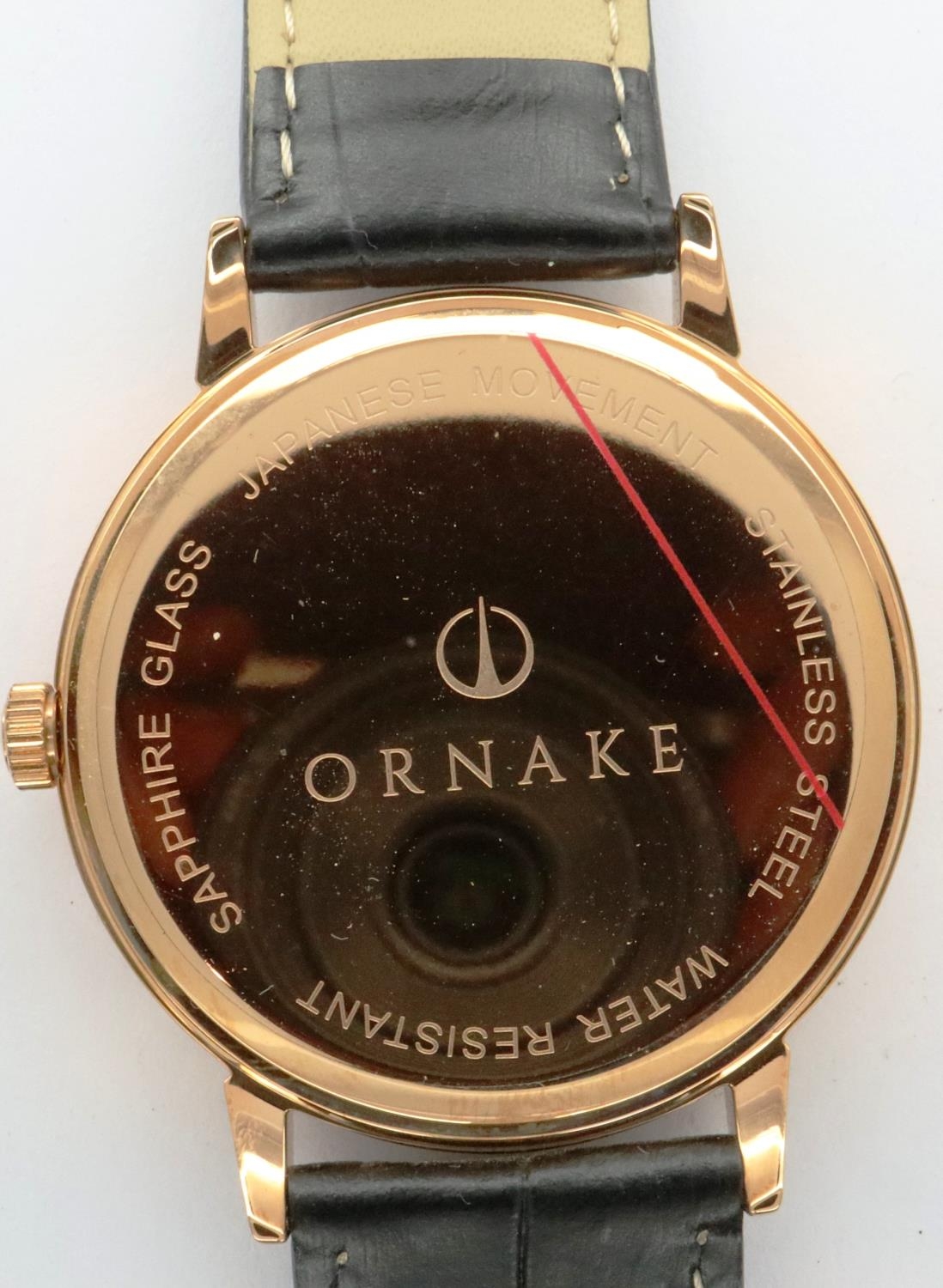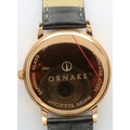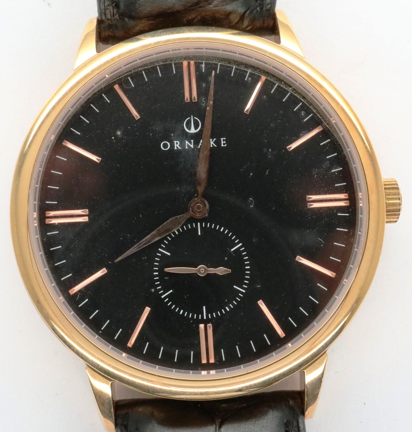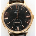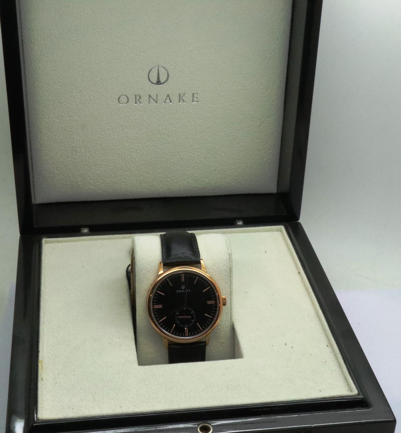 Ornake: new old stock gold plated black dial gents wristwatch with subsidiary seconds dial on a black leather strap, boxed, requires battery. P&P Group 1 (£14+VAT for the first lot and £1+VAT for subsequent lots)