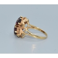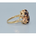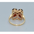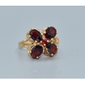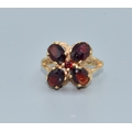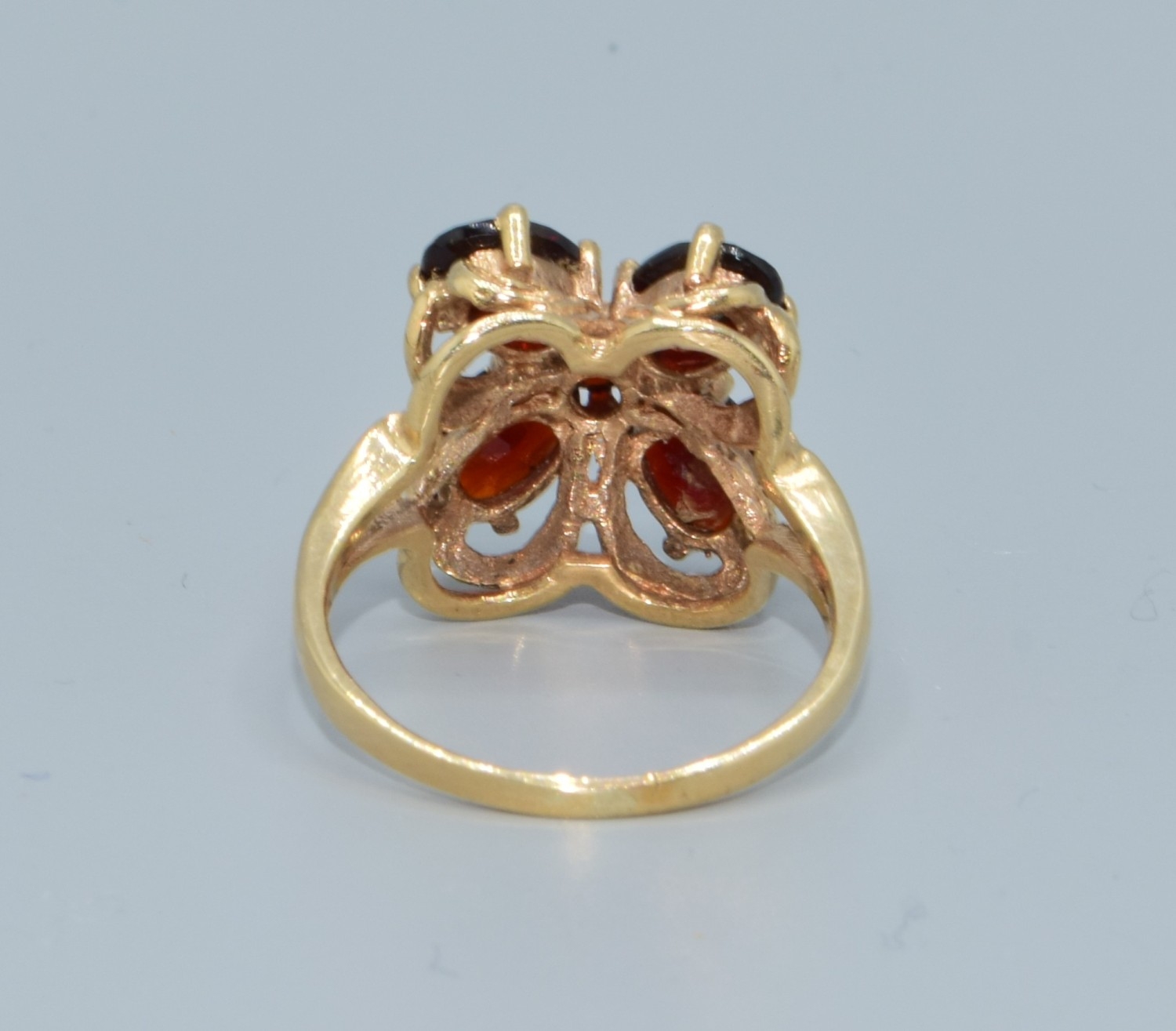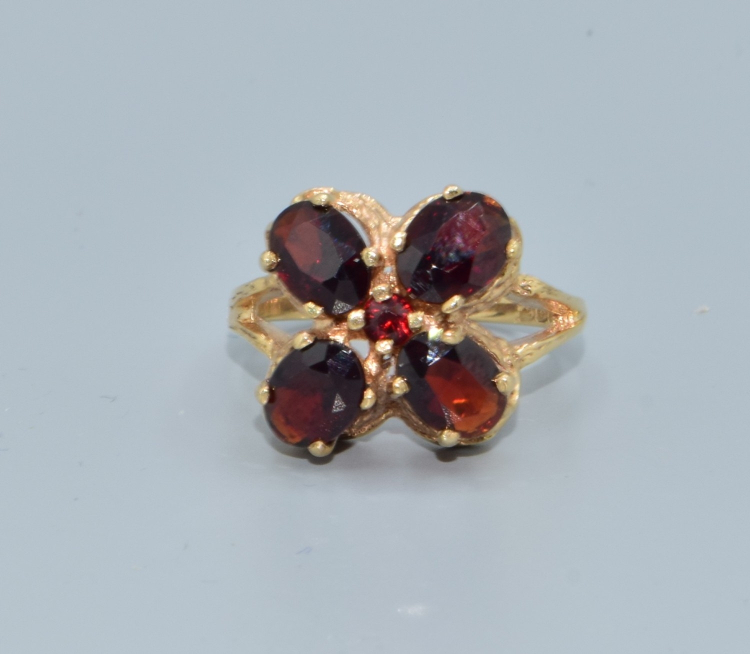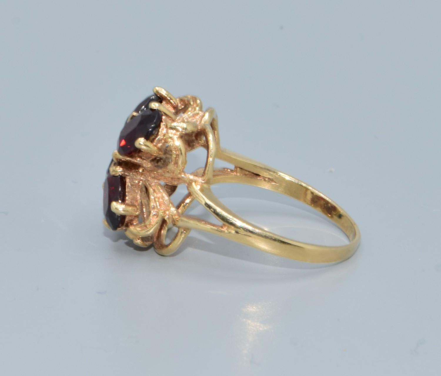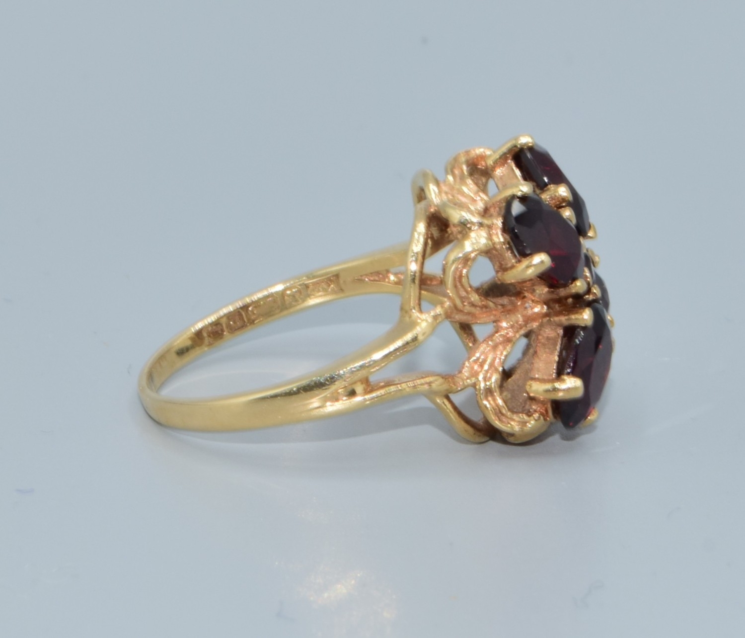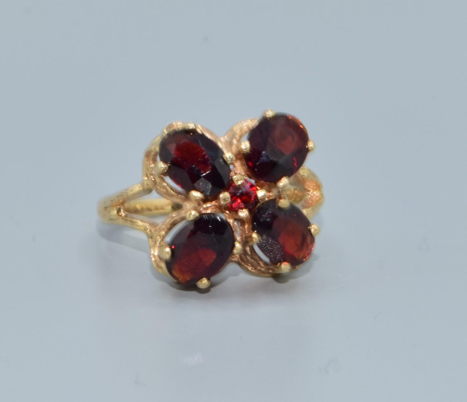 9ct gold ladies heavy vintage 4 leaf clover design Garnet cocktail ring in a claw open work setting size O 4.3grms