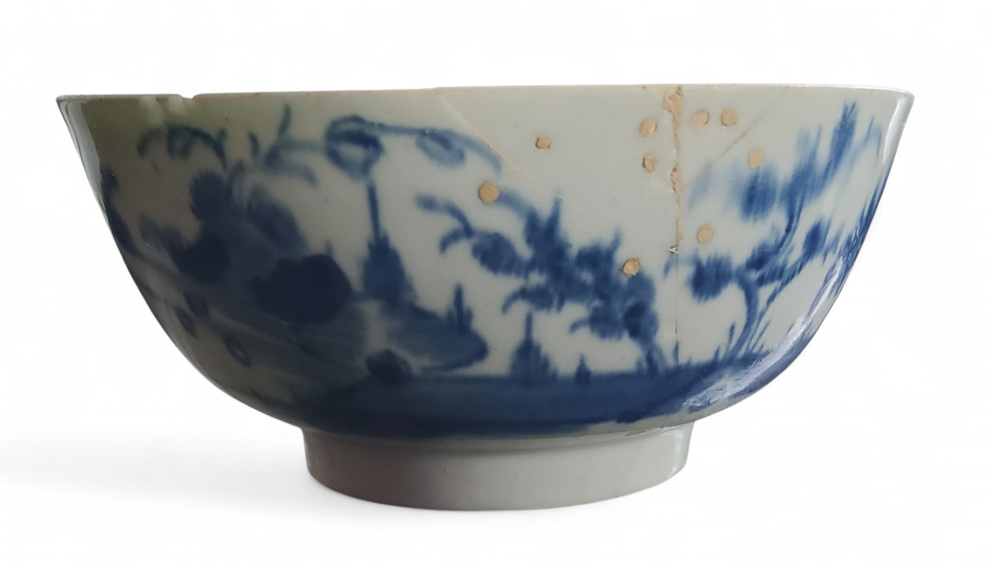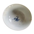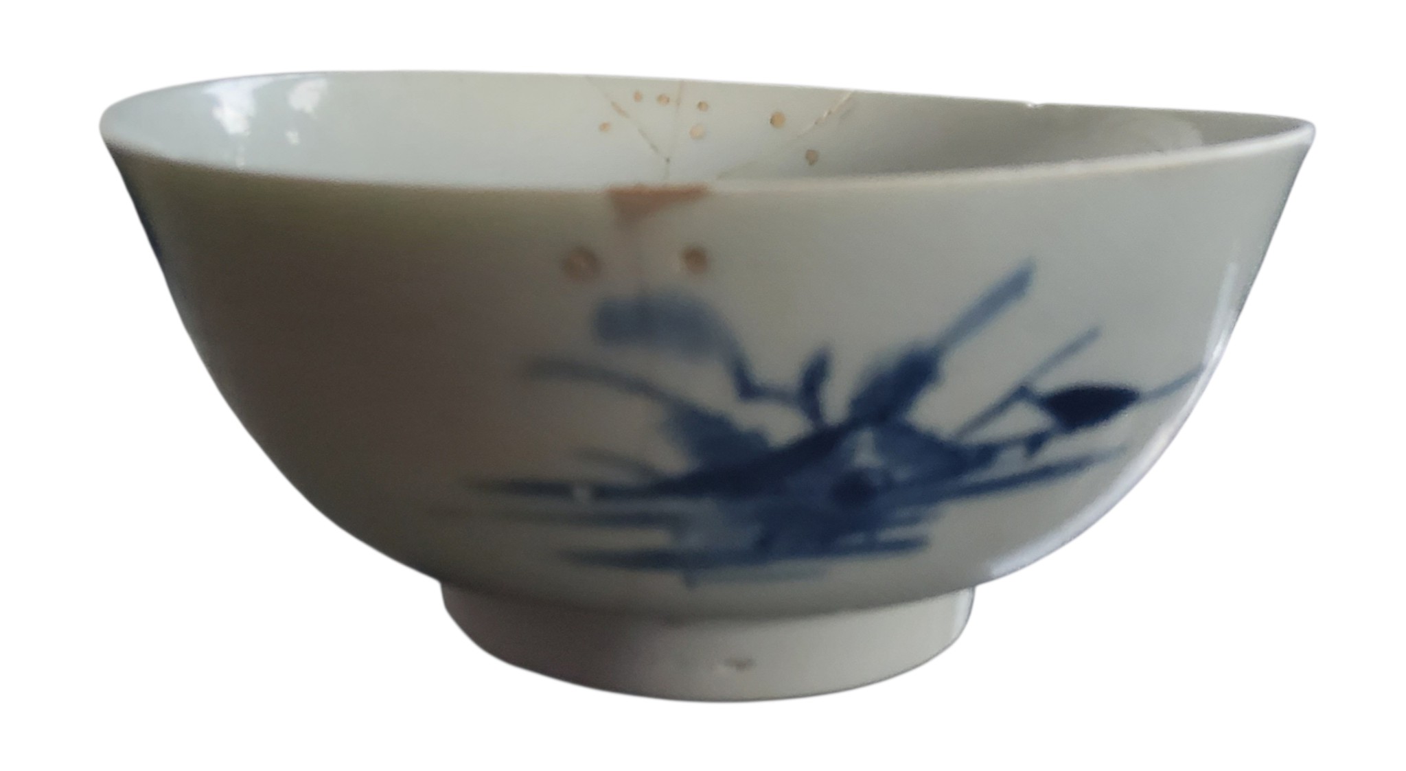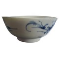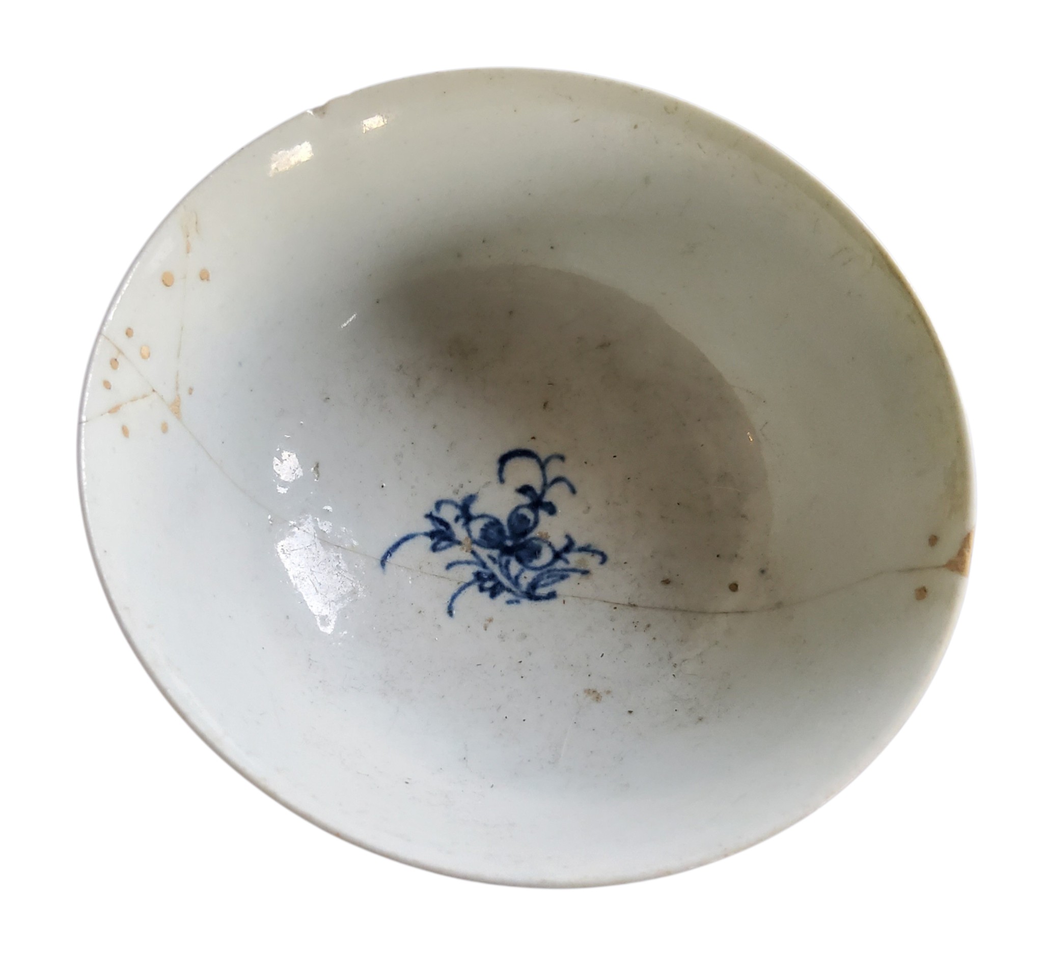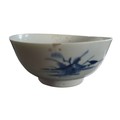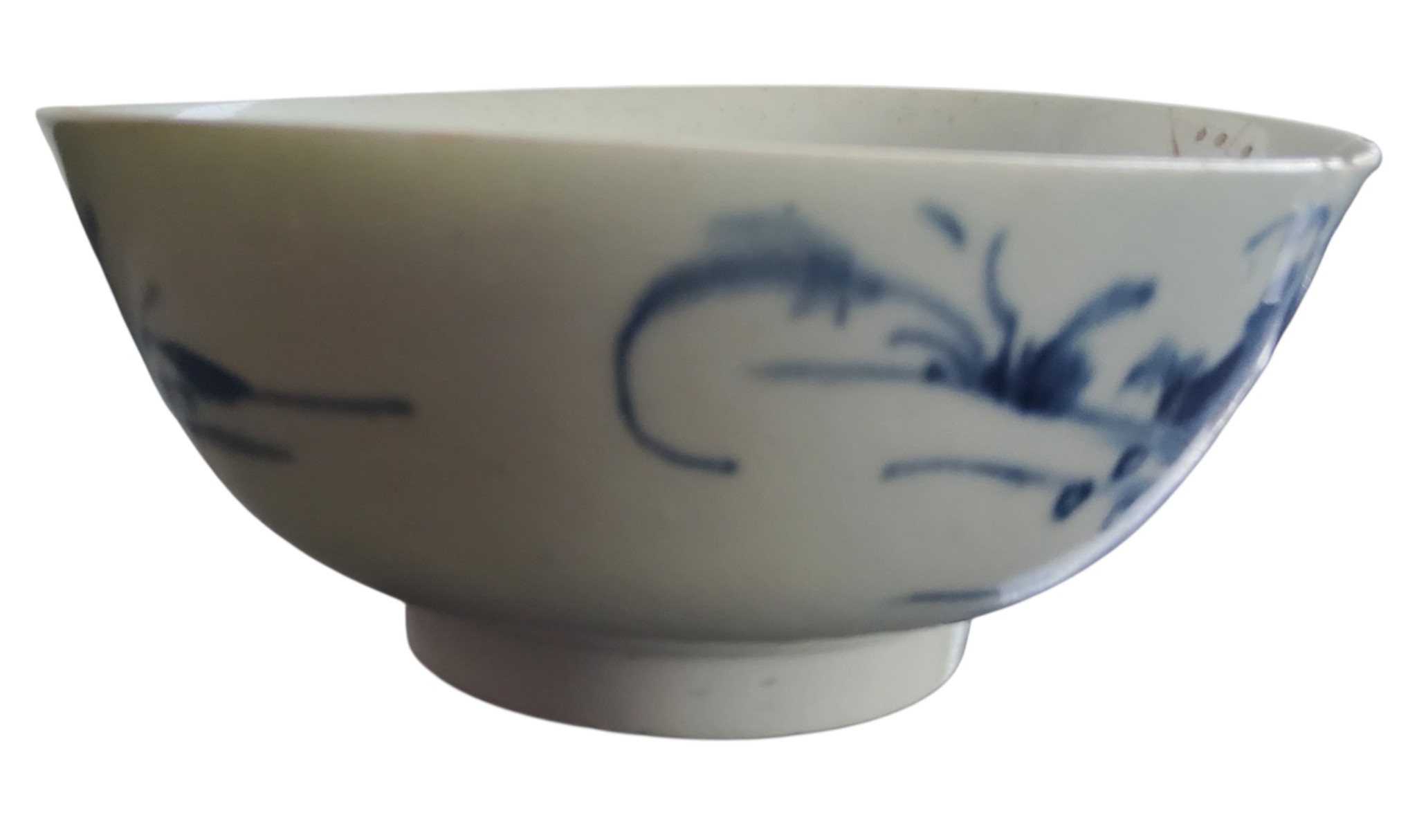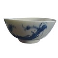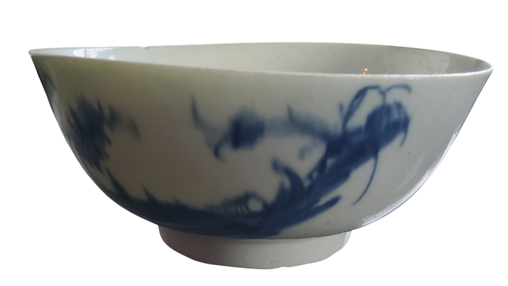 A Longton Hall bowl, decorated in cobalt blue with landscape, pine trees and rockwork,11.5cm diam, c.1749-60