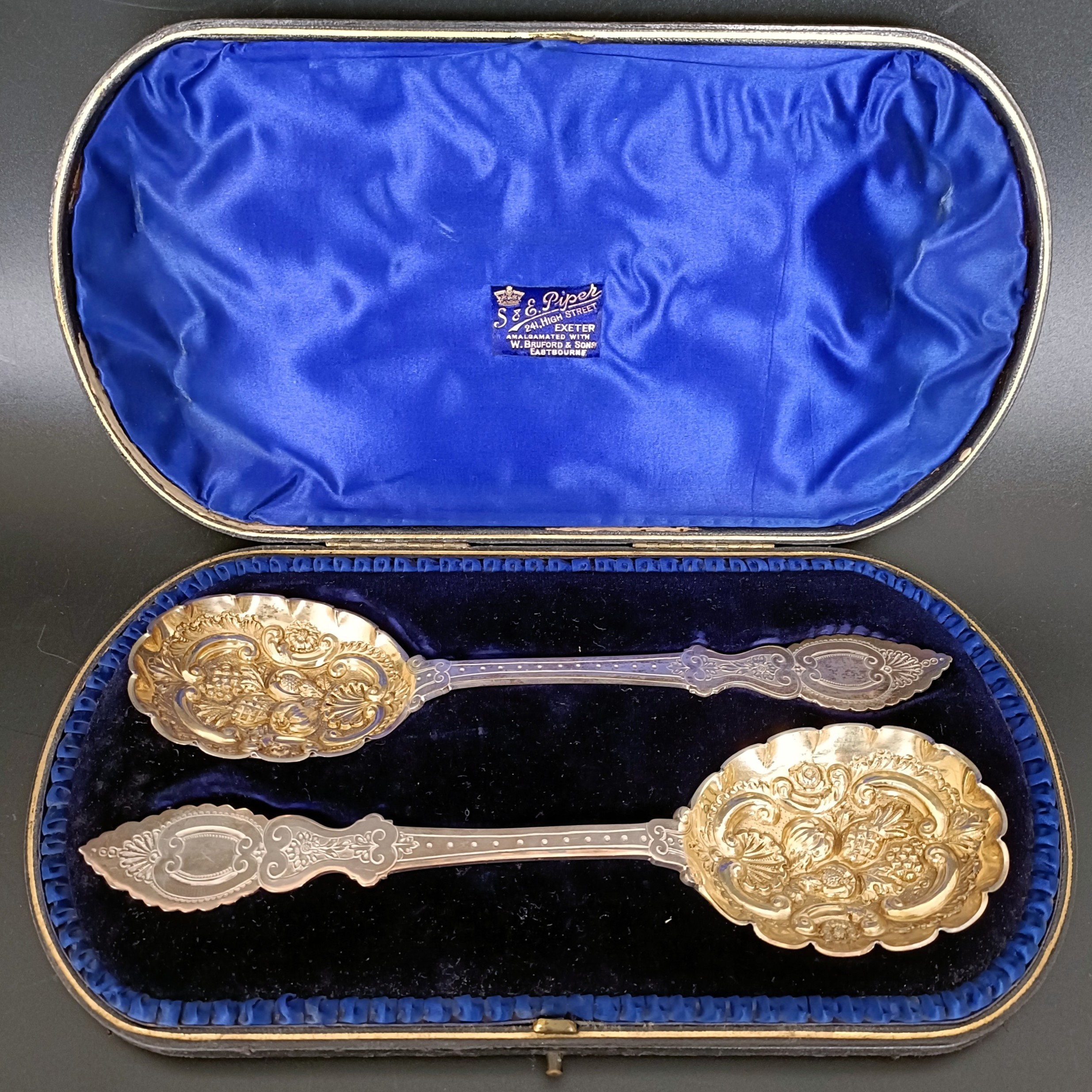 A pair of late Victorian silver berry spoons, London, 1896, 5.8 ozt, 24 cm, cased