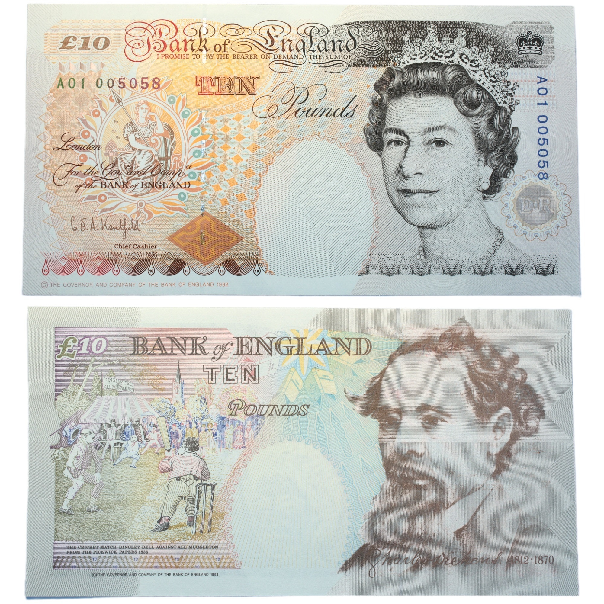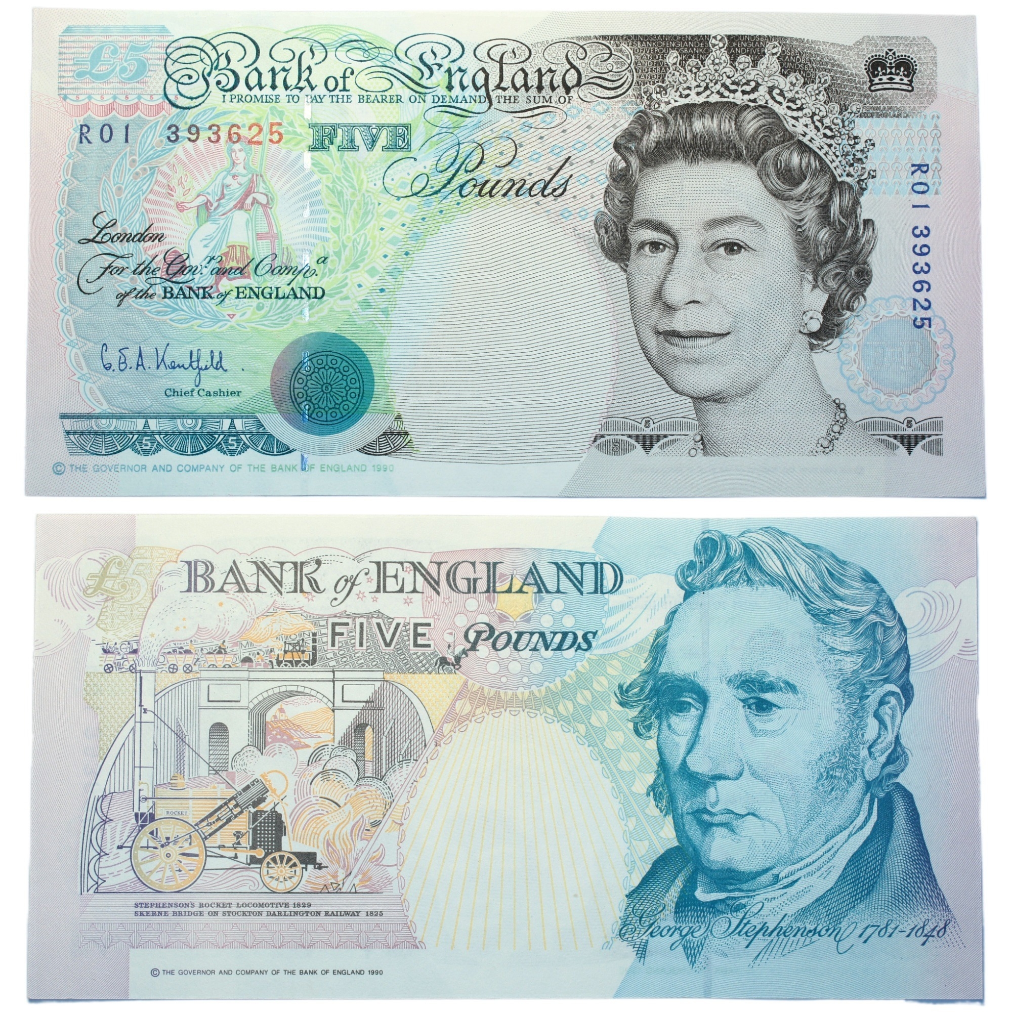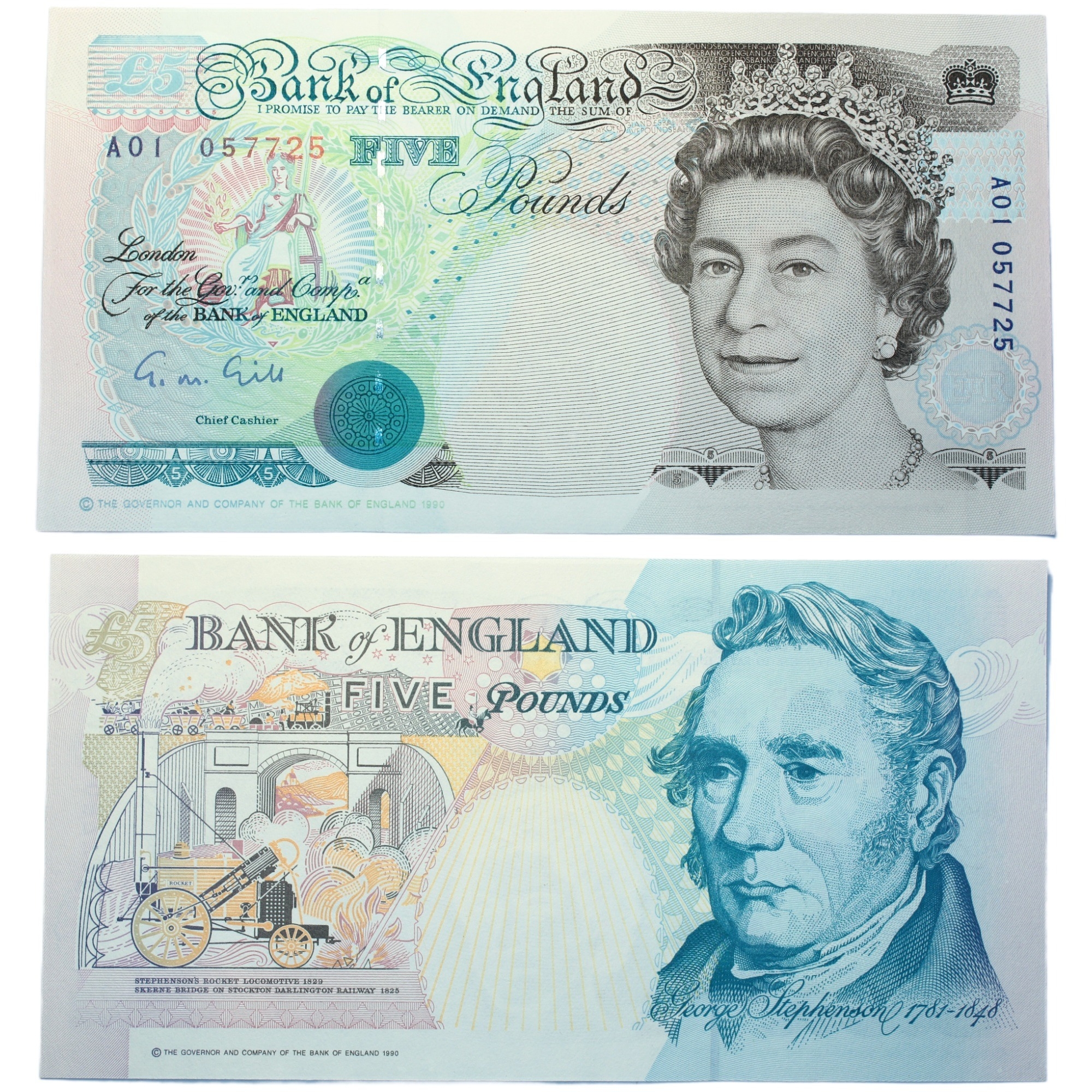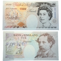 Bank of England (7) Ten Pounds and Five Pounds G.M. Gill, Five Pounds, prefix A01 first run, (Dugg. B357); G.E.A. Kentfield (4), Ten Pounds (2), prefixes A01 first run and KE30, (Dugg. B366 and B369); Five Pounds (2), R01 first run, and BD80, (Dugg. B362 and B364); Merlyn Lowther (2), Ten Pounds and Five Pounds, prefixes LA31 and EB39, (Dugg. A382 and A380). Uncirculated