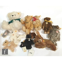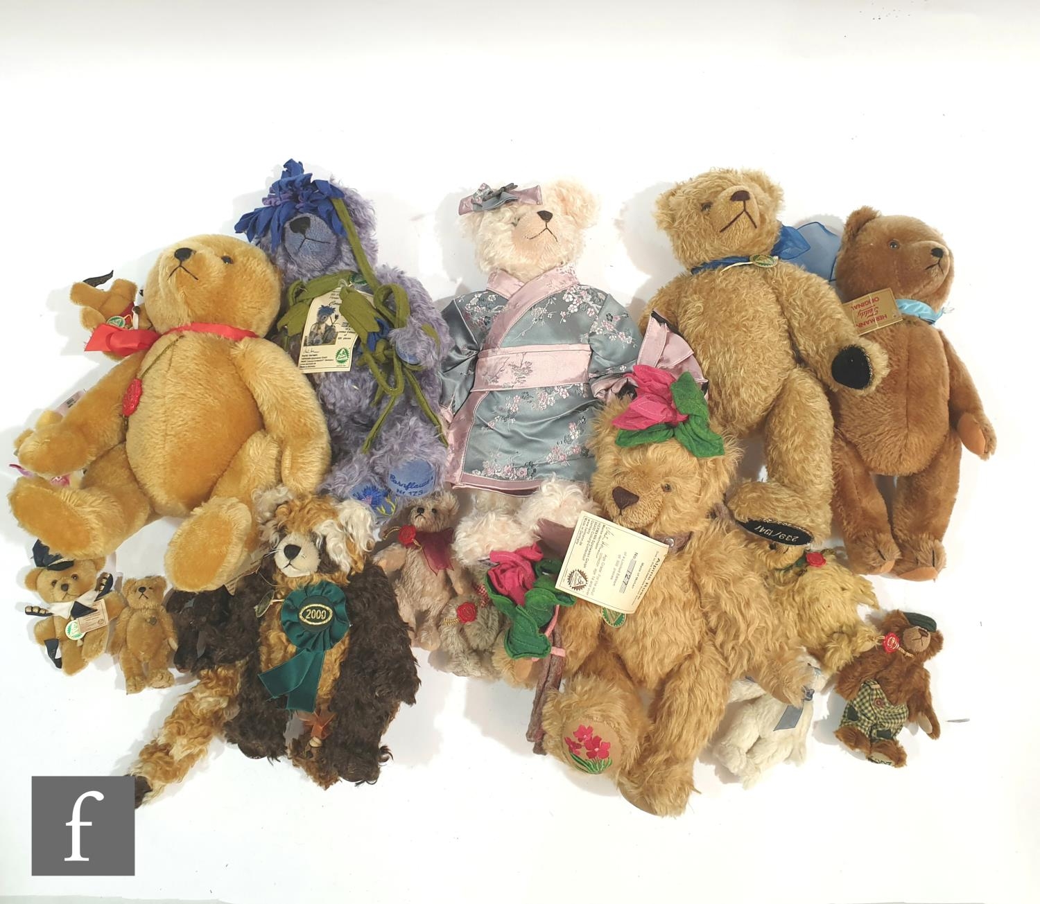 A collection of Hermann teddy bears, to include Cornflower, limited edition 173 of 500, cornflower mohair, height 31cm, Alpine Rose, limited edition 127 of 500, Decade Bears Miniature Edition 2000, limited edition 51 of 100, Concorde Pin Bear, 2008 Pin Bear, Nelson Pin Bear, etc. (qty)