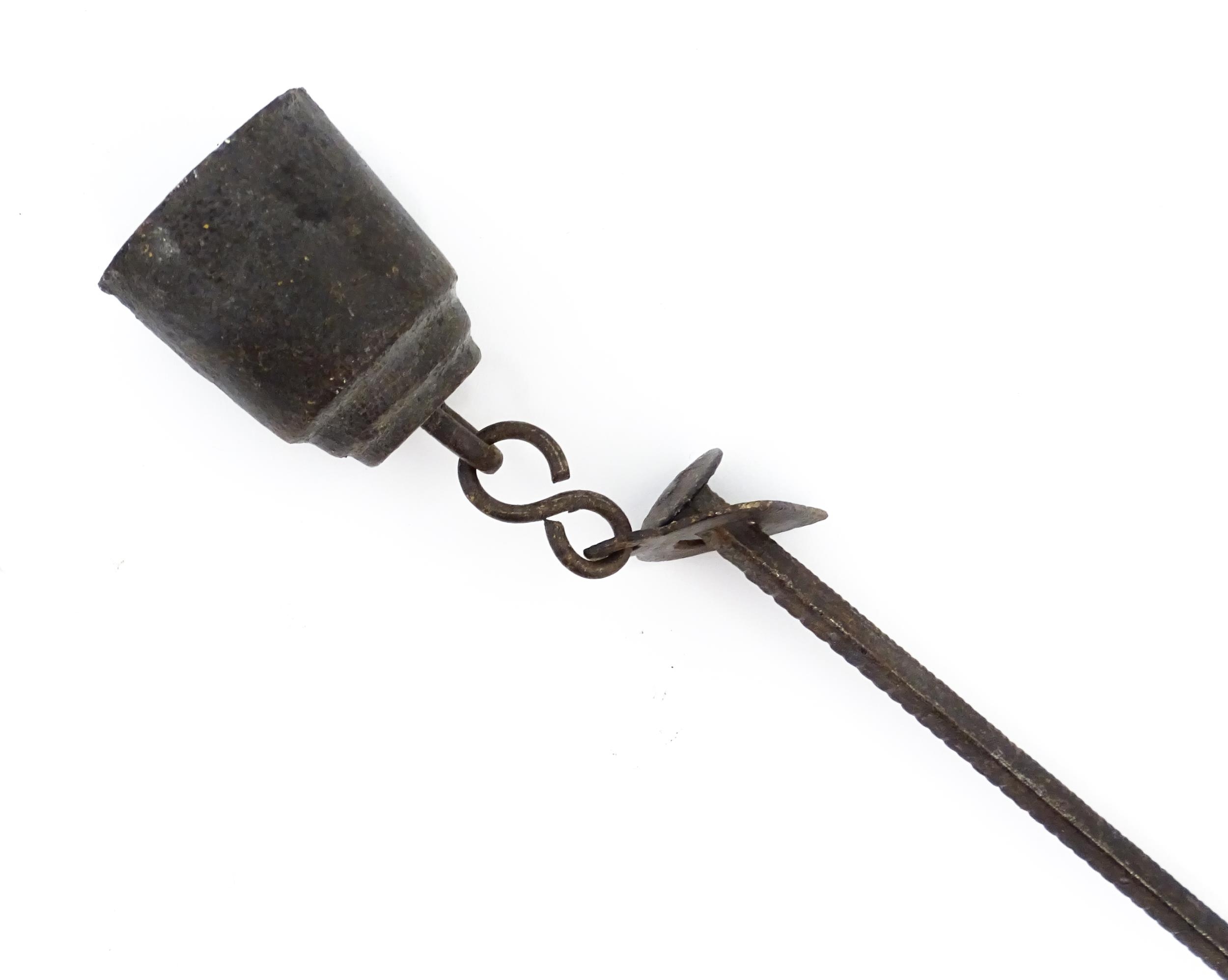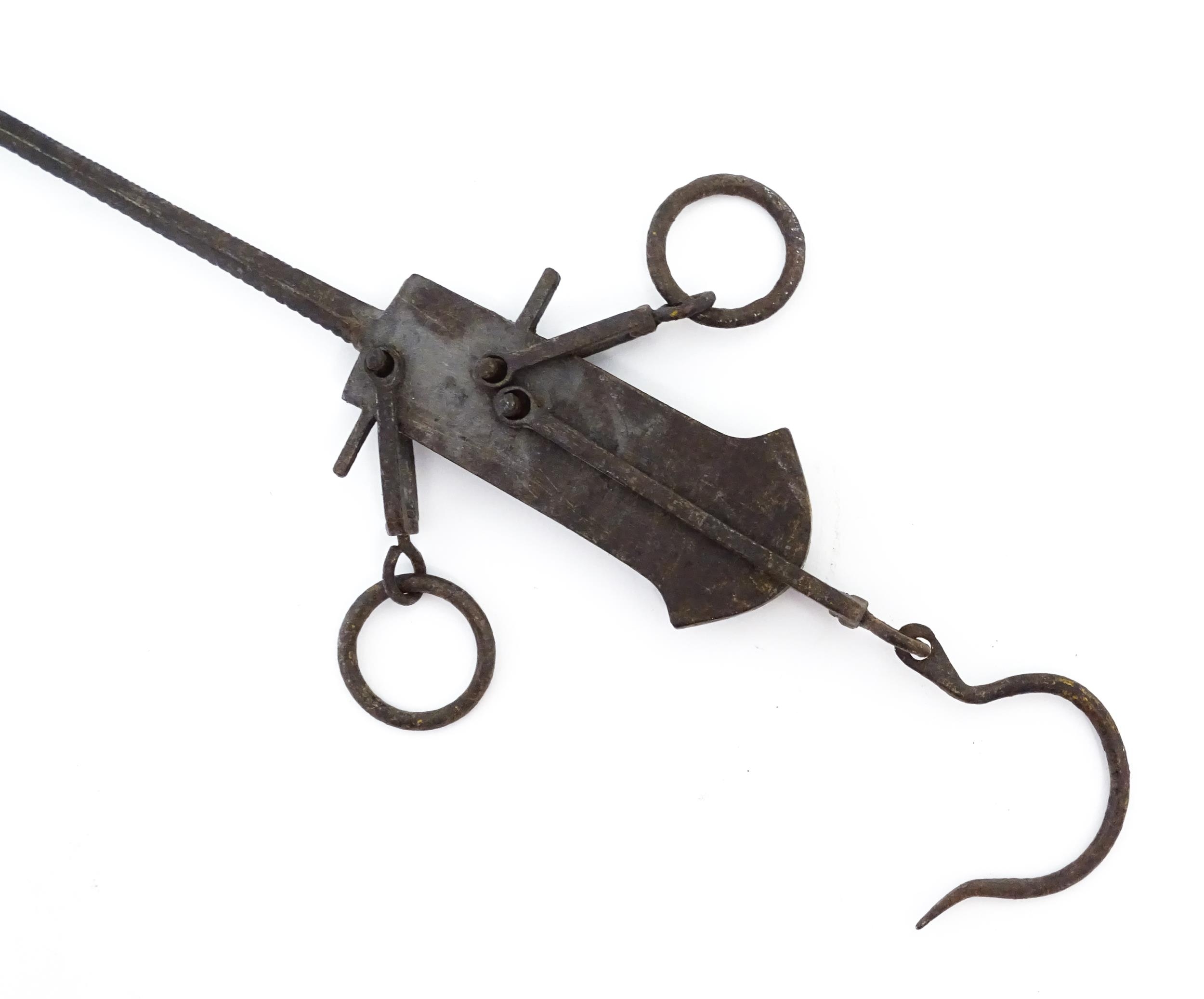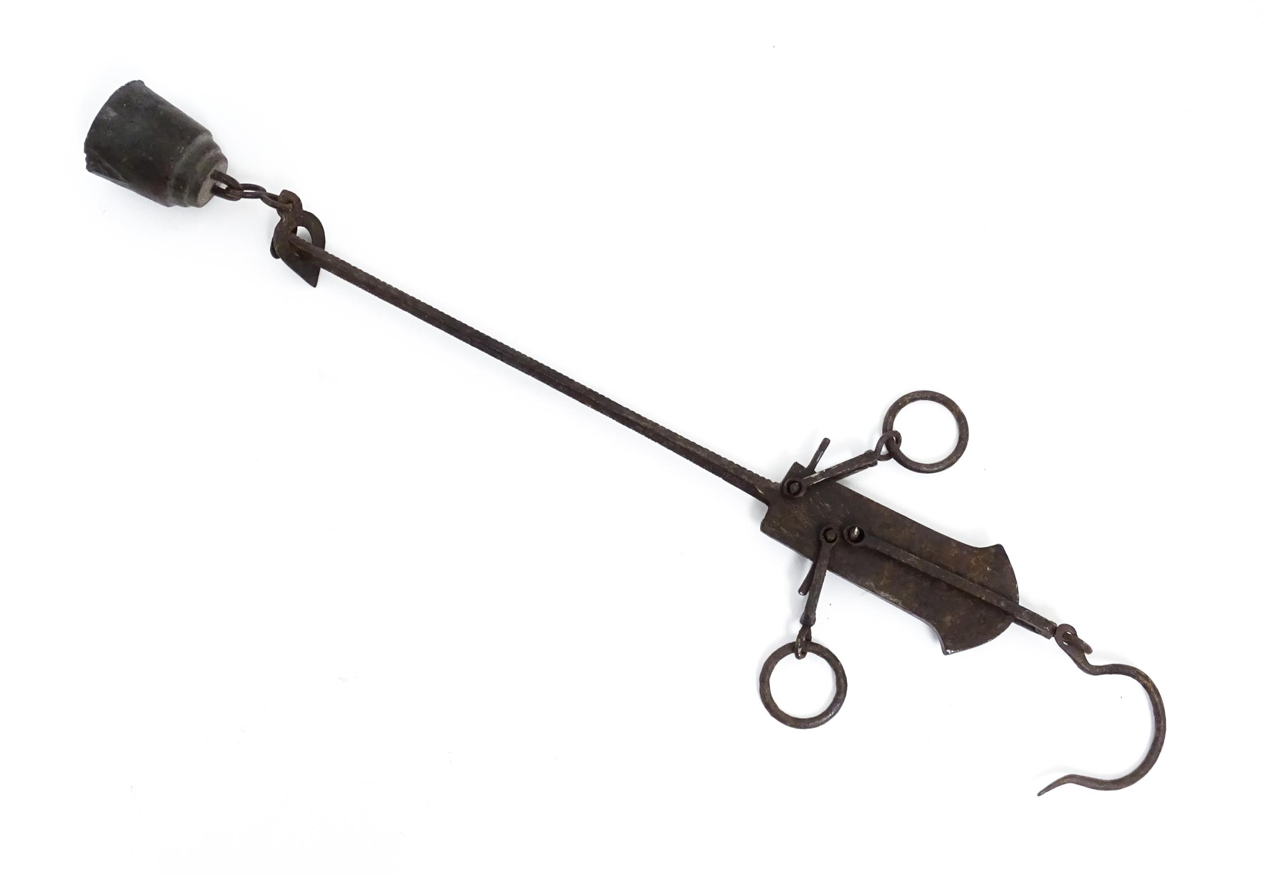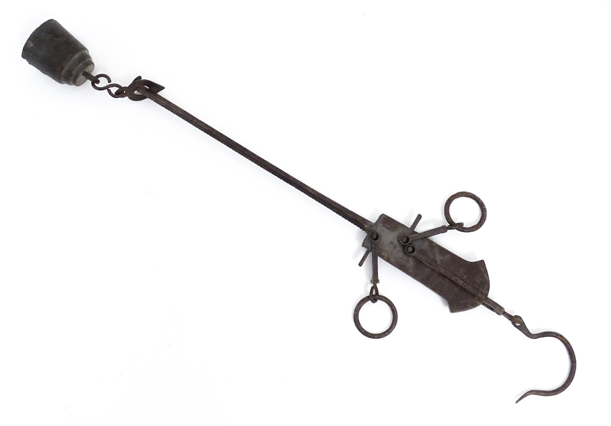 A 20thC balance beam / bar hanging scale with hook and weight. Approx. 14 1/2" long