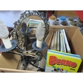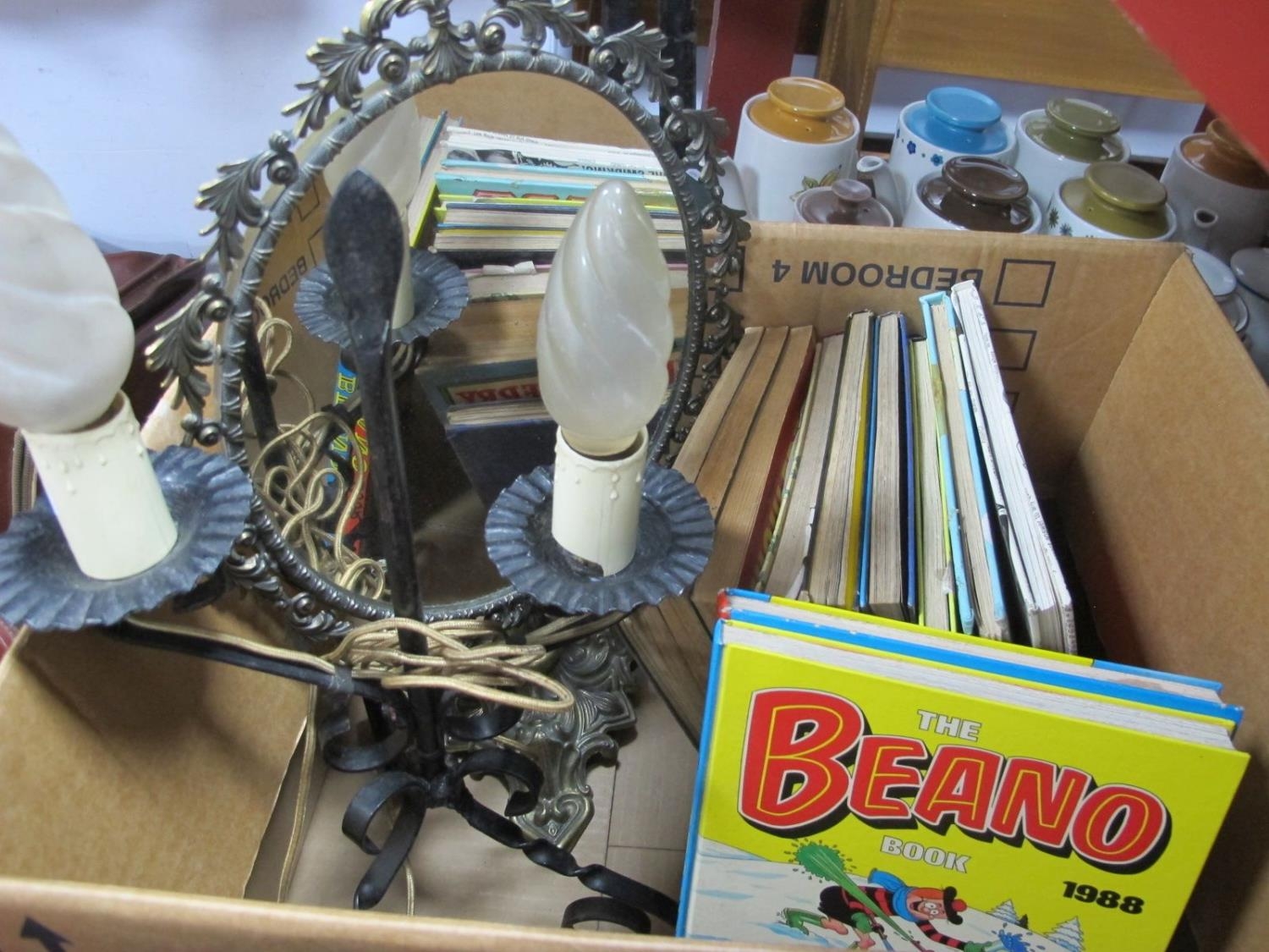 Ornate Brass Dressing Table Mirror, two branch table lamp, children's books, etc:- One Box