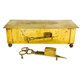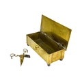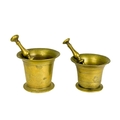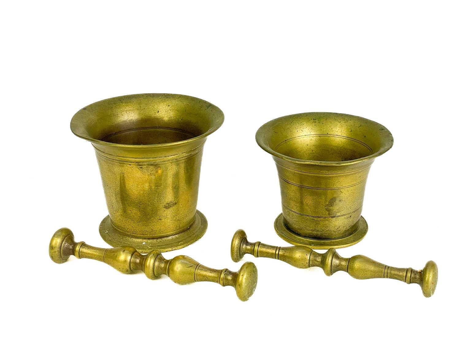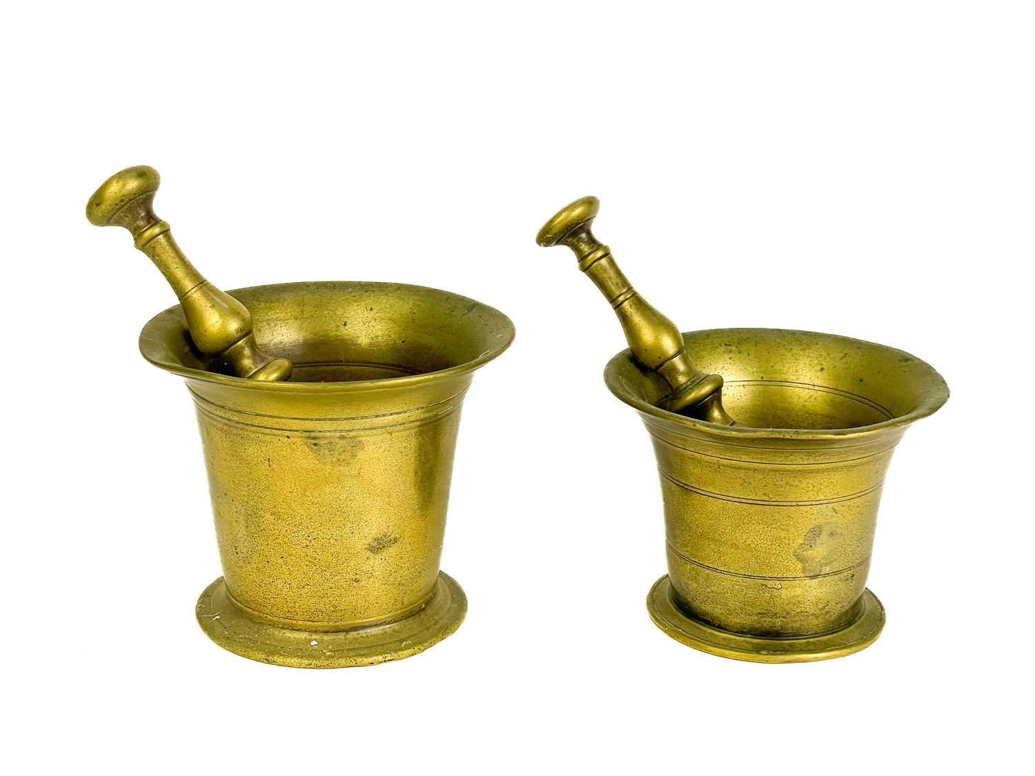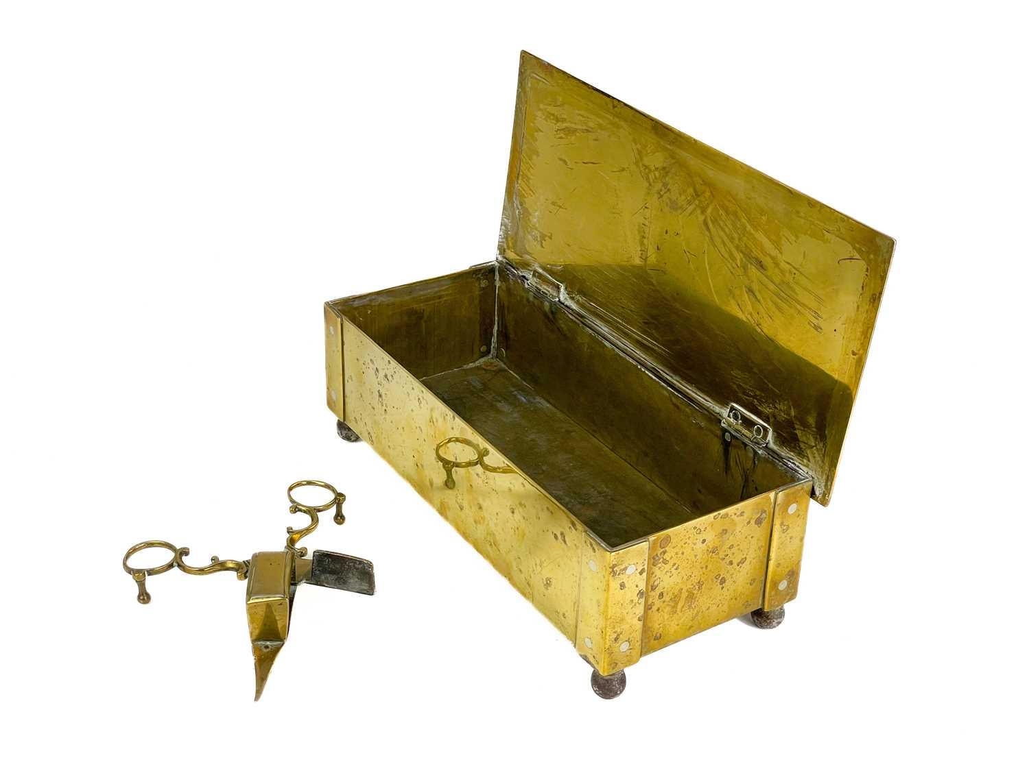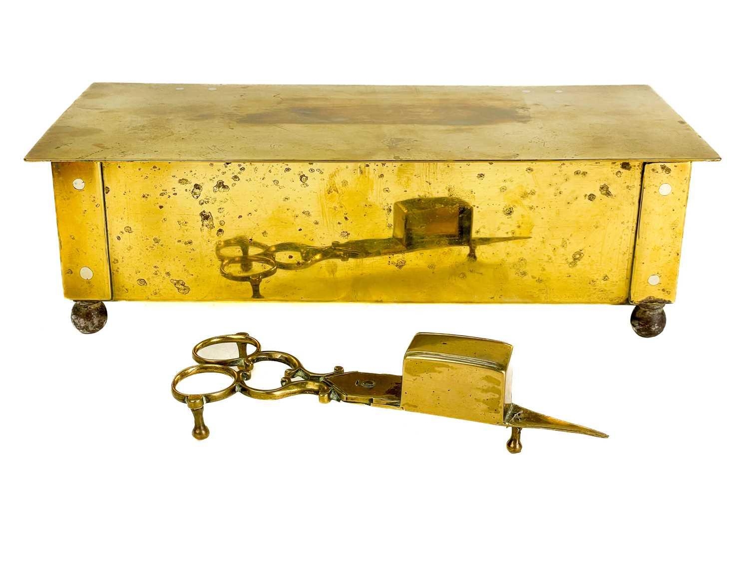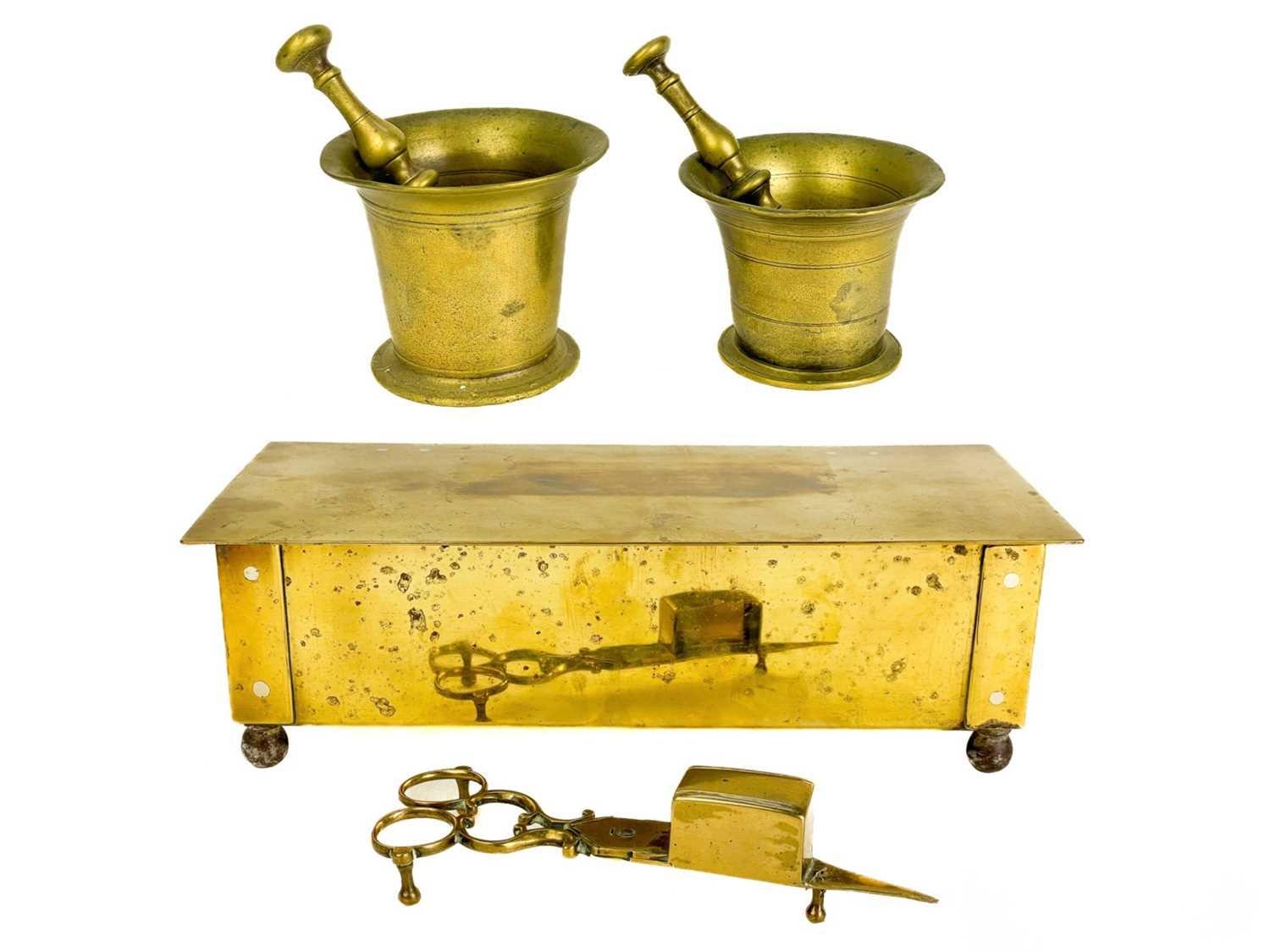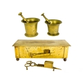 A 19th century brass pestle and mortar. Height 10.3cm together with another brass pestle and mortar, a pair of brass candle scissors and a brass rectangular box. (4)