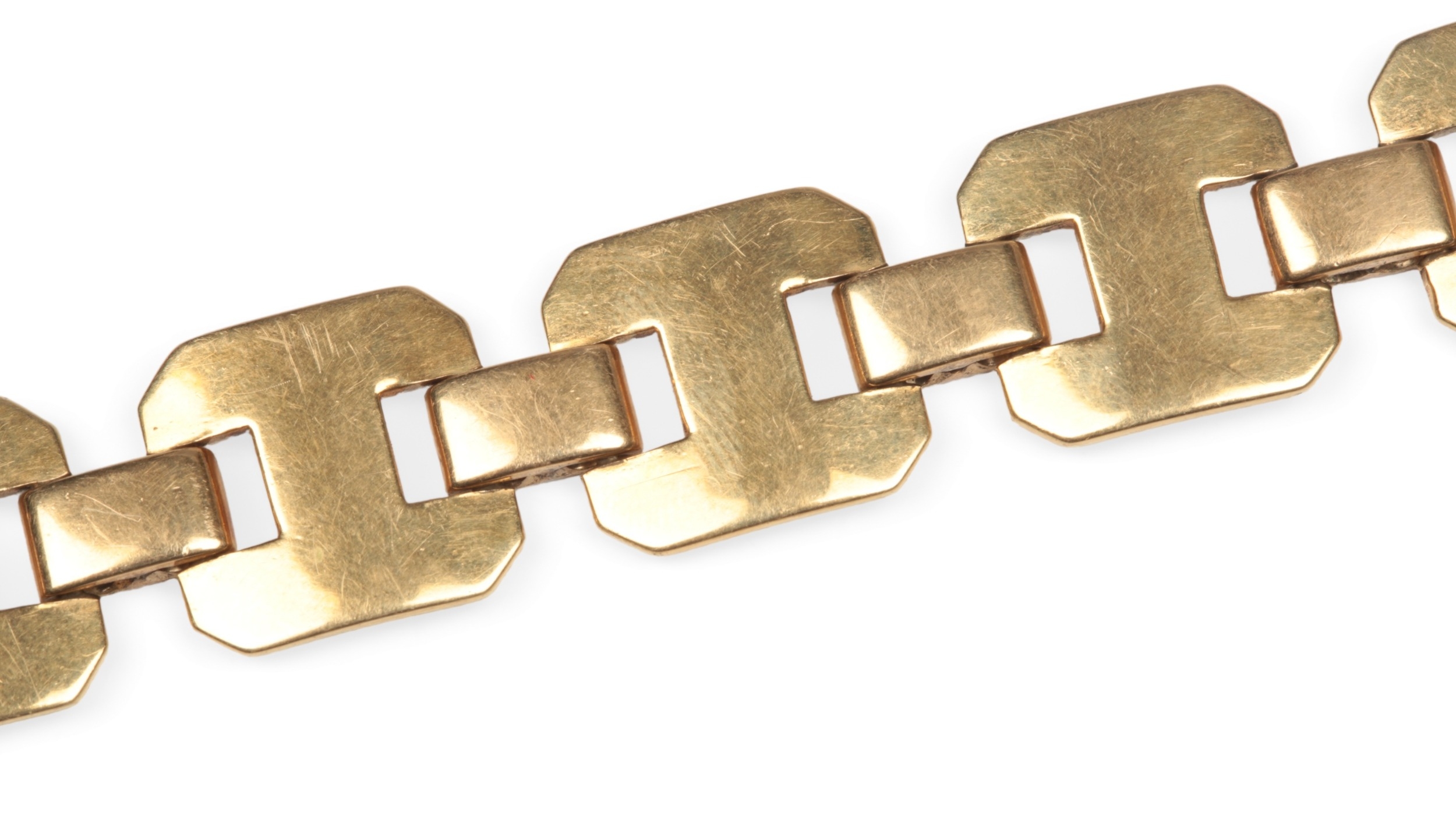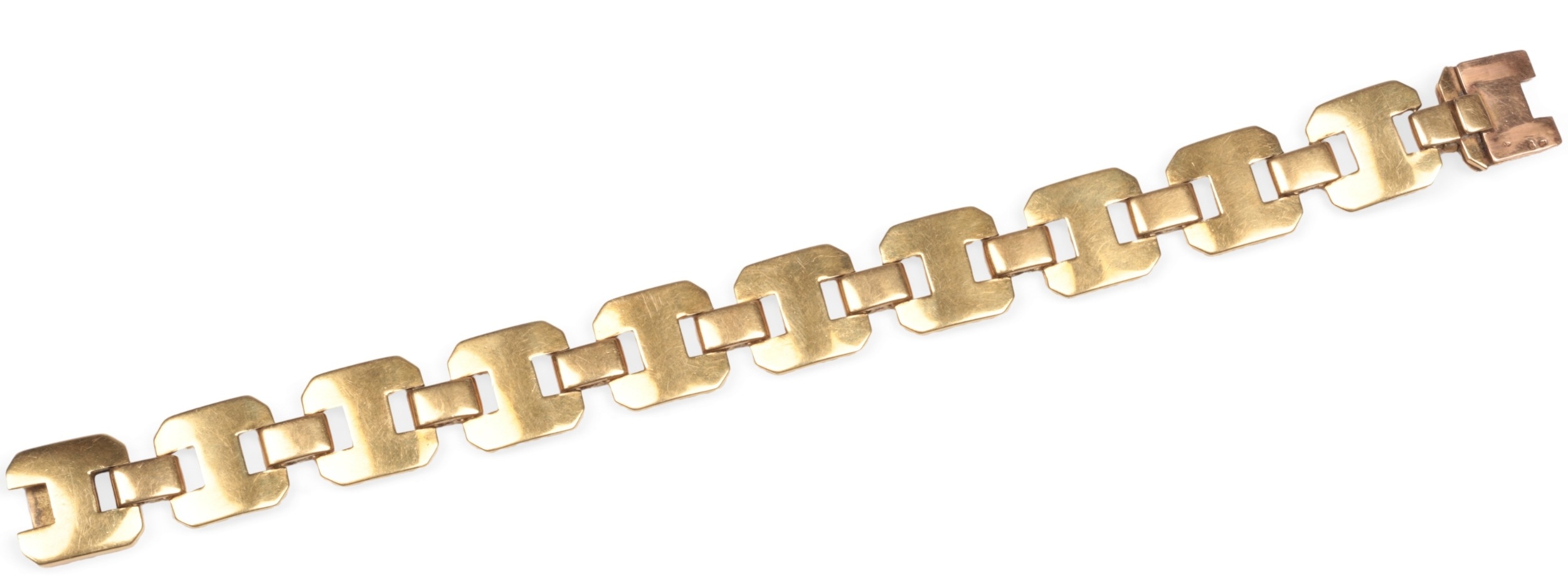 Georges Lenfant, a gold bracelet, France, mid 20th century, composed of geometric links, to a concealed clasp, length 20.5cm, French assay marks for 18ct gold, maker's mark for Georges Lenfant, gross weight approximately 54 grams