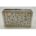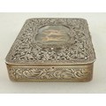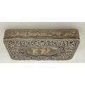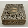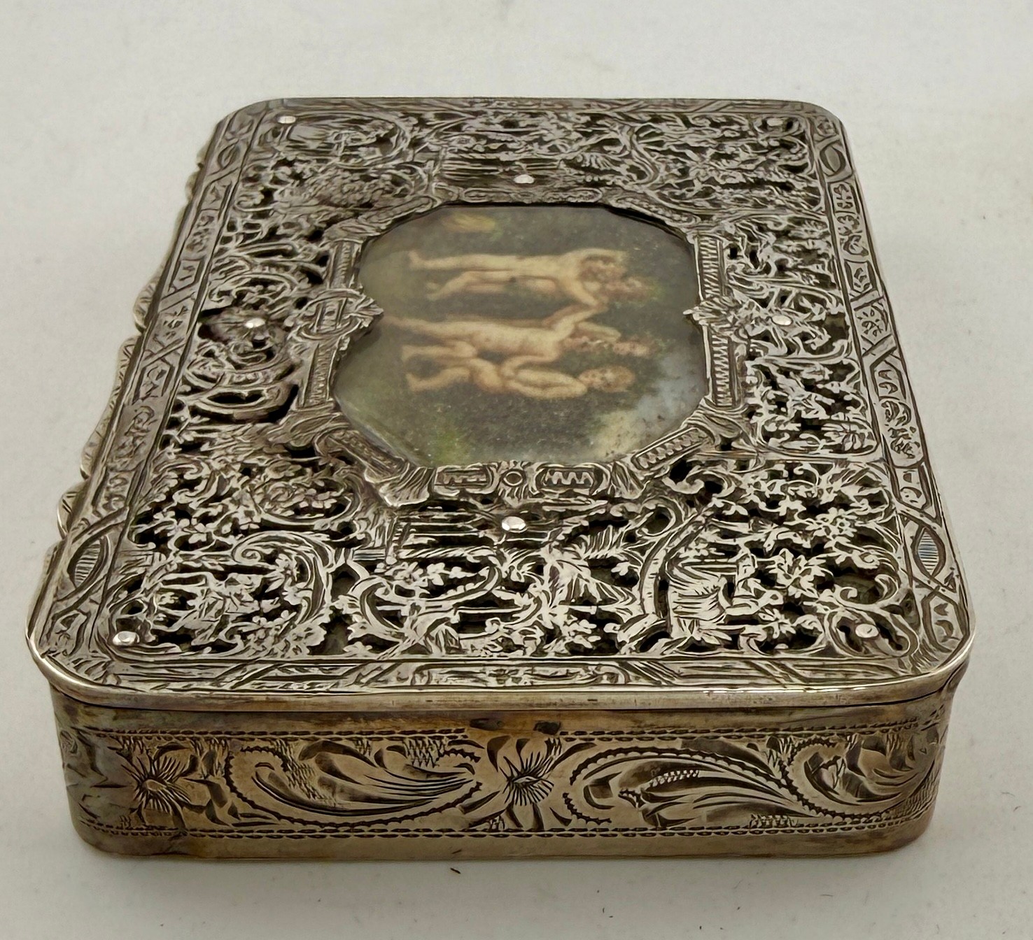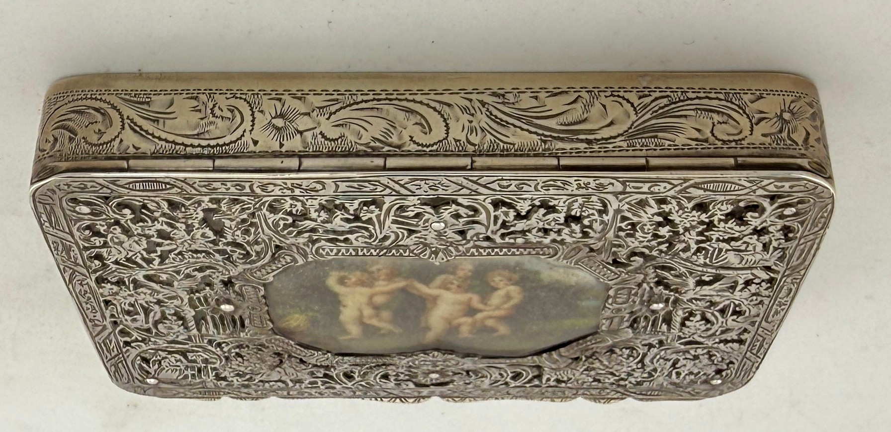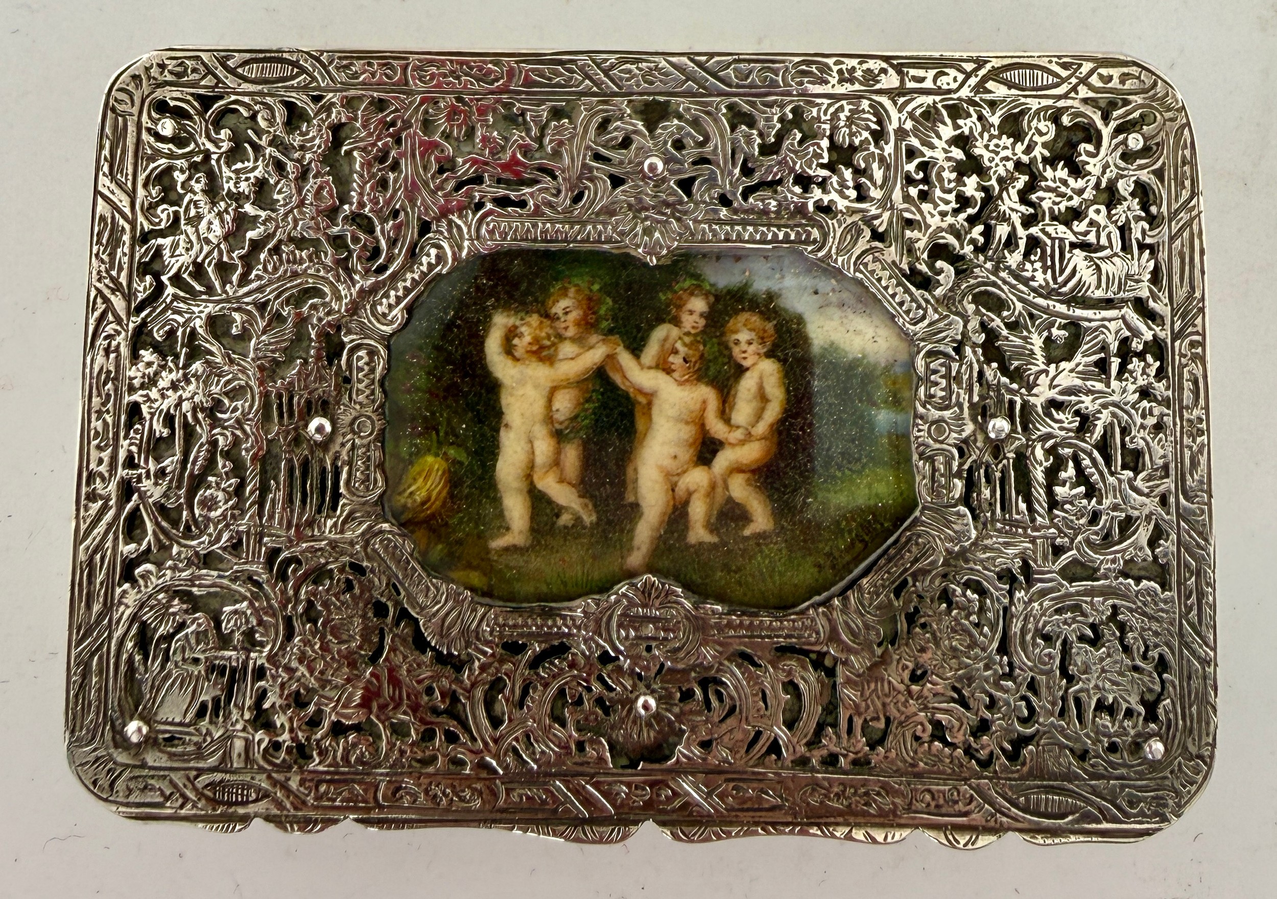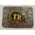 An Austro-Hungarian .800 white metal box with intricate filigree decoration with a hand painted panel depicting cherubs. Hallmarked for Pest, Hungary. Maker’s mark KT, Krausz Testverek. 9cm x 6cm x 1.5cm. Weight 119gm.