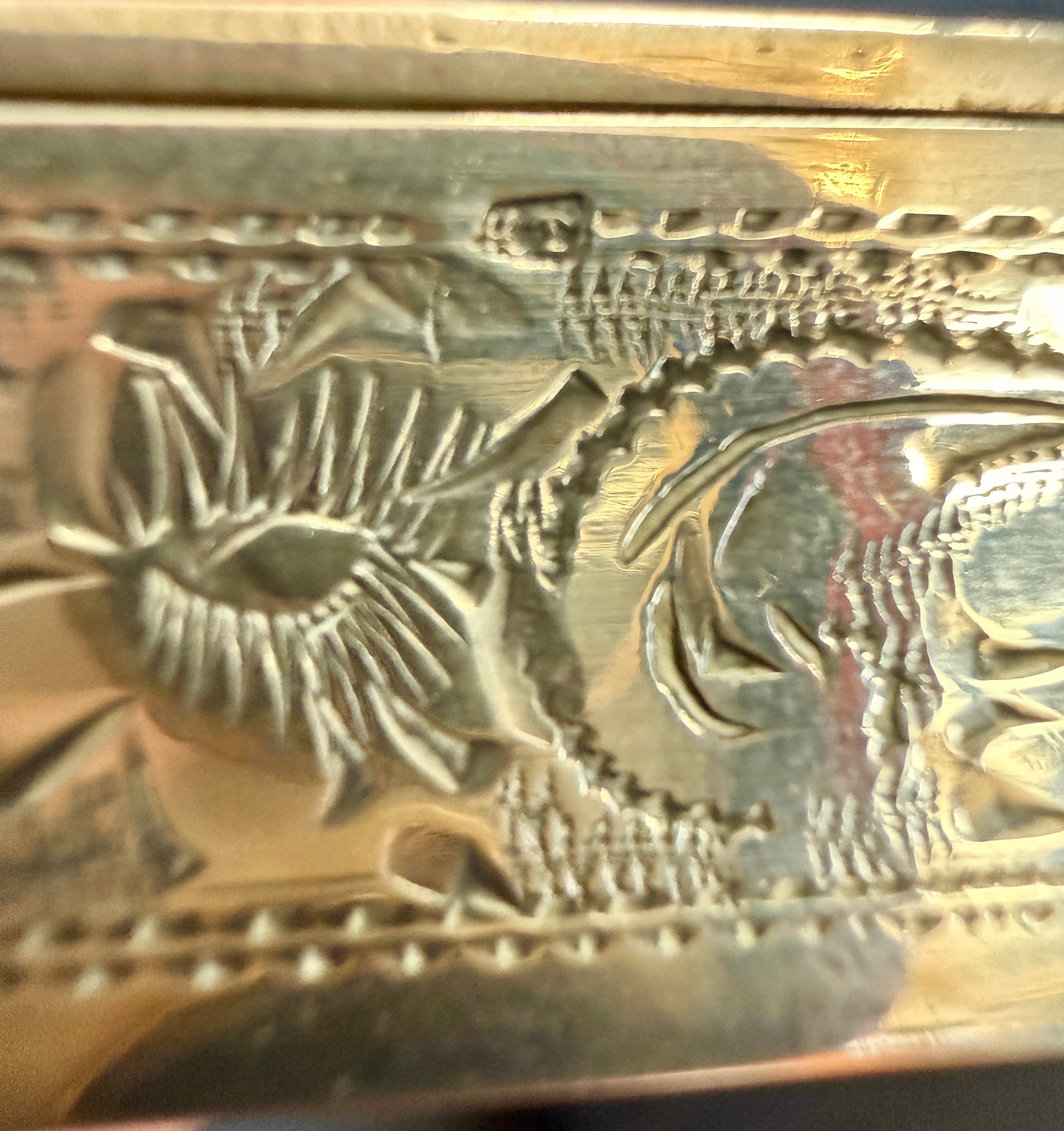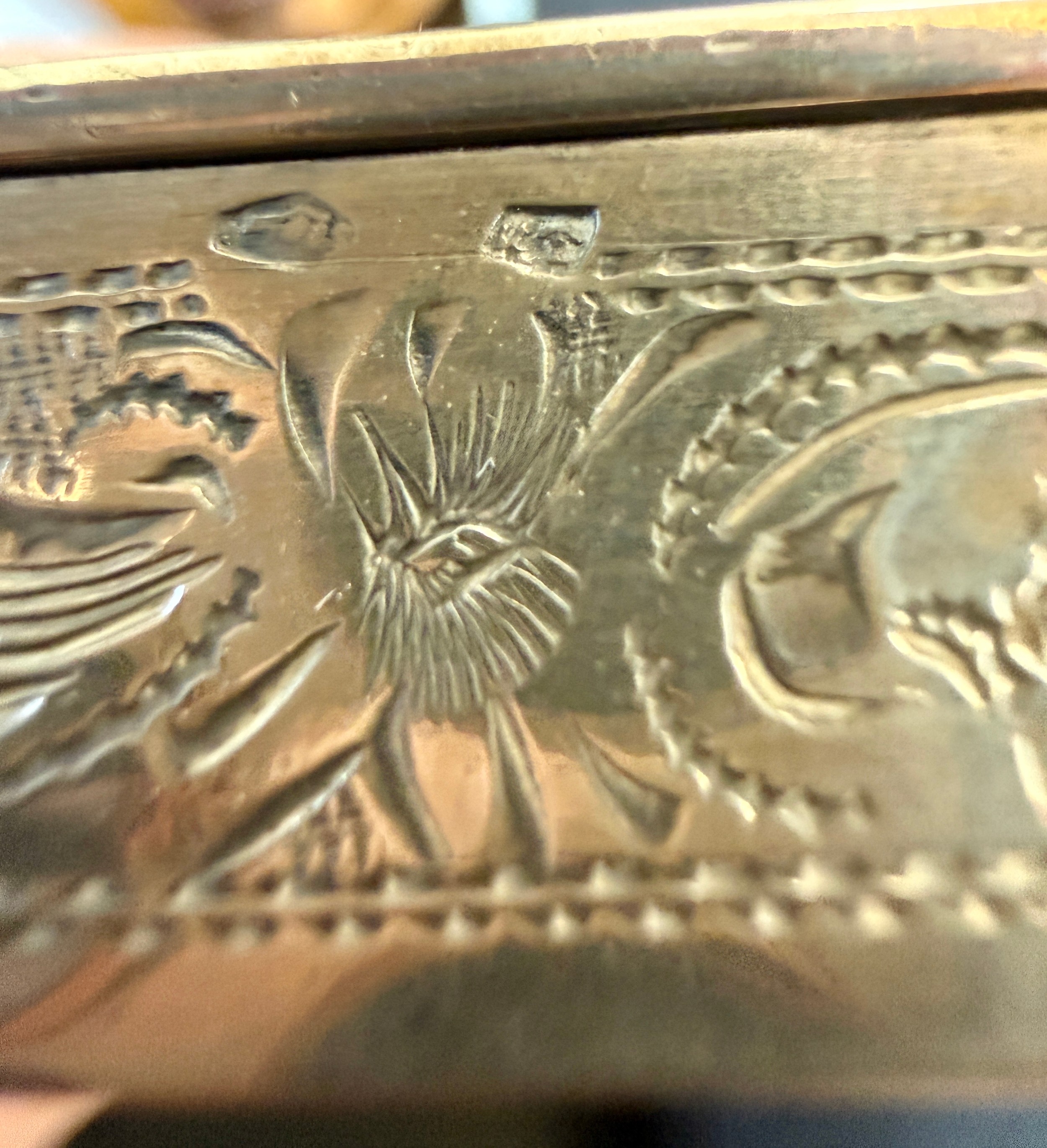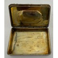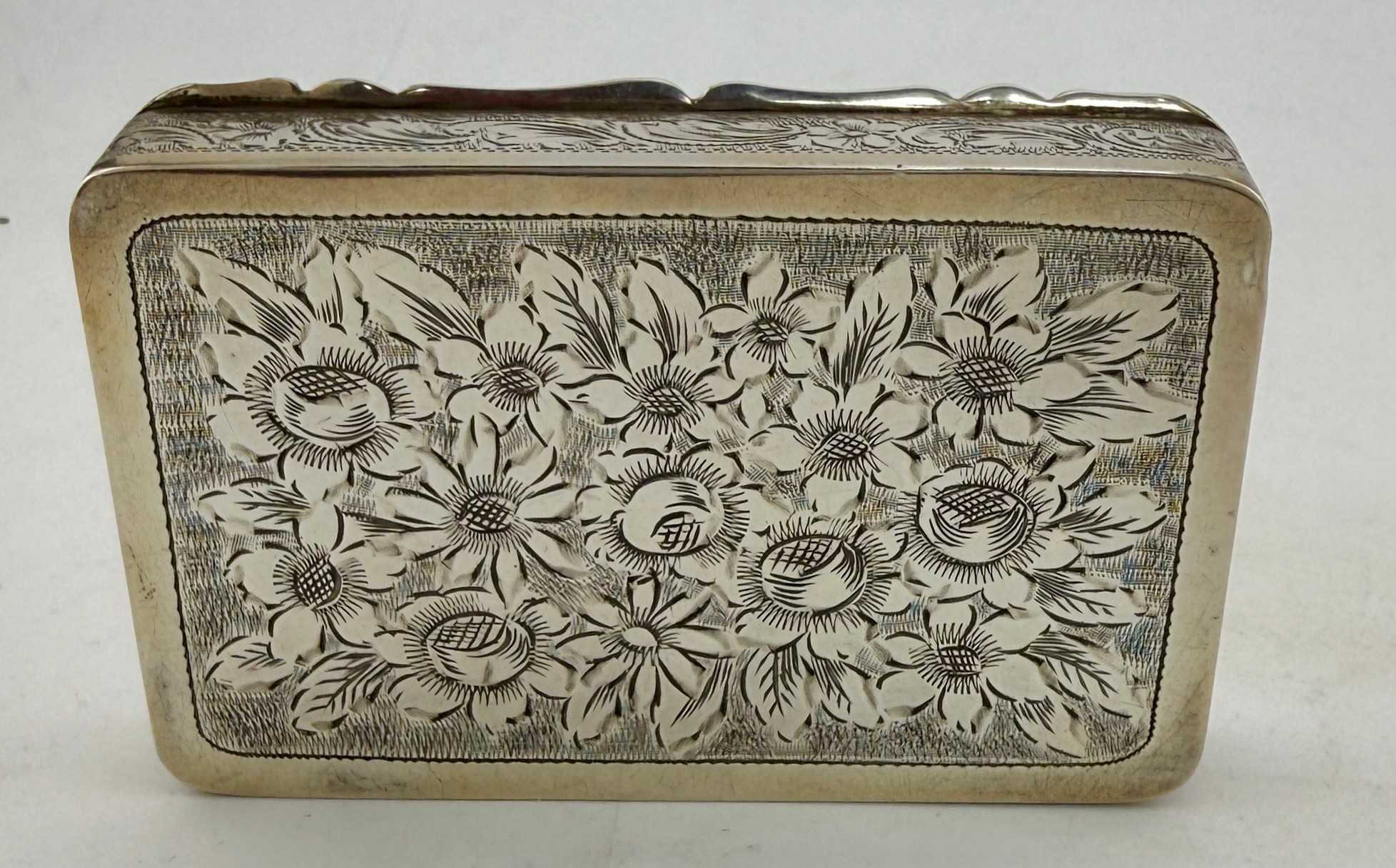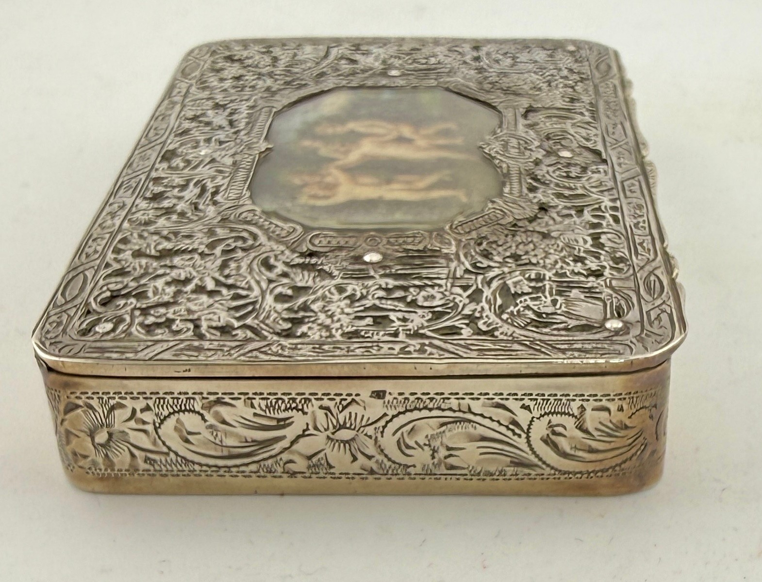 An Austro-Hungarian .800 white metal box with intricate filigree decoration with a hand painted panel depicting cherubs. Hallmarked for Pest, Hungary. Maker’s mark KT, Krausz Testverek. 9cm x 6cm x 1.5cm. Weight 119gm.