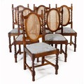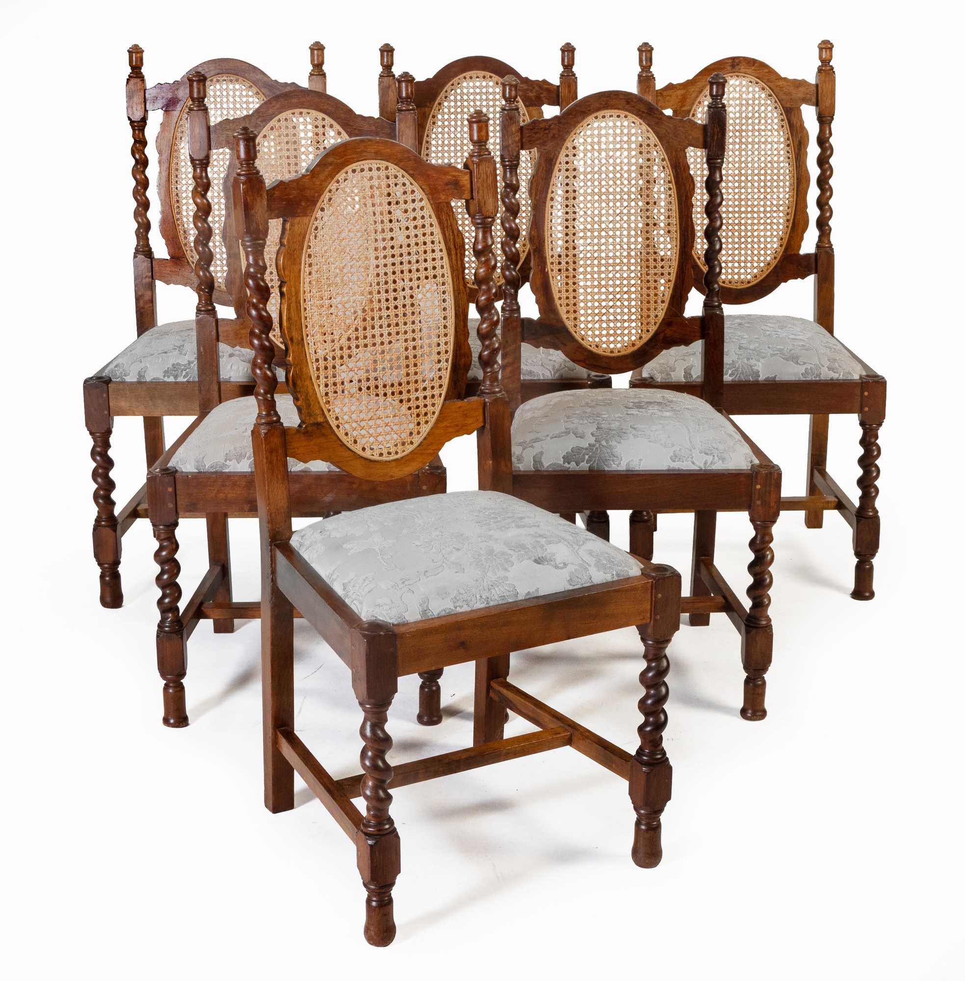 Each oval caned back flanked by barley-twist supports surmounted by finials, drop-in seat, on barley-twist legs, on block and turned feet joined by an H-stretcher, restorations