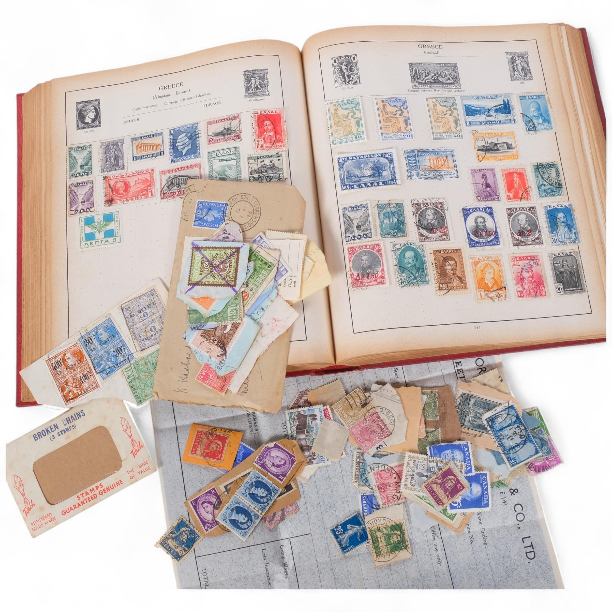 The Strand Stamp Album, stock book of UK and worldwide stamps, including examples for the Falkland Islands, Fiji, Greece, Gilbert & Ellice Islands, German and German Occupation, Spain, etc