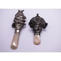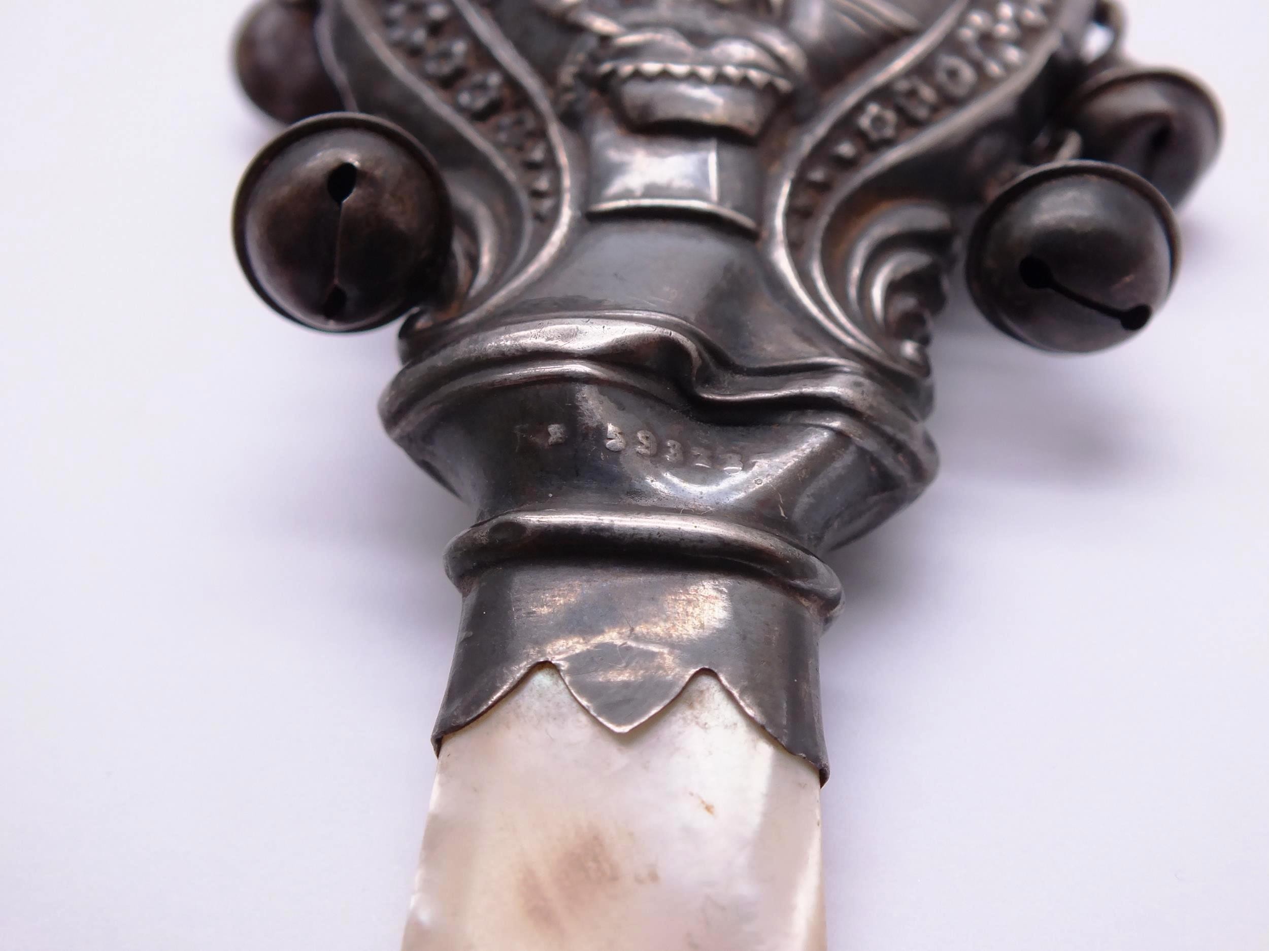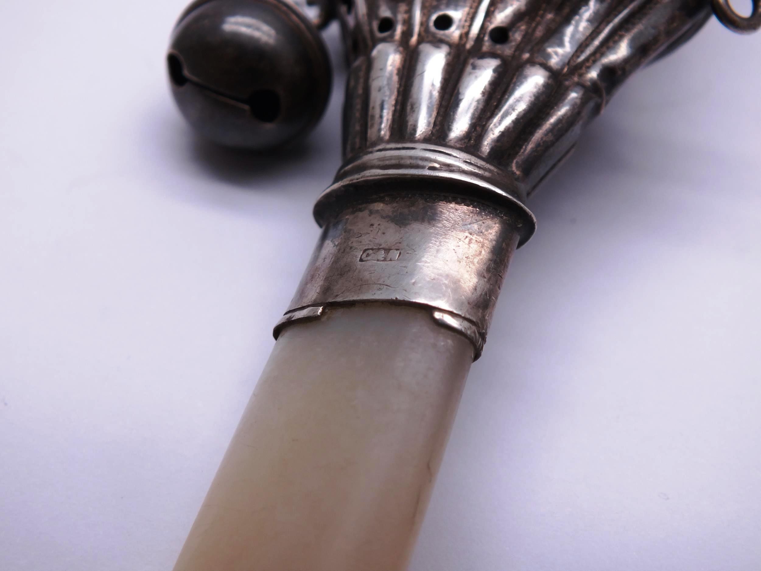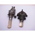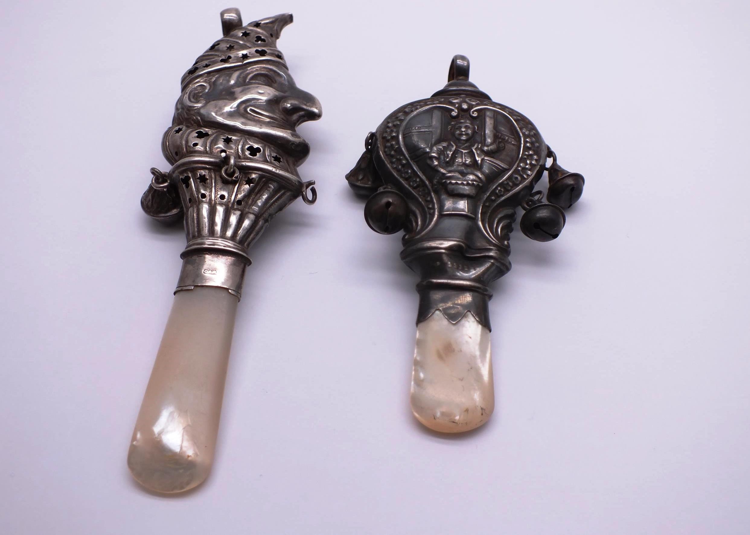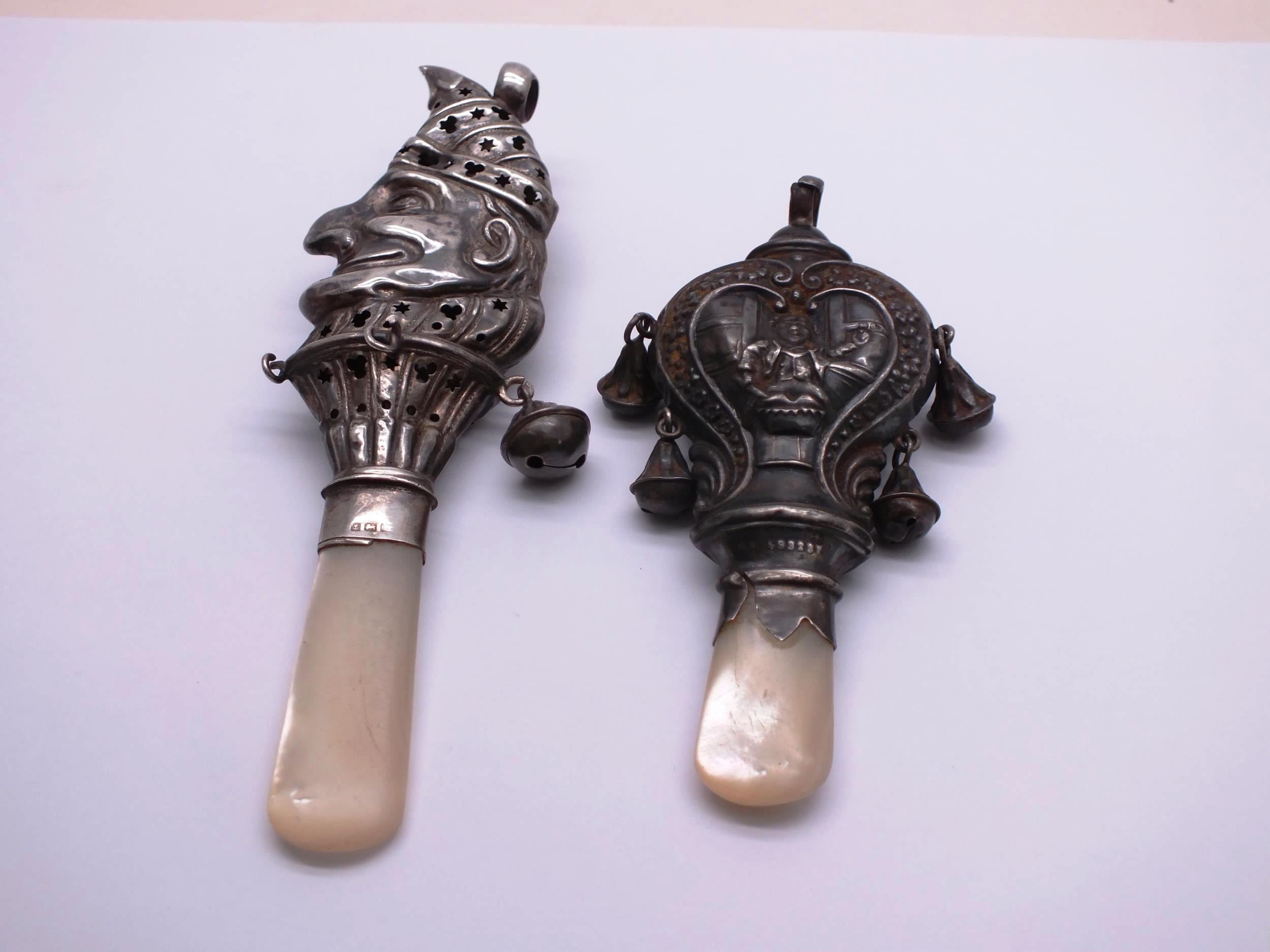 TWO STERLING SILVER & MOTHER OF PEARL BABY RATTLE/TEETHERS INCLUDES MR PUNCH