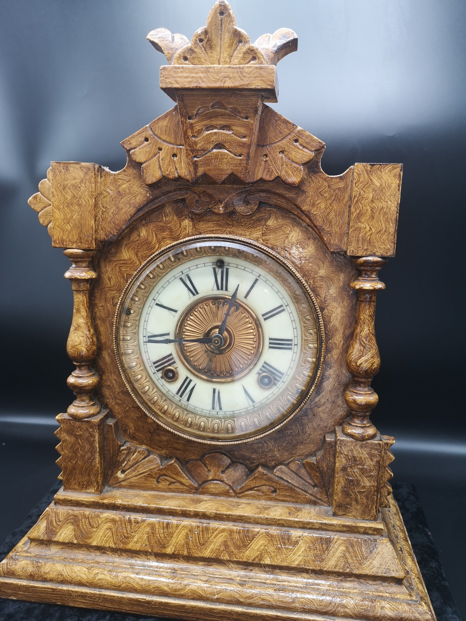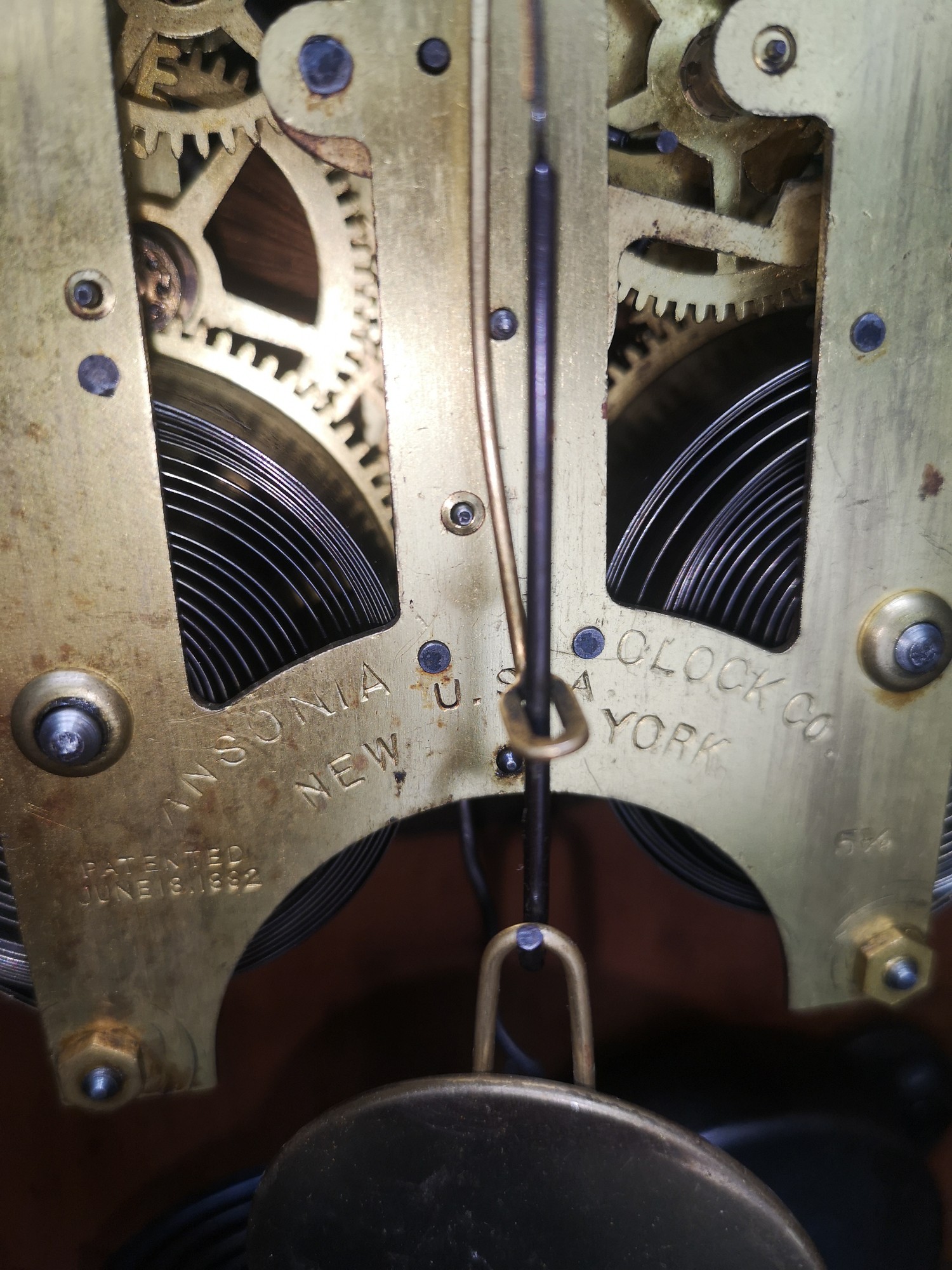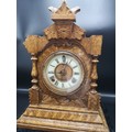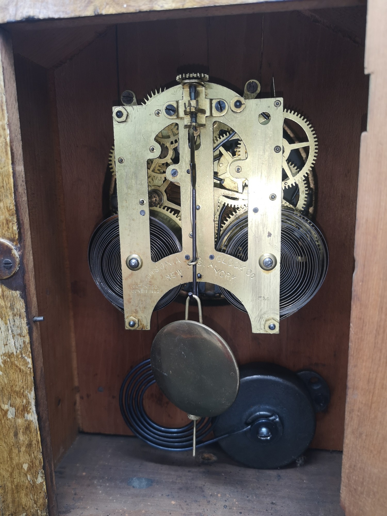 Sonia clock Co New York USA light oak mantle dated 18th June 1882 with pendulum.