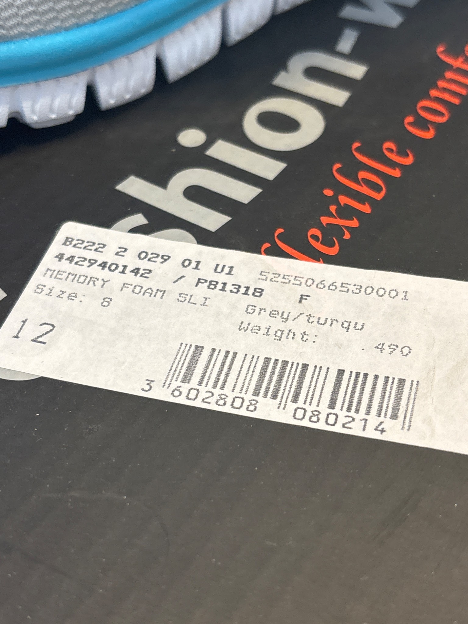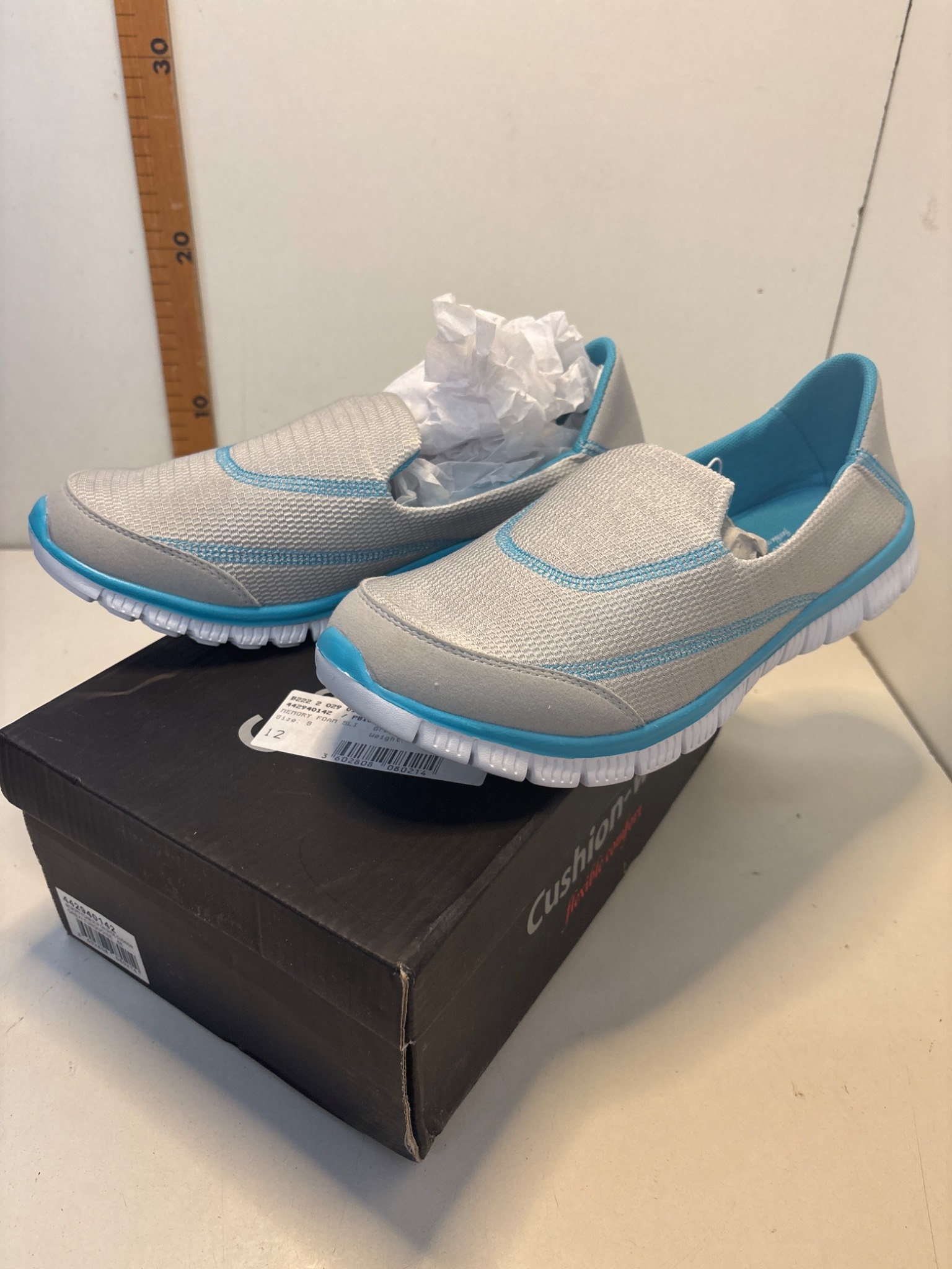 Women's size 8 gray and turquoise shoes by Cushions, featuring memory foam insoles for comfort. New in box.
