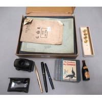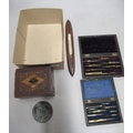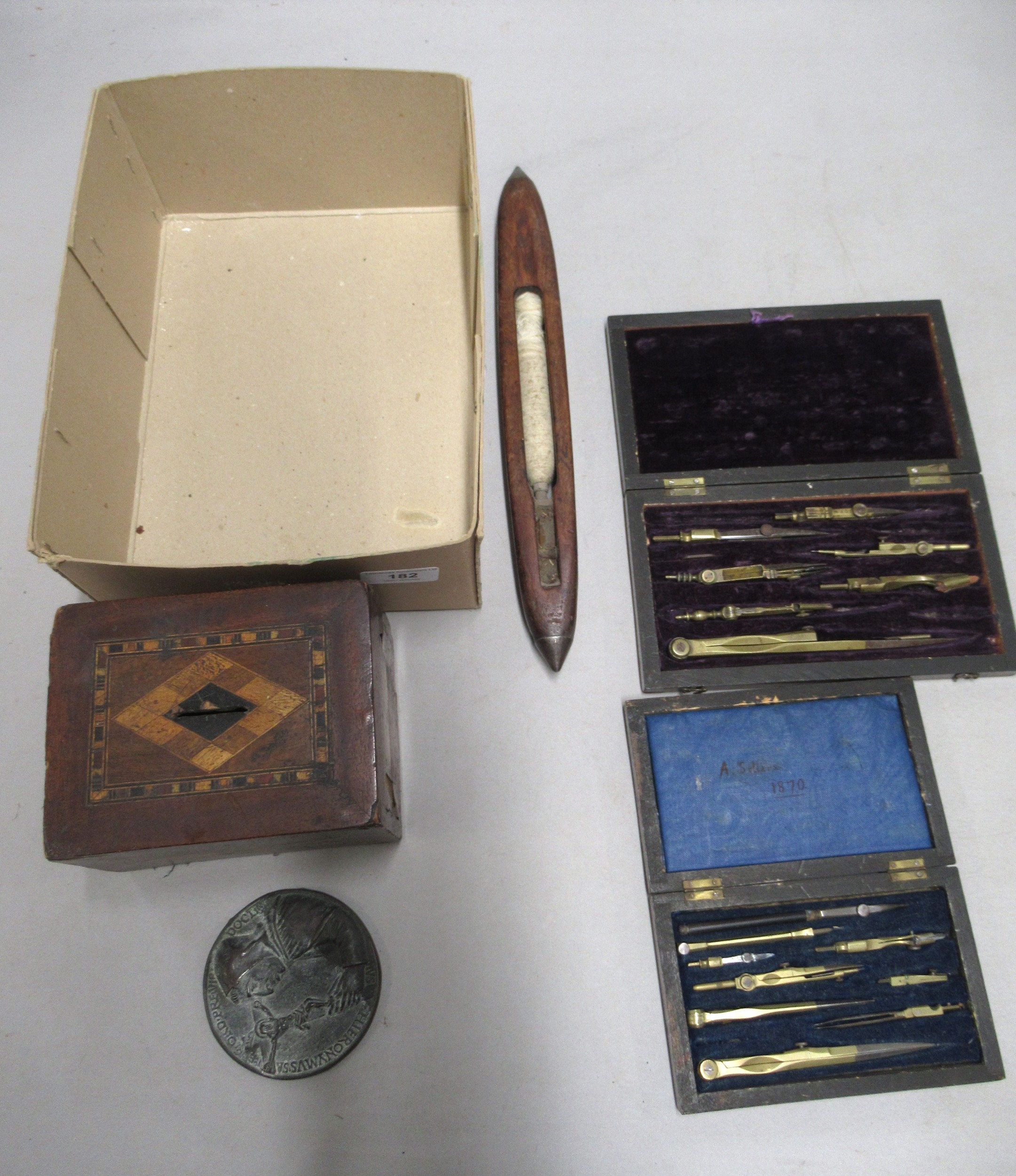 Two small 19th Century rosewood cased sets of drawing instruments, 19th Century shuttle bobbin, an antique money box and a reproduction medallion