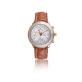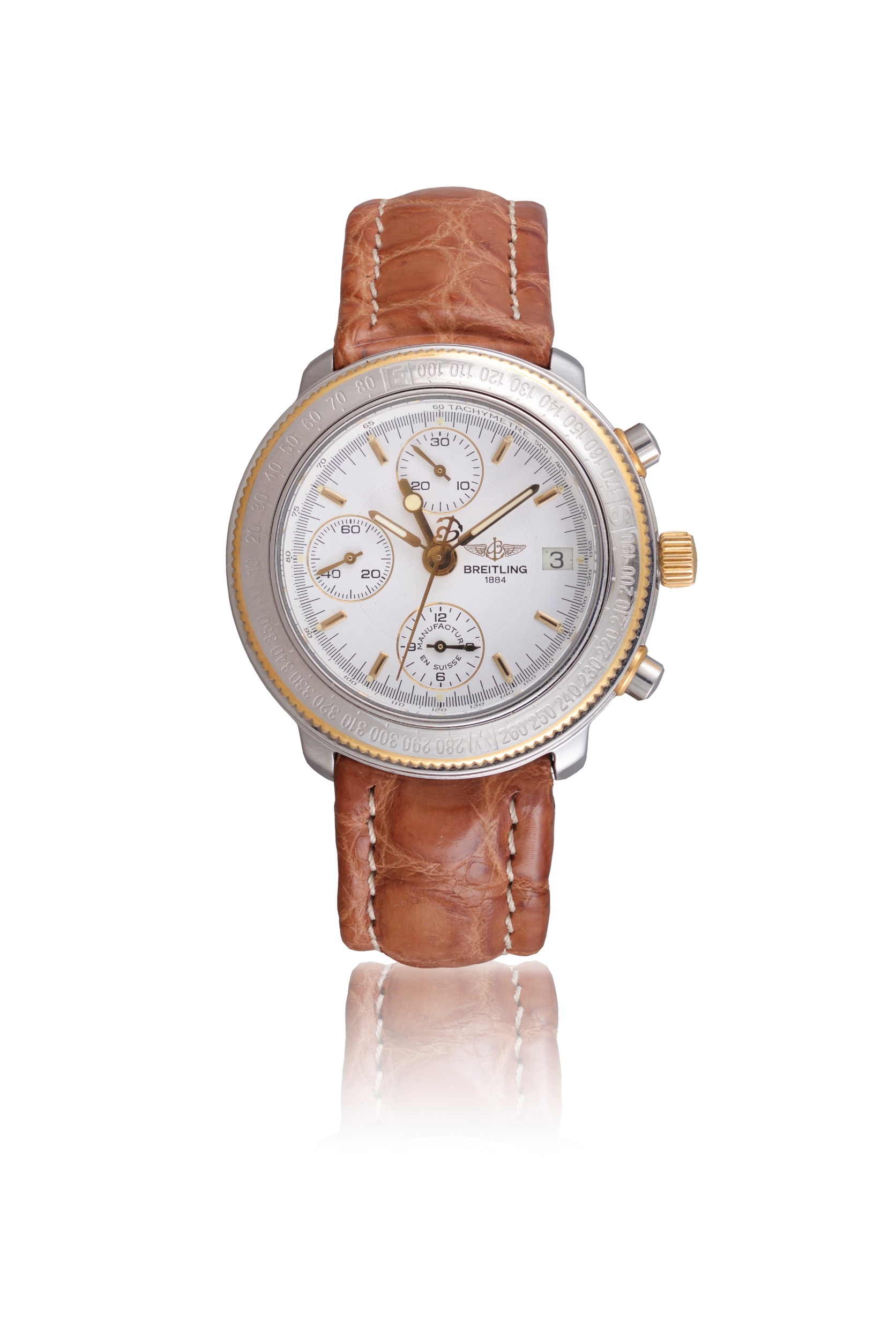BREITLING CHRONOGRAPH WRISTWATCH, REF. A20405 A stainless steel automatic chronograph wristwatch with date. Year: Circa 2000s Dial: White dial with applied baton hour markers, three subsidiary dials, outer tachymeter scale, date aperture at 3 o'clock Movement: Automatic chronograph, Breitling calibre 20 Case: Stainless steel case, case number 327 Diameter: 39 mm approx. Gross Weight: 91 g approx. Bracelet/Strap: Breitling brown leather strap with Breitling stainless steel folding clasp Accessories: Box and papers