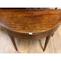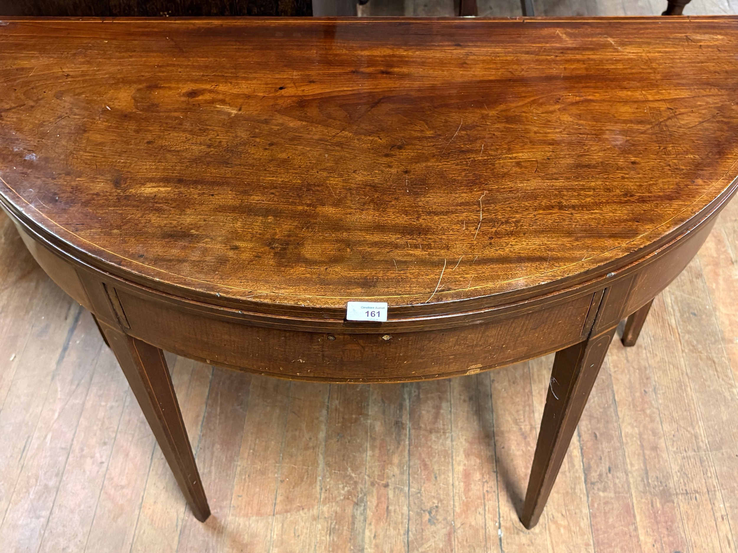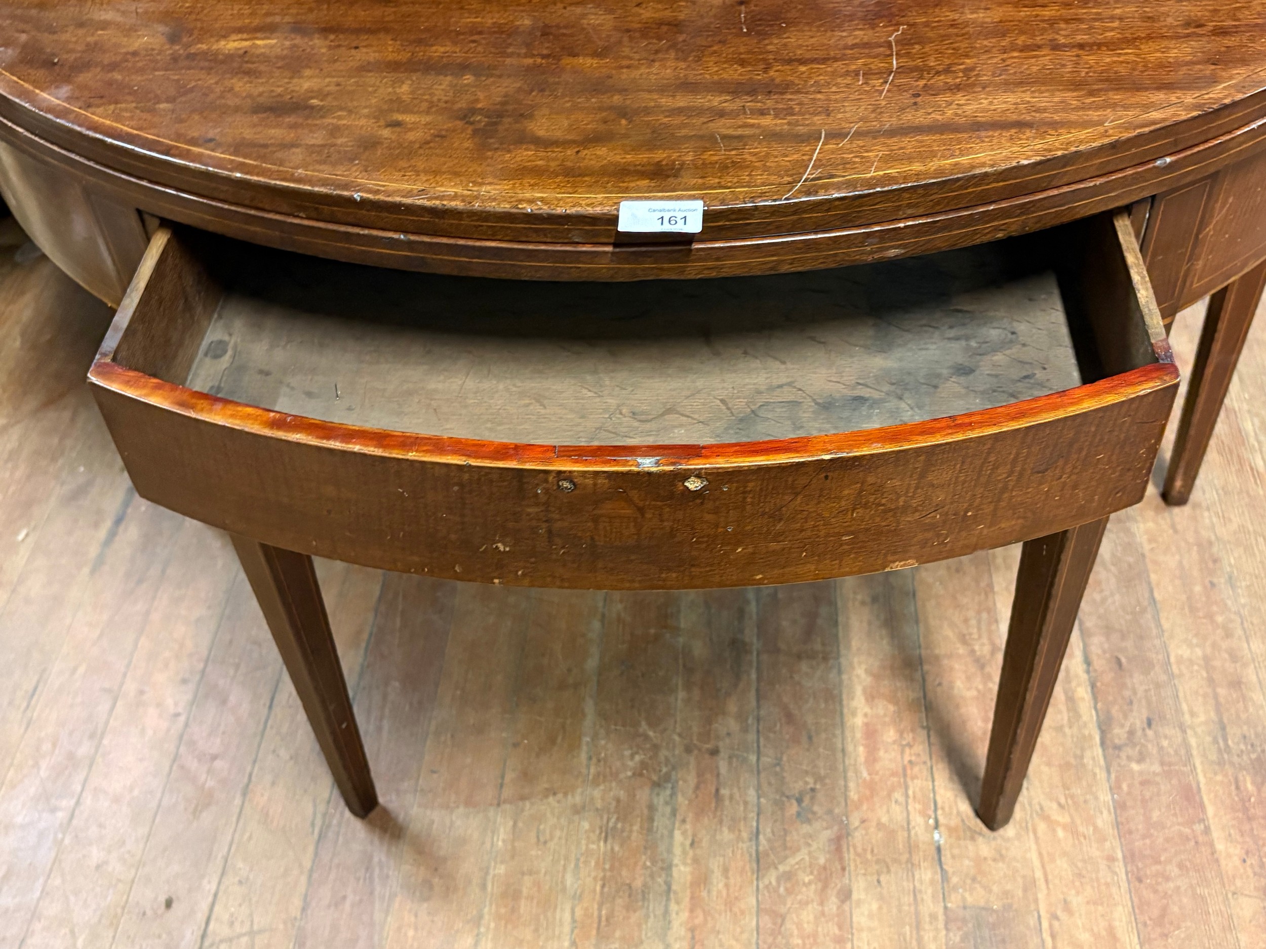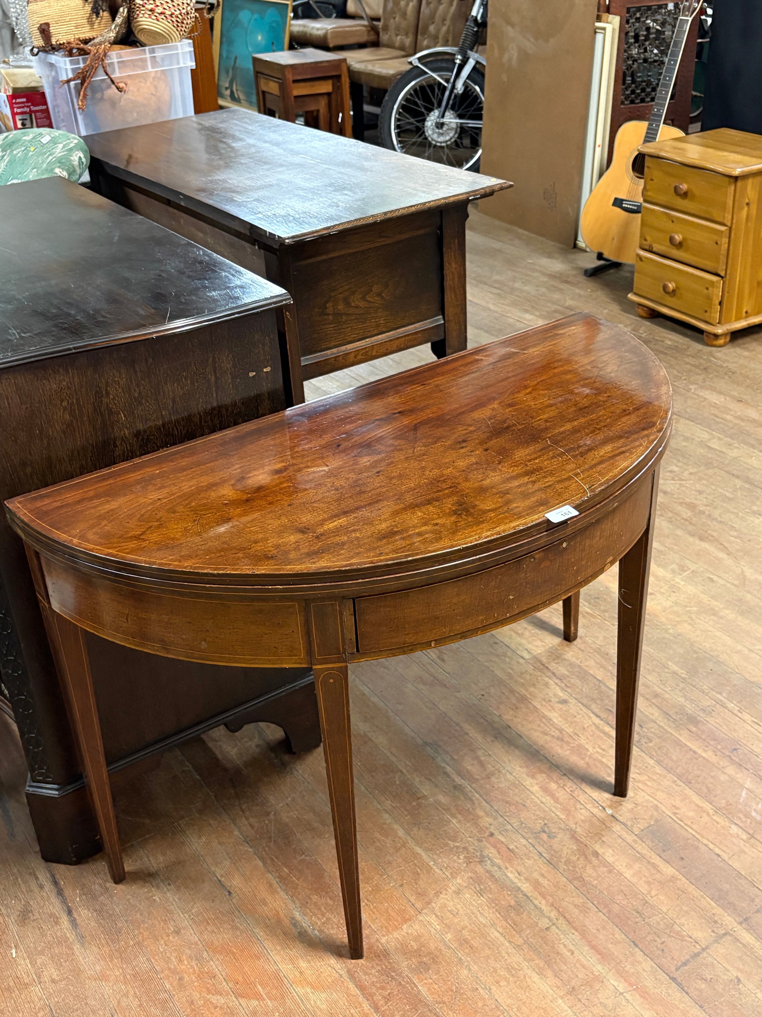 Victorian inlaid mahogany Demi Lune Sheraton style table with single drawer.