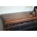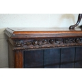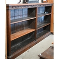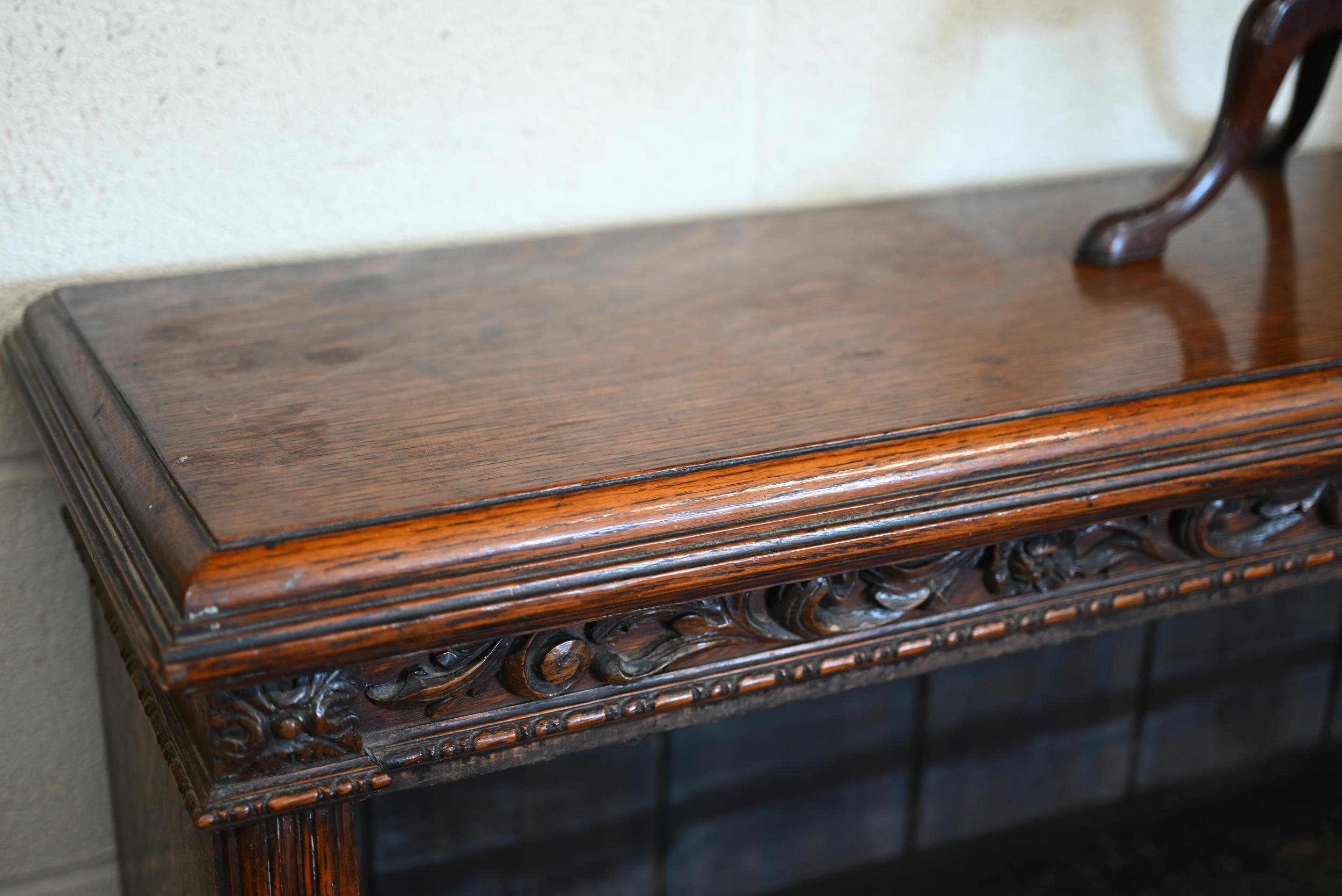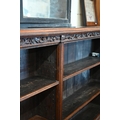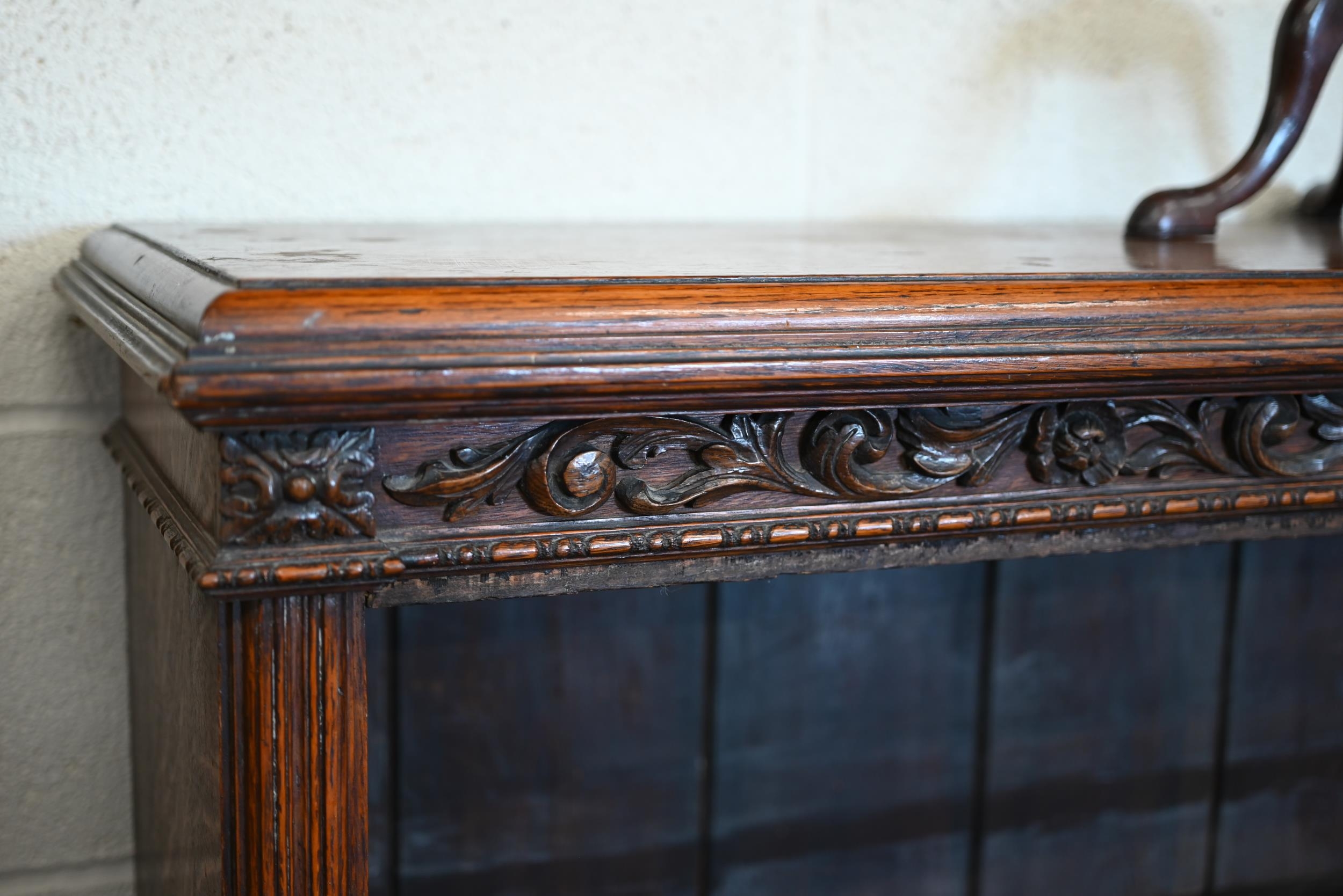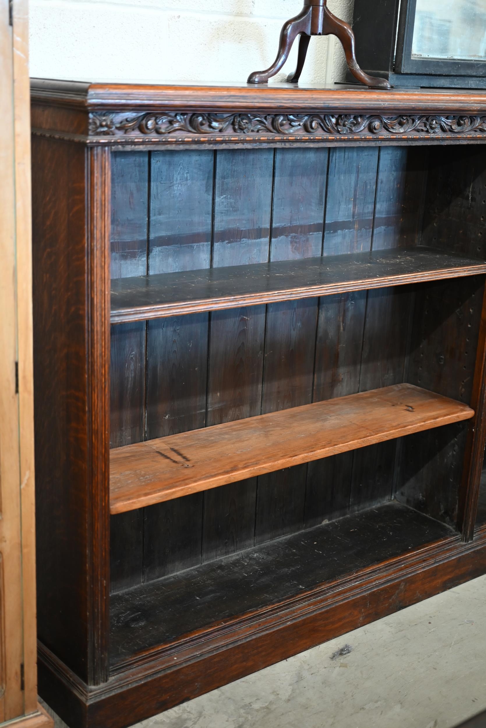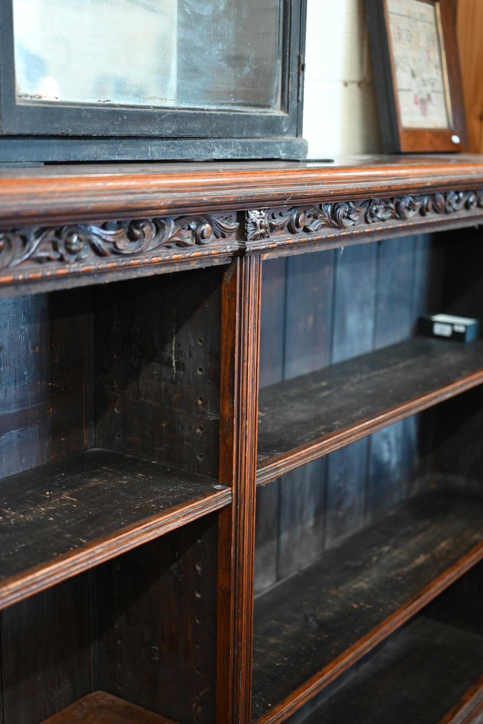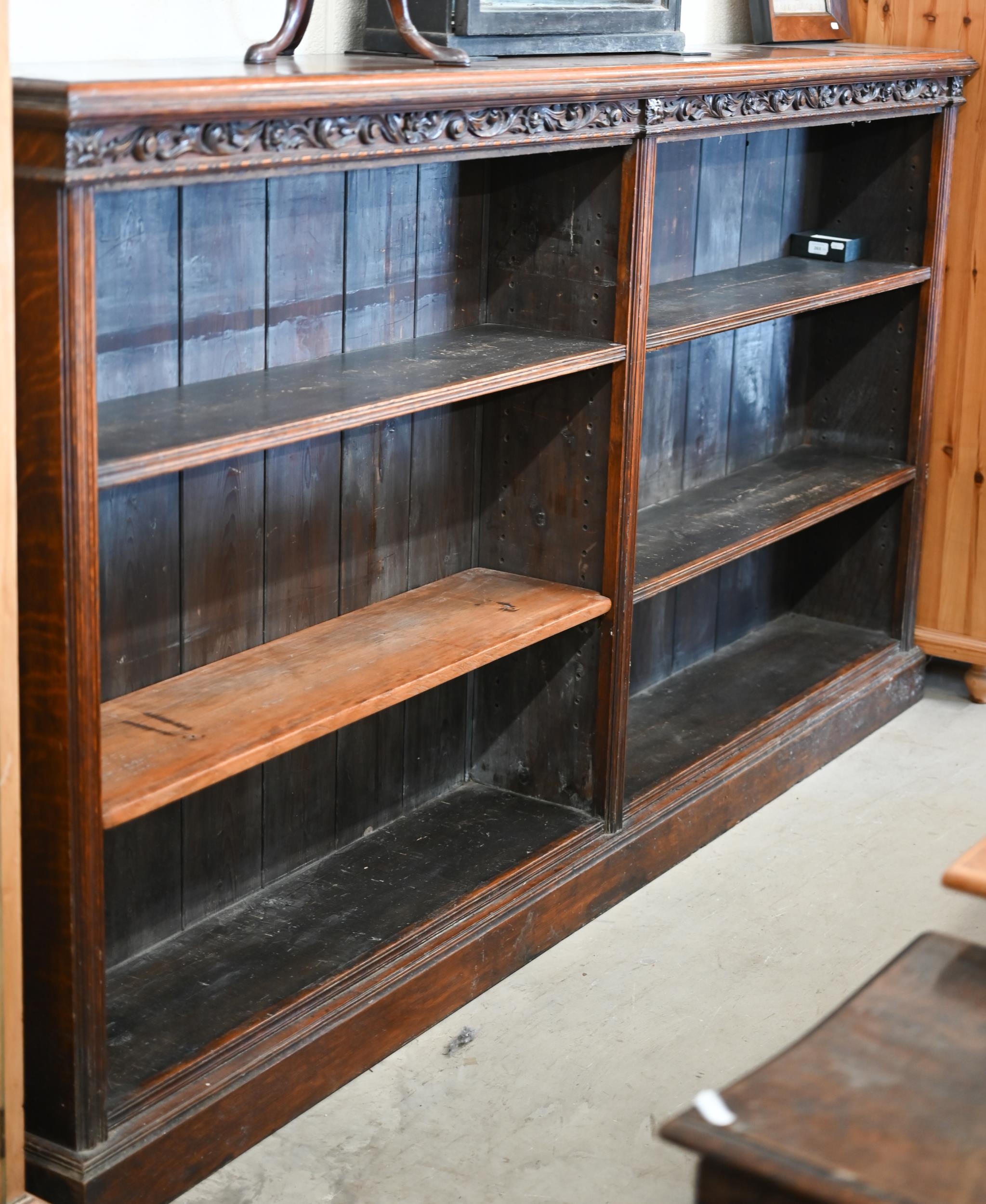 A large 19th century foliate-carved oak open bookcase with four adjustable shelves (one replacement), on plinth base, 228 x 34 x 122 cm high